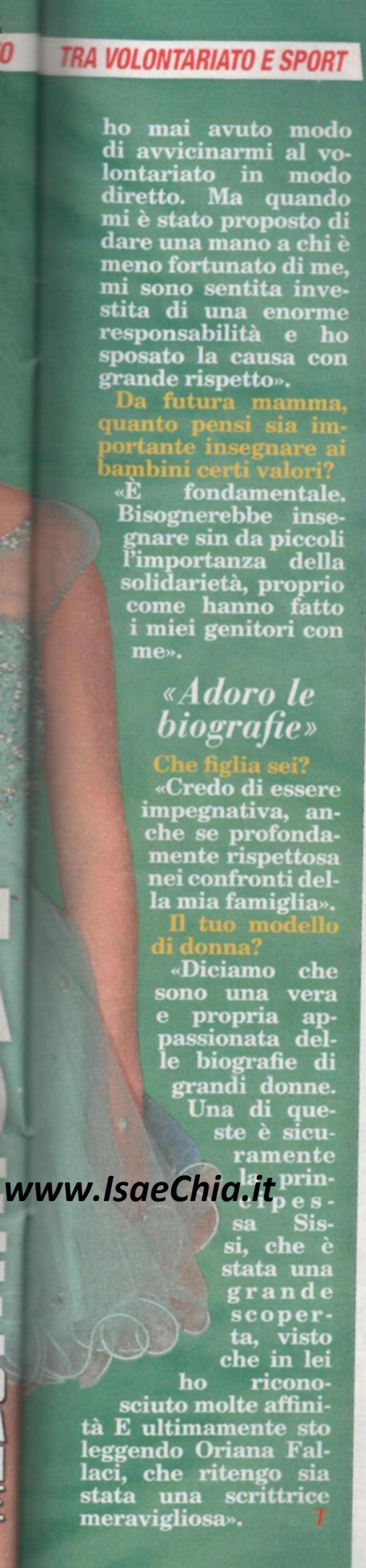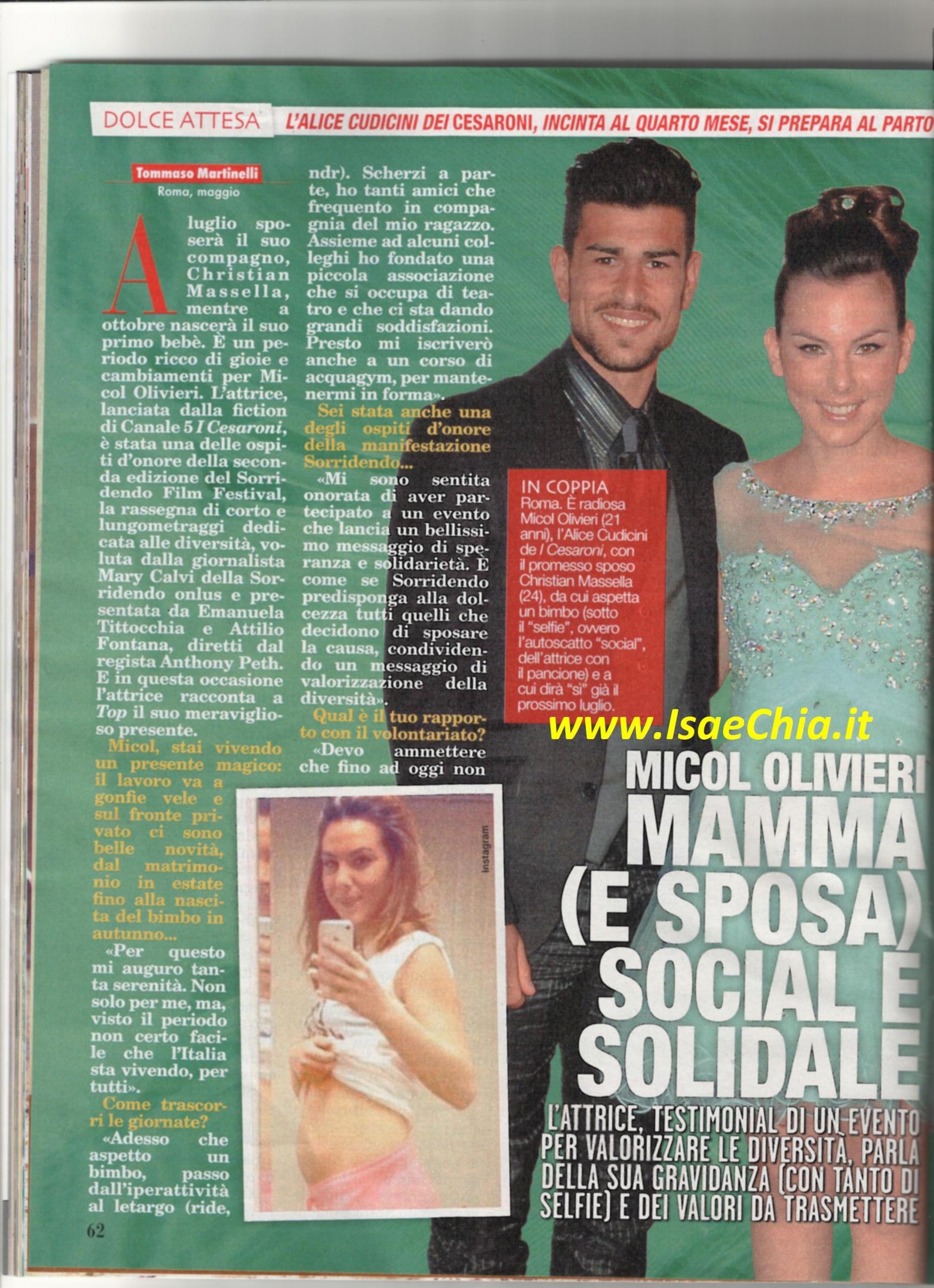 L’attrice Micol Olivieri, divenuta nota al grande pubblico per il ruolo di Alice interpretato ne I Cesaroni, sta per diventare mamma: “Adesso che sono in attesa, passo le giornate passando dall’iperattività al letargo! Scherzi a parte, ho tanti amici che frequento insieme al mio ragazzo. Assieme ad alcuni colleghi ho fondato un’associazione che si occupa di teatro e ci sta dando grandi soddisfazioni. Sono stata ospite della manifestazione Sorridendo e sono stata onorata di aver partecipato ad un evento che dà un messaggio di solidarietà. Fino ad oggi non avevo mai avuto modo di vivere in modo diretto il volontariato, ma quando mi è stato proposto di dare una mano a chi è meno fortunato di me, mi sono sentita un’enorme responsabilità e ho sposato la causa con grande affetto. Da futura mamma, penso che insegnare certi valori sia fondamentale e i miei lo hanno fatto con me. Sono una figlia impegnativa, anche se profondamente rispettosa della mia famiglia. I miei modelli di donna? La principessa Sissi e Oriana Fallaci“.