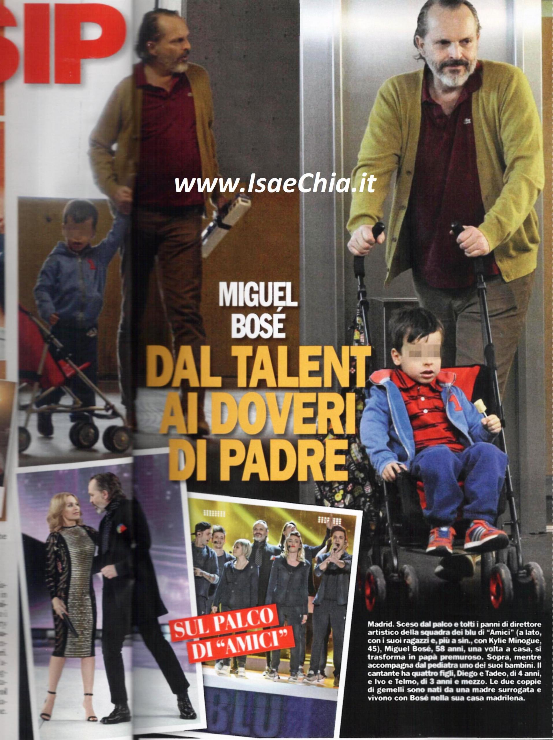 Miguel Bosé è anche quest’anno coach della Squadra blu di Amici. Ma una volta svestiti i panni da direttore artistico del talent, torna a fare il papà e vola a Madrid, dove ha ben quattro figli: Diego e Tadeo di 4 anni e Ivo e Telmo di 3 anni e mezzo. Le due coppie di gemelli sono nate da una madre surrogata e vivono con Bosé nella sua casa nella Capitale spagnola. Eccolo, infatti, in una delle rarissime foto con uno dei figli, che prima tiene per mano e poi porta in carrozzino, mentre va dal pediatra.