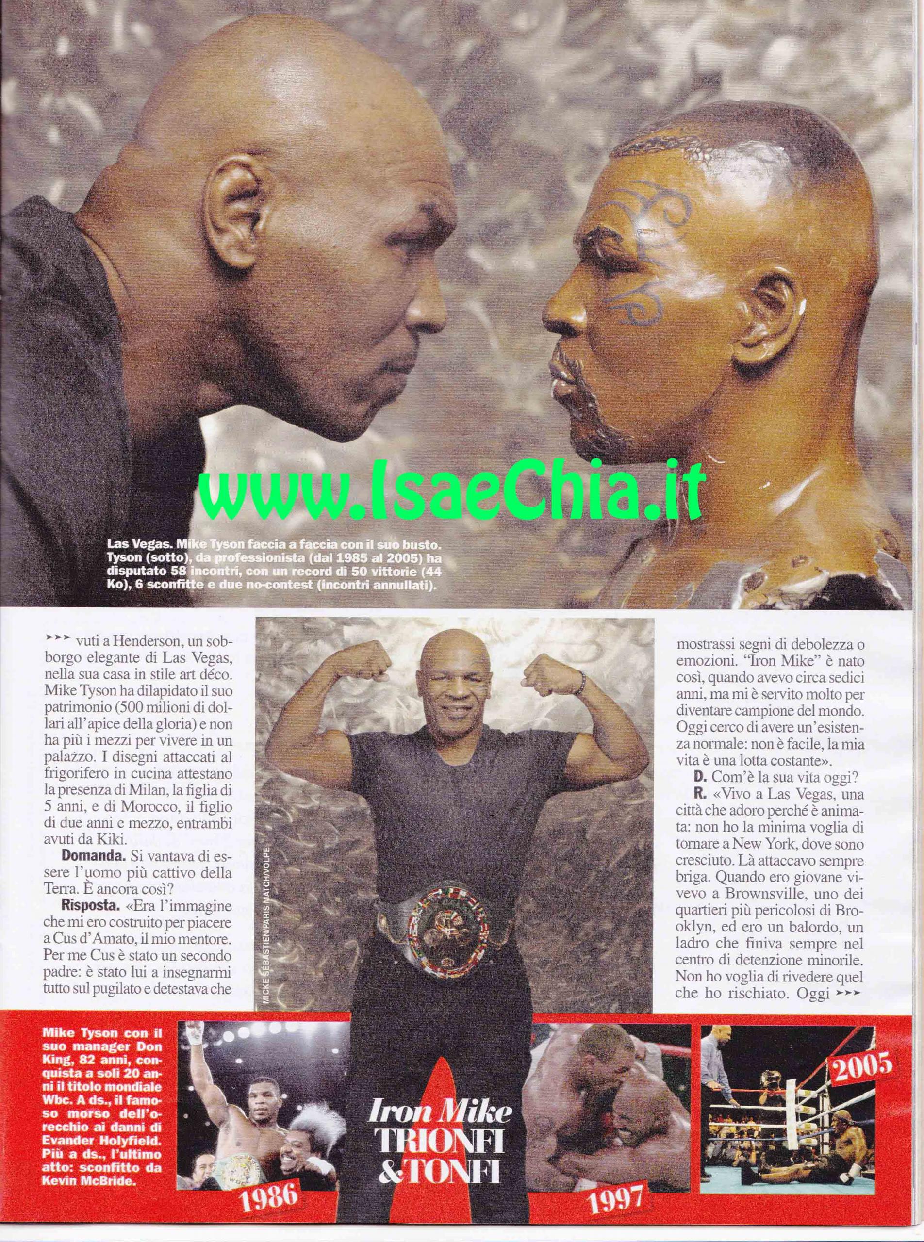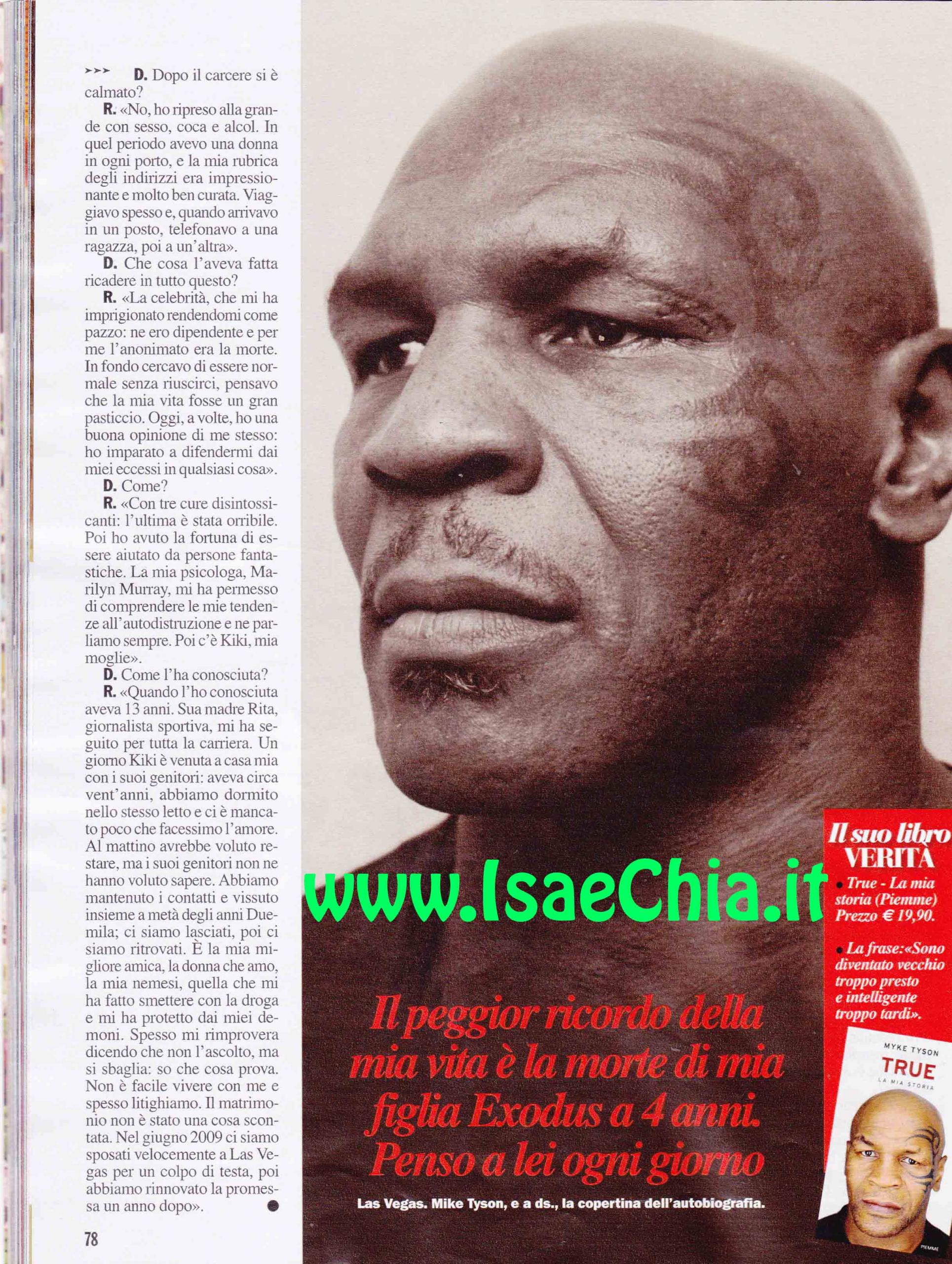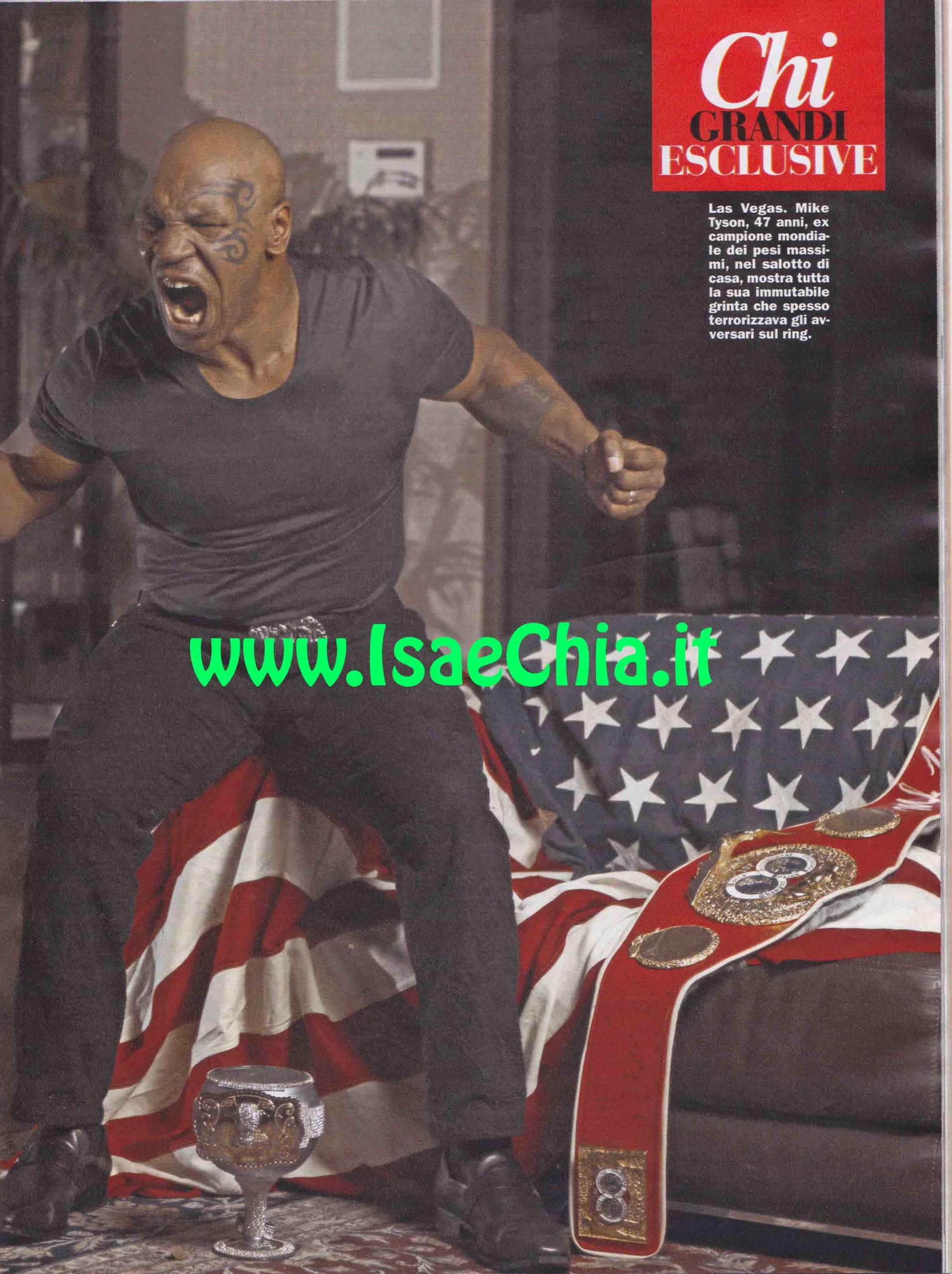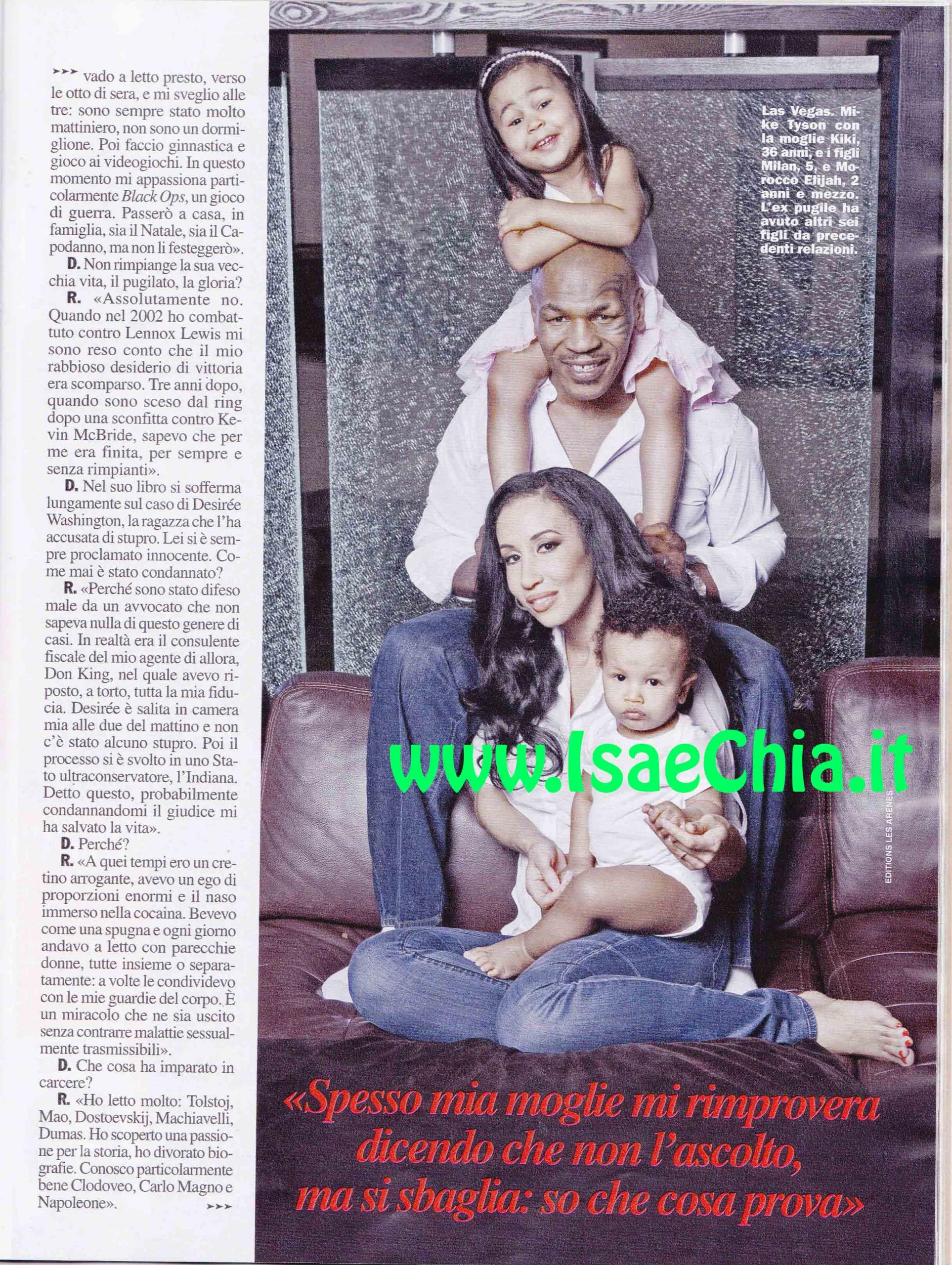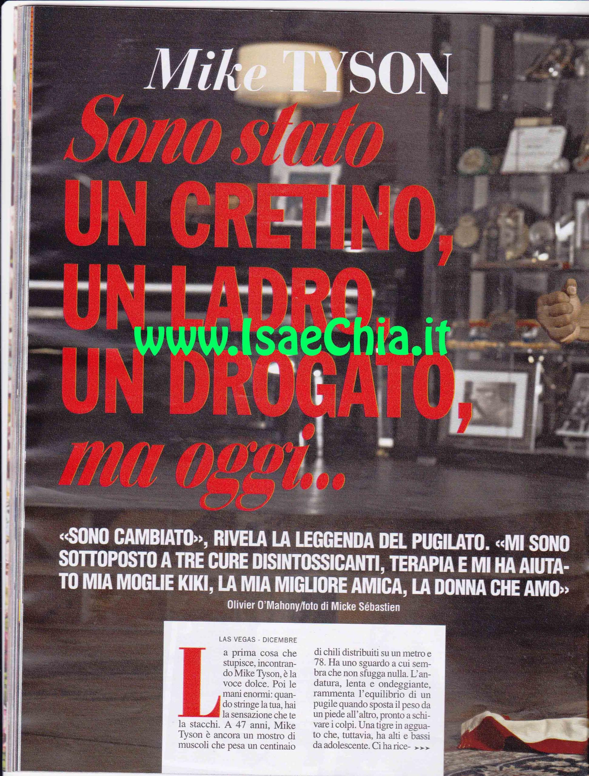 L’ex pugile Mike Tyson oggi ha 47 anni, ma è sempre quell’omaccione di 100 kg circa di muscoli su 1 metro e 78. La differenza è che prima si vantava di essere l’uomo più cattivo del mondo. Ora, invece, racconta: “Era l’immagine che mi ero costruito per piacere al mio mentore Cus D’Amato. Lui è stato un secondo padre per me e odiava che si mostrassero segni di debolezza. Oggi la mia vita è diversa: vivo a Las Vegas, città che adoro perché è animata. Non ho la minima voglia di tornare a New York, dove attaccavo sempre briga. Vivevo in uno dei quartieri più pericolosi di Brooklyn ed ero un balordo, un ladro che finiva sempre nel centro di detenzione minorile. Oggi vado a letto alle 8 di sera e mi sveglio alle 3 di mattina. Faccio ginnastica e gioco ai videogiochi. Non rimpiango il pugilato: quando nel 2002 ho combattuto contro Lennox Lewis mi sono reso conto che il mio desiderio di vittoria era scomparso”. Quando gli si chiede come mai è stato condannato per stupro nonostante lui si fosse sempre dichiarato innocente, risponde: “Sono stato difeso male da un avvocato che non sapeva nulla di questo genere di casi: era il mio consulente fiscale. La ragazza è salita alle 2 del mattino nella mia stanza e non c’è stato nessuno stupro. Inoltre era in uno Stato molto conservatore, l’Indiana. Forse però condannandomi il giudice mi ha salvato la vita: ero un cretino arrogante col naso immerso nella cocaina. Bevevo come una spugna e andavo a letto con diverse donne, insieme o separatamente. A volte le condividevo con le mie guardie del corpo ed è un miracolo che non abbia contratto malattie. In carcere ho letto molto, scoprendo la passione per la storia e le biografie. Dopo il carcere ho ripreso con alcol, coca e sesso. Ero dipendente dalla celebrità e l’anonimato per me era la morte. Cercavo di essere normale, ma non ci riuscivo. Poi, mi sono sottoposto a tre cure disintossicanti. L’ultima è stata orribile. Ed ho avuto la fortuna di essere aiutato dalla mia psicologa, che ha capito la mia tendenza all’autodistruzione, e da mia moglie Kiki. Quando l’ho conosciuta, aveva 13 anni. Sua madre era una giornalista sportiva che mi ha seguito per tutta la carriera. Una volta Kiki è venuta a casa mia coi suoi. Aveva circa 20 anni, abbiamo dormito nello stesso letto e ci è mancato poco che facessimo l’amore. Al mattino sarebbe voluta restare, ma i genitori non hanno voluto. Ci siamo lasciati, poi ci siamo ritrovati. E’ la mia migliore amica e la donna che amo. Mi ha fatto smettere con la droga. Spesso mi rimprovera che non l’ascolto, ma si sbaglia: so cosa prova. Non è facile vivere con me. Il matrimonio non è stato una cosa scontata: ci siamo sposati velocemente a Las Vegas nel 2009 per un colpo di testa, poi abbiamo rinnovato la promessa l’anno dopo”.