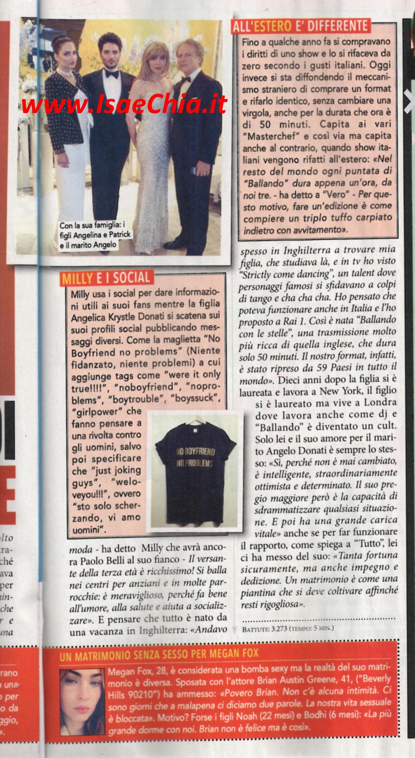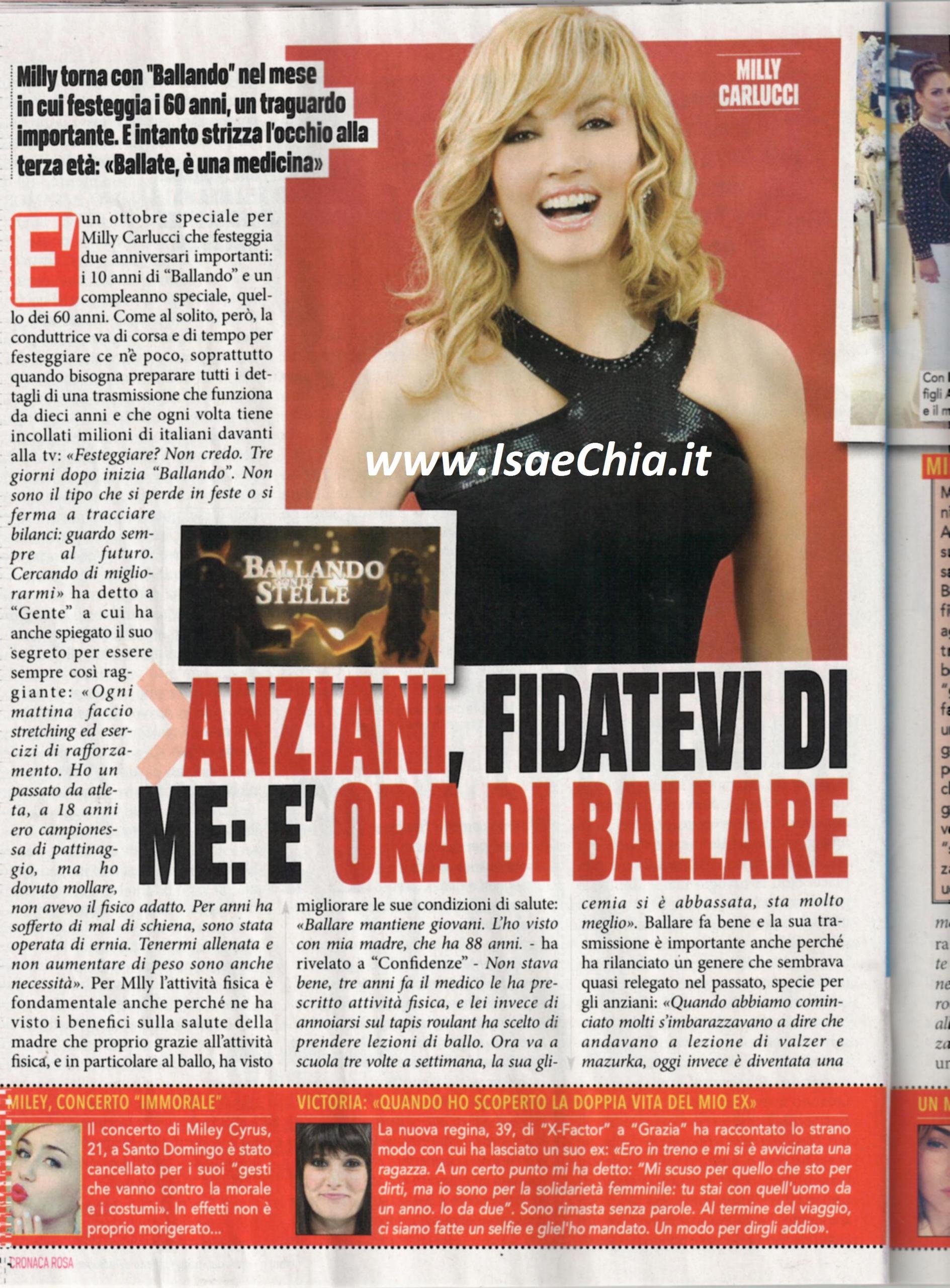 Per Milly Carlucci è un ottobre speciale: ha appena festeggiato 60 anni d’età e ha dato il via ieri sera all’edizione numero 10 di Ballando con le stelle. Ma per lei il tempo di festeggiare non c’è stato: “Festeggiare? Non credo. Tre giorni dopo il mio compleanno inizia Ballando” diceva lei proprio qualche giorno fa. “Non sono il tipo che si perde in feste o si ferma a tracciare bilanci, io guardo al futuro, cercando di migliorarmi”. E, data la sua forma fisica smagliante, si può dire che ci riesca: “Ogni mattina faccio stretching ed esercizi di rafforzamento. Ho un passato da atleta: a 18 anni ero campionessa di pattinaggio ma ho dovuto mollare perché non avevo il fisico adatto. Ho sofferto di mal di schiena, sono stata operata di ernia. Tenermi allenata e non aumentare di peso sono anche delle necessità. Ballare fa bene. Io l’ho potuto constatare con mia madre, che ha 88 anni. Il medico le ha prescritto attività fisica e lei, anziché annoiarsi sul tapis roulant, ha scelto di prendere lezioni di ballo. Ora che balla tre volte a settimana, la sua glicemia si è abbassata. Quando abbiamo lanciato il programma, molti si vergognavano di dire che facevano lezioni di valzer e polka. Oggi, invece, sembra tornato di moda!”. E pensare che tutto è nato da una vacanza in Inghilterra: “Ero andata a trovare mia figlia che studia lì e vidi in tv Strictly come dancing, il talent dove personaggi famosi si sfidano a colpi di cha cha cha e tango e ho pensato che potesse funzionare anche sulla Rai”. E così, il suo format, che dura più tempo di quello inglese, è stato ripreso in 59 paesi. Ma Milly in questi dieci anni non è mai cambiata, così come non è cambiato Angelo Donati, l’uomo che è al suo fianco: “Non è mai cambiato. E’ intelligente, straordinariamente ottimista e determinato. Il suo maggior pregio è la capacità di sdrammatizzare in ogni occasione. Il segreto del nostro matrimonio? Tanta fortuna, ma anche impegno e dedizione: il matrimonio è come una piantina da coltivare affinché resti rigogliosa”.