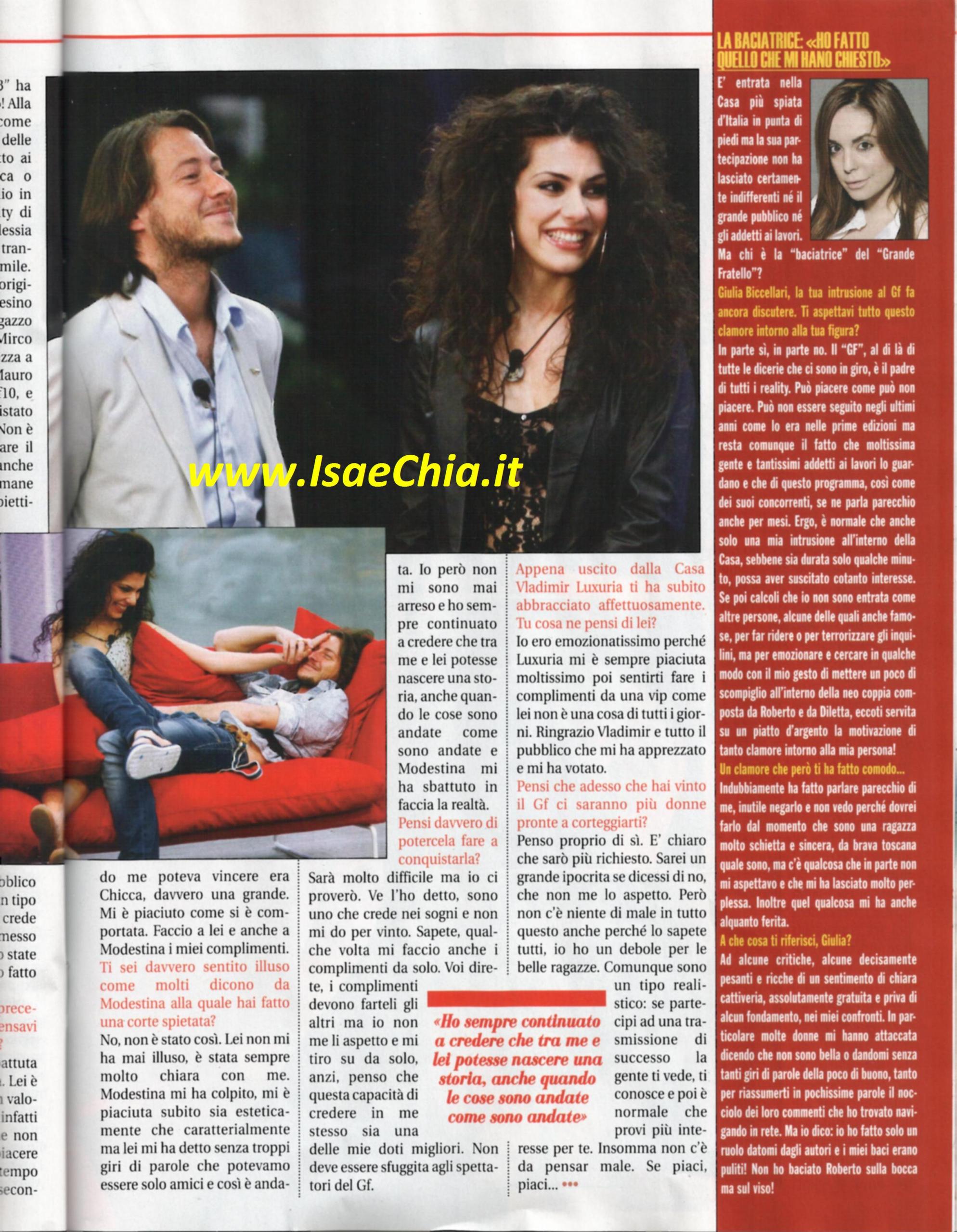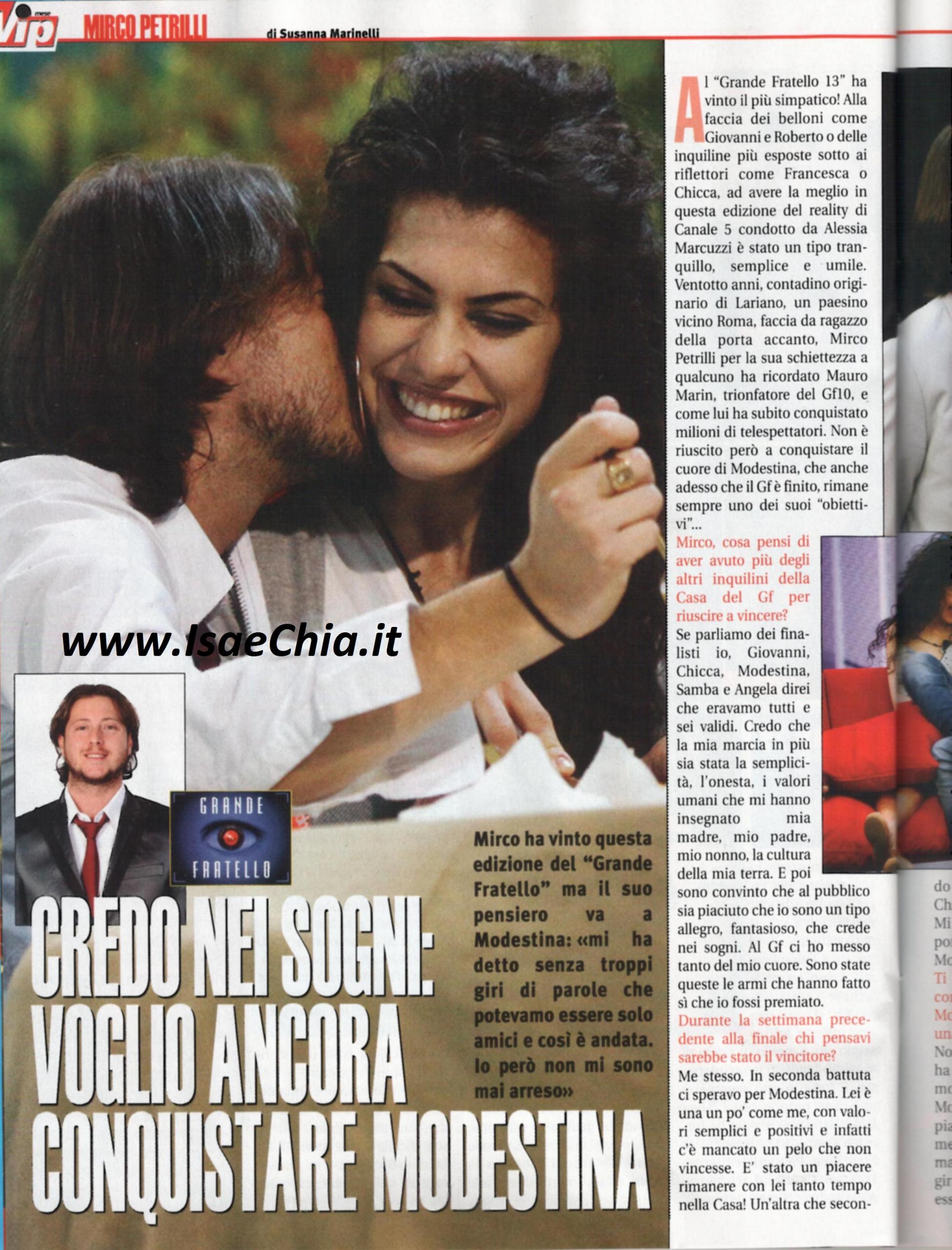 Ad un mese dalla fine del Grande fratello 13, dal quale è uscito vincitore, Mirco Petrilli dichiara di pensare ancora all’ex coinquilina Modestina Cicero: “Modestina mi ha colpito, mi è piaciuta subito sia esteticamente che caratterialmente, ma non mi ha mai illuso. Mi ha detto subito, senza giri di parole, che potevamo essere solo amici e così è andata. Io però non mi sono mai arreso e ho continuato a credere che tra noi ci potesse essere una storia, anche quando lei mi ha sbattuto in faccia la realtà. Sarà molto difficile conquistarla, ma io ci proverò. Sono uno che crede nei sogni e non si dà per vinto. A volte mi faccio i complimenti da solo e penso che questa capacità di credere in me stesso sia una delle mie doti migliori. Non deve essere sfuggita agli spettatori del GF! Pensavo che avrei vinto il Grande fratello, ma in seconda battuta ci speravo per Modestina: lei è un po’ come me, con valori semplici e positivi. Un’altra che per me poteva vincere era Chicca Rocco, davvero una grande. Mi è piaciuto come si è comportata nella Casa. Alla mia uscita, Vladimir Luxuria mi ha fatto i complimenti ed io ero emozionatissimo perché mi è sempre piaciuta tantissimo e sentirti fare i complimenti da una vip non è una cosa da tutti i giorni”. Infine, quando gli si chiede se crede che ci saranno più donne a corteggiarlo, ora che ha vinto il Grande fratello, risponde: “E’ chiaro che sarò più richiesto, sarei ipocrita a dire di no. Non c’è niente di male in questo, perché, lo sapete, io ho un debole per le belle ragazze! Se partecipi a un programma tv, il pubblico ti vede ed è normale che la gente provi più interesse per te: se piaci, piaci…!”