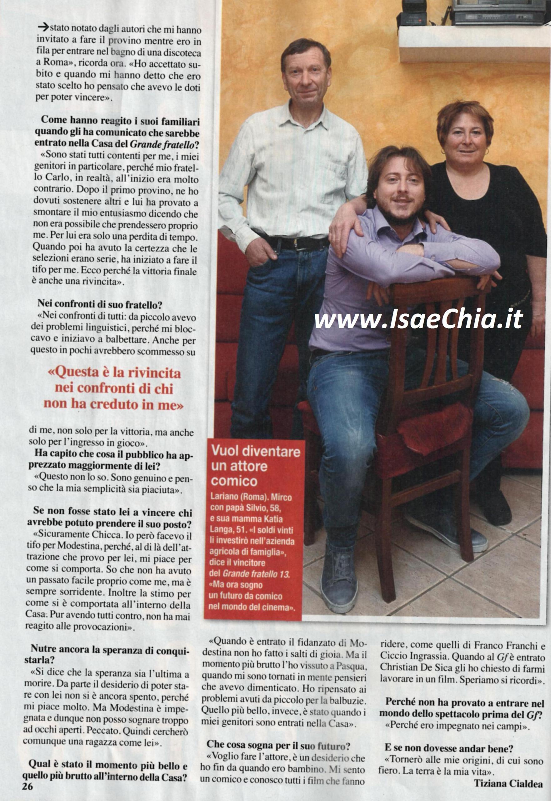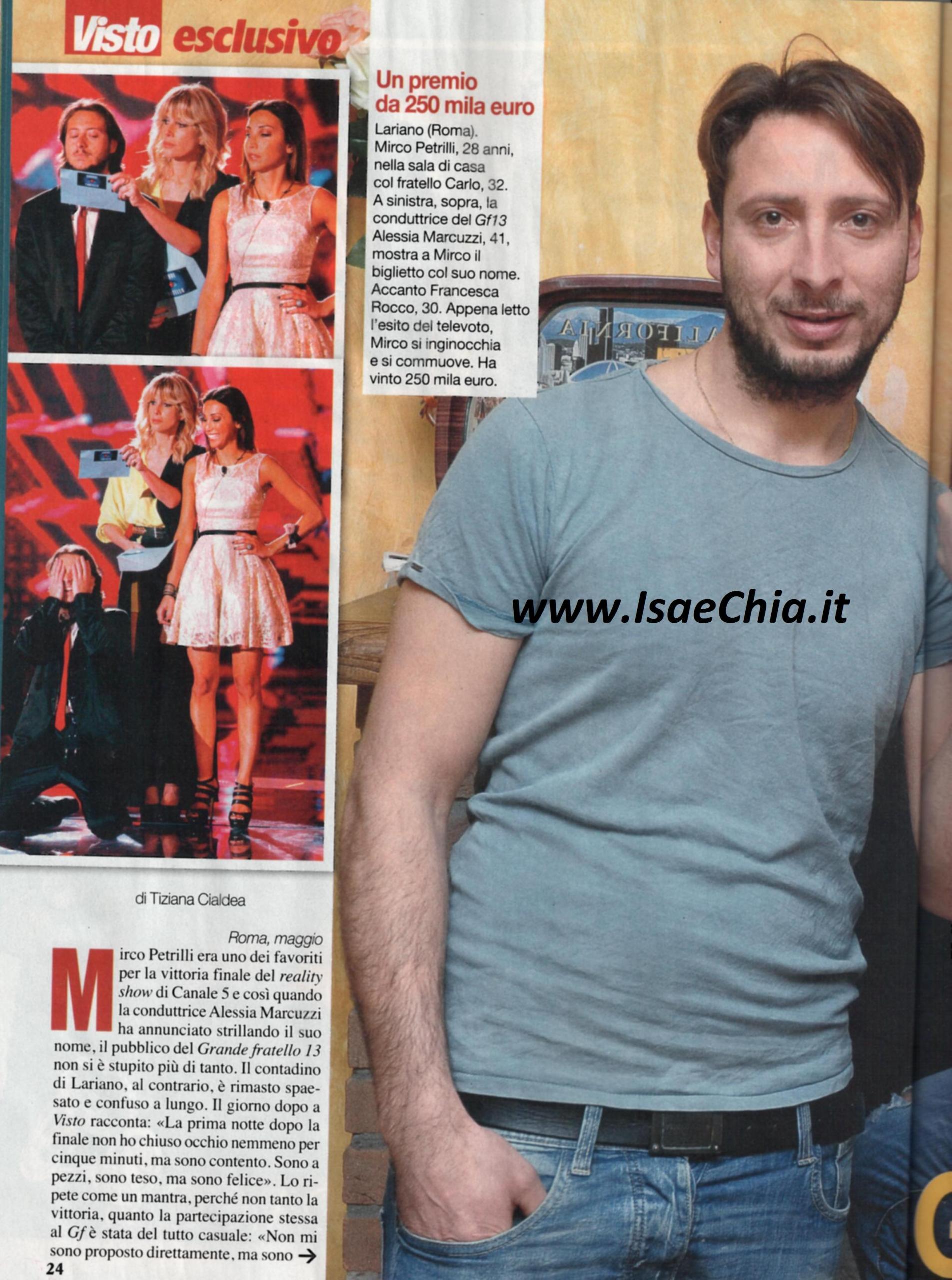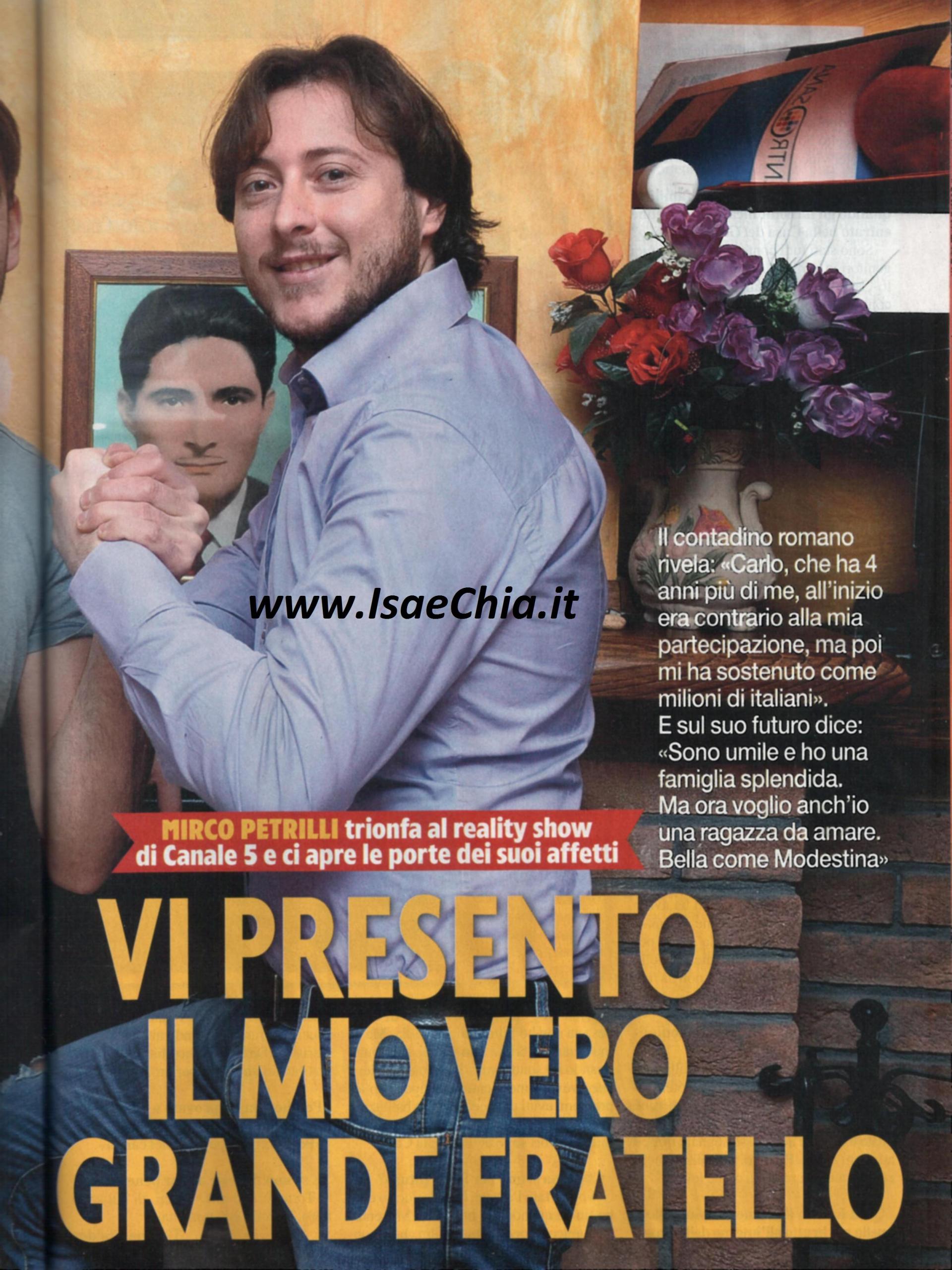 Mirco Petrilli ha vinto la tredicesima edizione del Grande fratello, e adesso, ad una settimana dalla vittoria, racconta: “La prima notte non ho chiuso occhio, nemmeno per cinque minuti, ma sono contento. Sono a pezzi, sono teso, ma sono contento”. E pensare che la sua partecipazione al reality è stata casuale: “Non mi sono proposto direttamente, ma sono stato notato dagli autori mentre ero in fila per il bagno in discoteca! Ho accettato subito e mi hanno detto che avevo le doti per poter vincere. I miei familiari sono stati tutti contenti, tranne mio fratello Carlo, di quattro anni più grande, che era contrario. Dopo il primo provino ne ho dovuti sostenere altri, e lui provava a smontare il mio entusiasmo, dicendo che non era possibile che prendessero me, che era una perdita di tempo. Quando ha saputo che le selezioni erano finite, ha iniziato a fare il tifo per me. Ecco perché la mia vittoria è una rivincita, nei suoi confronti, ma non solo, ma di tutti: da piccolo venivo preso in giro perché balbettavo. Se non avessi vinto io, sicuramente avrebbe vinto Chicca Rocco, ma io facevo il tifo per Modestina Cicero, perché al di là della mia attrazione, mi piace per come si comporta: non ha avuto un passato facile, ma è sempre sorridente. Anche in Casa, pur avendo tutti contro, non ha reagito alle provocazioni. Da parte mia il desiderio di star con lei non si è spento, ma lei è impegnata. Peccato, cercherò una ragazza come lei. Quando è entrato il suo fidanzato, non ho fatto i salti di gioia, ma il momento più brutto l’ho vissuto a Pasqua, perché mi sono venuti in mente pensieri che avevo dimenticato e i problemi che avevo da piccolo con la balbuzie. Io voglio fare l’attore, è un desiderio che ho fin da bambino. Mi sento un comico e conosco tutti i film che fanno ridere e quando è venuto nella Casa, ho chiesto a Christian De Sica di farmi recitare. Speriamo se ne ricordi! Se non dovesse andare bene, tornerò alle mie origini: la terra è la mia vita”.