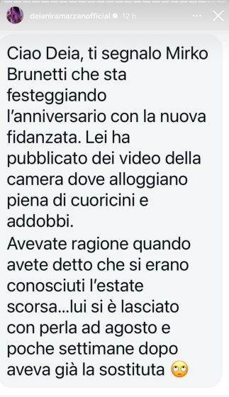 Ciao Deia, ti segnalo Mirko Brunetti che sta festeggiando l’anniversario con la nuova fidanzata. Lei ha pubblicato dei video della camera dove alloggiano piena di cuoricini e addobbi. Avevate ragione quando avete detto che si erano conosciuti l’estate scorsa…lui si è lasciato con Perla ad agosto e poche settimane dopo aveva già la sostituta.