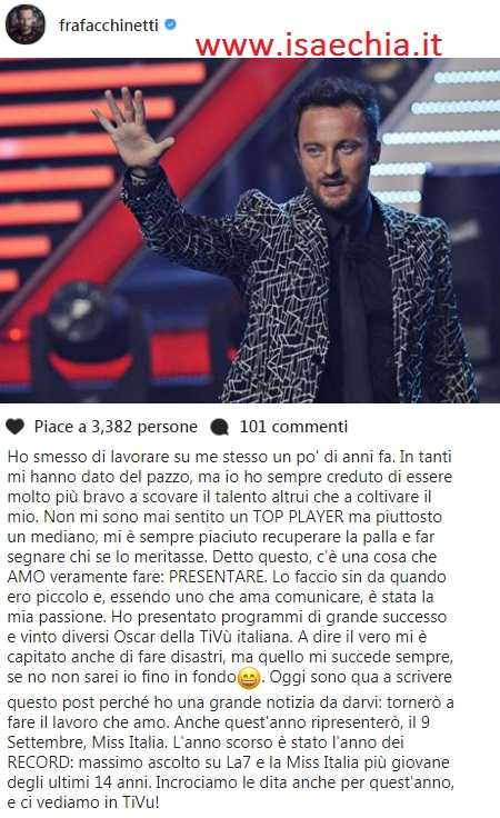 L’anno scorso con Francesco Facchinetti alla conduzione, l’evento è risultato il più visto dai giovani degli ultimi 15 anni, nonché la più seguita sui social. Per il secondo anno consecutivo, quindi, a condurre su La7 la serata finale del concorso, giunto ormai alla sua 78esima edizione, è stato riconfermato proprio il 37enne, come ha annunciato lui stesso poche ore fa: