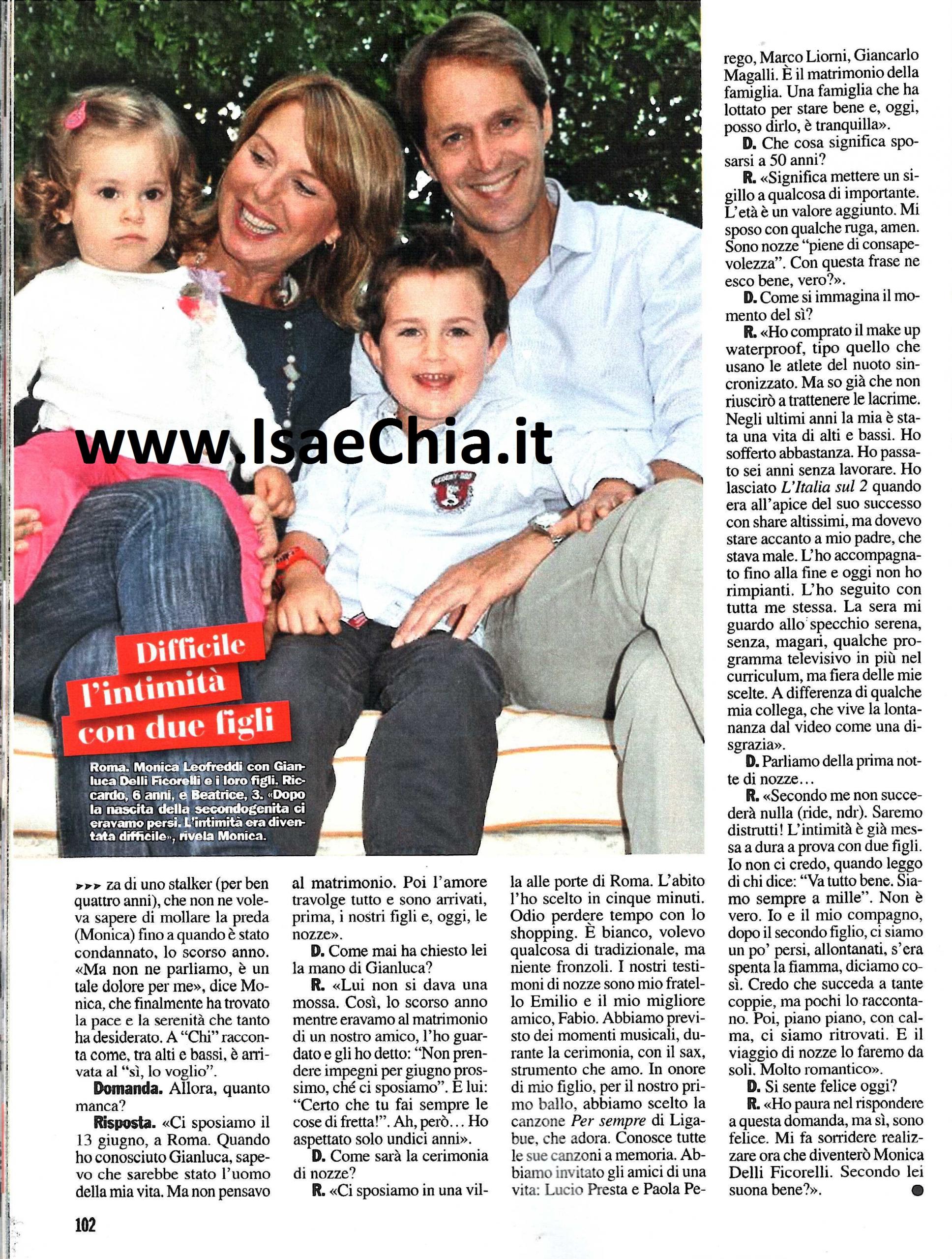 Dopo un periodo difficile nella sua vita, in cui ci sono state la perdita di suo padre e uno stalker che l’ha molestata per quattro anni, Monica Leofreddi è tornata in tv alla conduzione di Torto o ragione – La macchina della verità. Ma soprattutto, tra meno di una settimana, sposerà Gianluca Delli Ficorelli, padre dei suoi due figli Riccardo e Beatrice. “Ci sposiamo il 13 giugno a Roma. Quando l’ho conosciuto, sapevo che sarebbe stato l’uomo della mia vita. Ma non pensavo al matrimonio. Poi l’amore travolge tutto e sono arrivati prima i nostri figli e oggi le nozze. Lui non si dava una mossa. Così lo scorso anno, mentre eravamo al matrimonio di un amico, l’ho guardato e gli ho detto: ‘Non prendere impegni per il prossimo giugno, ché ci sposiamo’. E lui: ‘Certo che tu hai sempre le cose di fretta!’. Ah però, ho aspettato solo 11 anni!“. Quando le si chiede come sarà la cerimonia, la conduttrice risponde: “Ci sposiamo in una villa alle porte di Roma. L’abito l’ho scelto in 5 minuti. Odio perdere tempo con lo shopping. E’ bianco, volevo qualcosa di tradizionale, niente fronzoli. I nostri testimoni sono mio fratello e il mio migliore amico. Abbiamo previsto dei momenti musicali con il sax e in onore di mio figlio abbiamo scelto Per sempre di Ligabue per il nostro primo ballo, perché lo adora. Abbiamo invitato gli amici di una vita: Paola Perego e Lucio Presta, Marco Liorni, Giancarlo Magalli. Ho comprato il make-up waterproof, quello che usano le atlete del nuoto sincronizzato: so già che non riuscirò a trattenere le lacrime! Negli ultimi anni la mia è stata una vita di alti e bassi: ho passato sei anni senza lavorare, ho lasciato L’Italia sul 2 quando era all’apice del successo, ma dovevo stare accanto a mio padre, che stava male. L’ho accompagnato fino alla fine e l’ho seguito con tutta me stessa. La sera mi guardo allo specchio serena, magari con qualche programma tv in meno sul curriculum, ma fiera delle mie scelte. A differenza di qualche mia collega, che vive la lontananza dal video come una disgrazia“. Quando le si chiede cosa significa sposarsi a 50 anni e come sarà la prima notte di nozze, risponde: “Significa mettere un sigillo a qualcosa di importante. L’età è un valore aggiunto. Mi sposo con qualche ruga, amen. Sono nozze piene di consapevolezza. La prima notte? Non succederà nulla: saremo distrutti! L’intimità è già messa alla prova con i figli! Io non ci credo quando leggo chi dice: ‘Va tutto bene, siamo sempre a mille!’. Io e il mio compagno, dopo il secondo figlio, ci siamo un po’ persi, allontanati, s’era spenta la fiamma. Credo che succeda a tante coppie, ma pochi lo raccontano. Poi, piano piano, con calma, ci siamo ritrovati. E il viaggio di nozze lo faremo da soli. Molto romantico. Se sono felice? Ho paura di rispondere a questa domanda, ma sì, lo sono. Mi fa sorridere pensare che diventerò Monica Delli Ficorelli“.