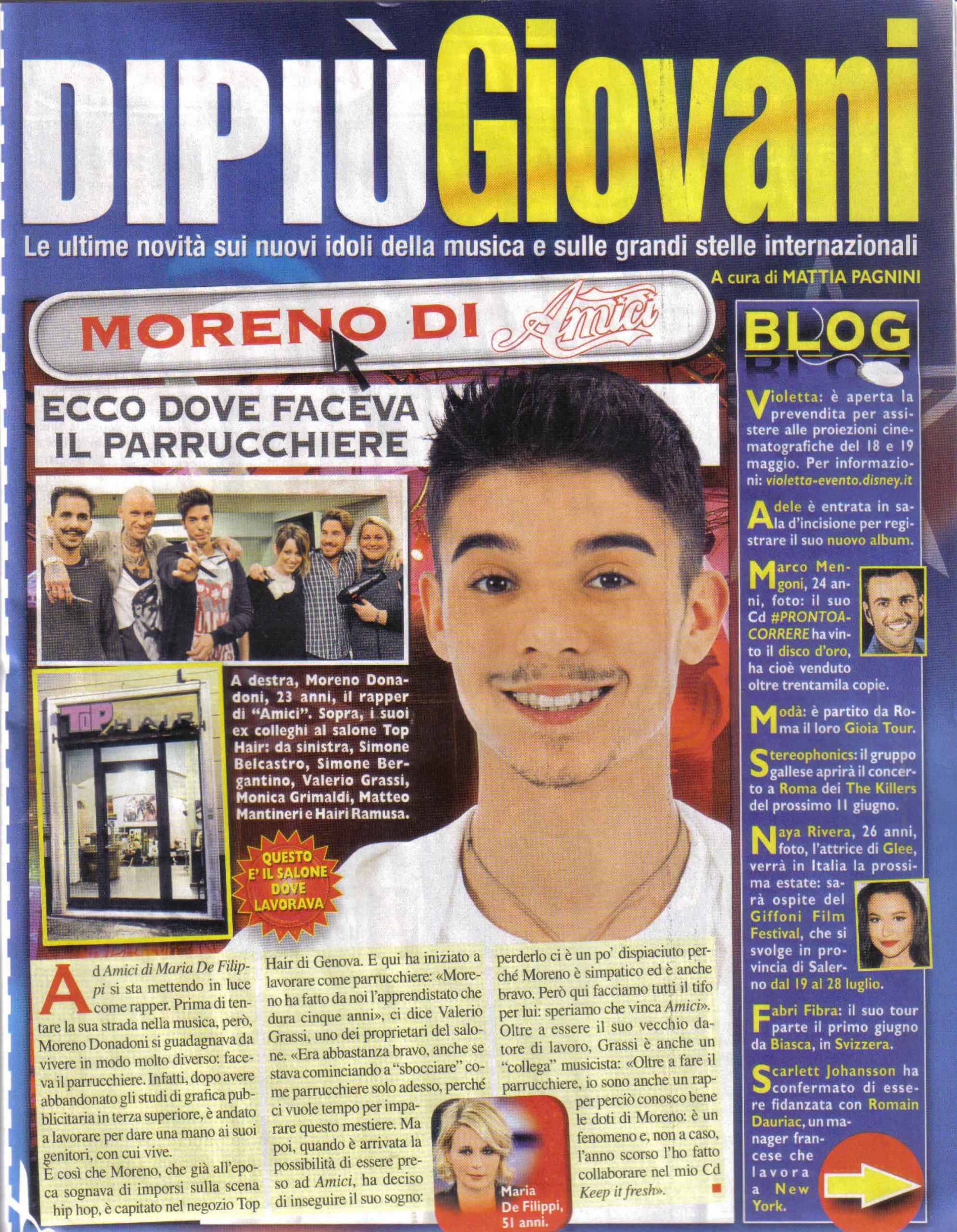 Ad Amici si sta mettendo in mostra come rapper, ma prima di tentare la sua strada nella musica, Moreno Donadoni si guadagnava da vivere facendo il parrucchiere. Dopo aver abbandonato gli studi di grafica pubblicitaria, è andato a dare un mano ai suoi genitori e così è capitato nel negozio Top Hair di Genova. “Moreno ha fatto l’apprendistato da noi che dura cinque anni. Era abbastanza bravo, anche se stava per sbocciare come parrucchiere proprio adesso, perché ci vuole tempo per imparare questo mestiere. Poi ha deciso di seguire il suo sogno, perderlo ci è un po’ dispiaciuto, ma facciamo tutti il tifo per lui”, commenta Valerio Grassi, uno dei proprietari del salone.