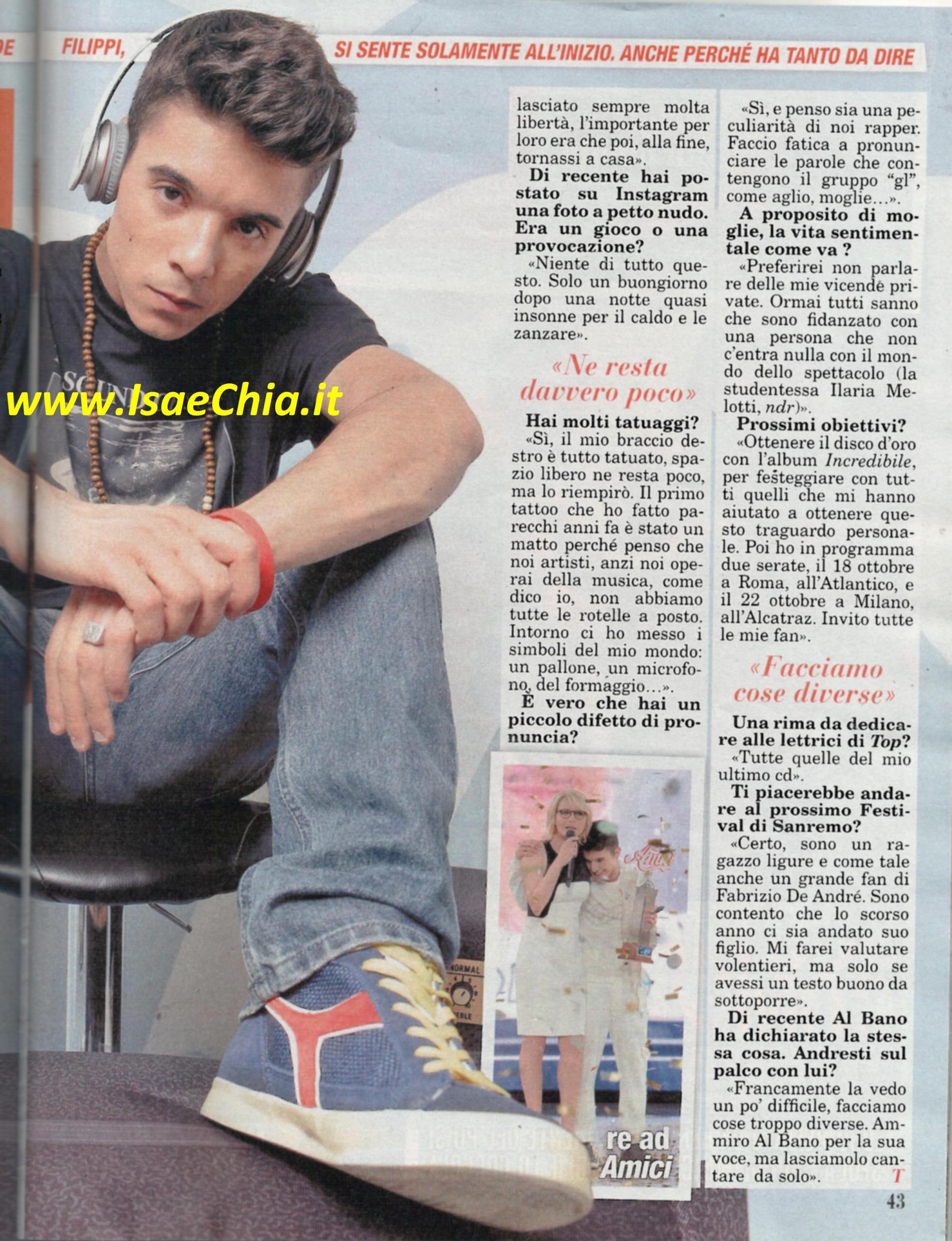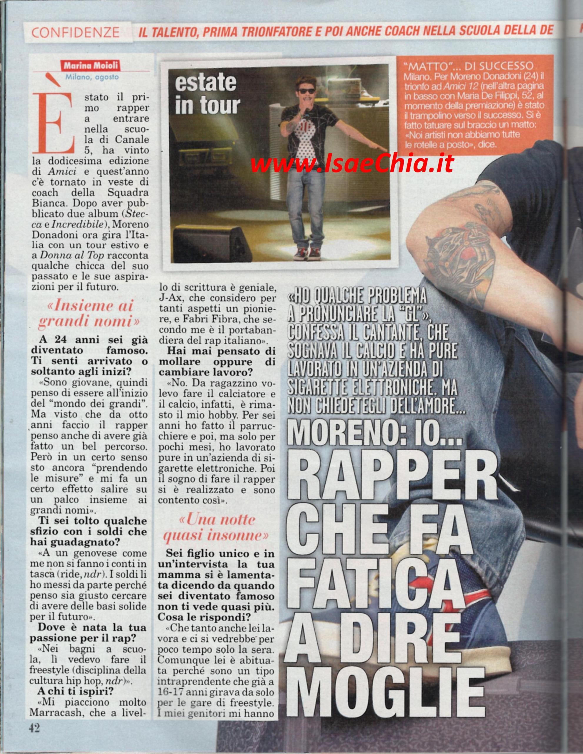 Moreno Donadoni è stato il primo rapper ad entrare nella scuola di Amici e dopo aver vinto la sua edizione, è stato coach della squadra bianca nell’edizione da poco finita. “Sono giovane, quindi mi sento ancora all’inizio del “mondo dei grandi”. Ma visto che da otto anni faccio il rapper, ho già fatto un bel percorso: ho cominciato nei bagni della scuola e mi sono ispirato a Marracash, J-Ax e Fabri Fibra. Ora sto “prendendo le misure” e mi fa un certo effetto salire sul palco insieme a grandi nomi. I soldi li ho messi da parte perché penso sia giusto creare delle basi solide per il futuro”. In una recente intervista, inoltre, ha rivelato che sua madre si lamenta perché da quando è famoso non lo vede più: “Sì, ma tanto anche lei lavora, quindi ci si vedrebbe comunque per poco tempo la sera. Lei è abituata, perché già a 16-17 anni giravo da solo per le gare di freestyle: i miei mi lasciavano andare in giro, purché poi tornassi a casa!”. Poi, dopo aver rivelato il significato dei suoi tatuaggi, rivela il suo difetto di pronuncia: “Penso sia una particolarità di noi rapper: ho difficoltà a pronunciare parole con il gruppo “gl”, come aglio, moglie…”. E, a proposito di moglie, quando gli si chiede come vanno i sentimenti, risponde: “Preferirei non parlarne. Ormai tutti sanno che sono fidanzato con Ilaria, studentessa che non c’entra niente col mondo dello spettacolo”. Prossimi obiettivi? “Ottenere il disco d’oro con l’album Incredibile, e poi due serate: il 18 ottobre a Milano e il 22 a Roma. Il Festival di Sanremo? Certo, mi farei valutare volentieri, ma solo se avessi un testo buono da sottoporre. Da buon genovese sono fan di Fabrizio De André e sono contento che l’anno scorso abbia partecipato suo figlio Cristiano“. Infine quando gli si fa notare che anche l’ex naufrago Al Bano ha dichiarato che tornerebbe a Sanremo e gli si chiede se andrebbe sul palco con lui, risponde: “La vedo difficile, facciamo due cose troppo diverse. Ammiro Al Bano per la sua voce, ma lasciamolo cantare da solo”.