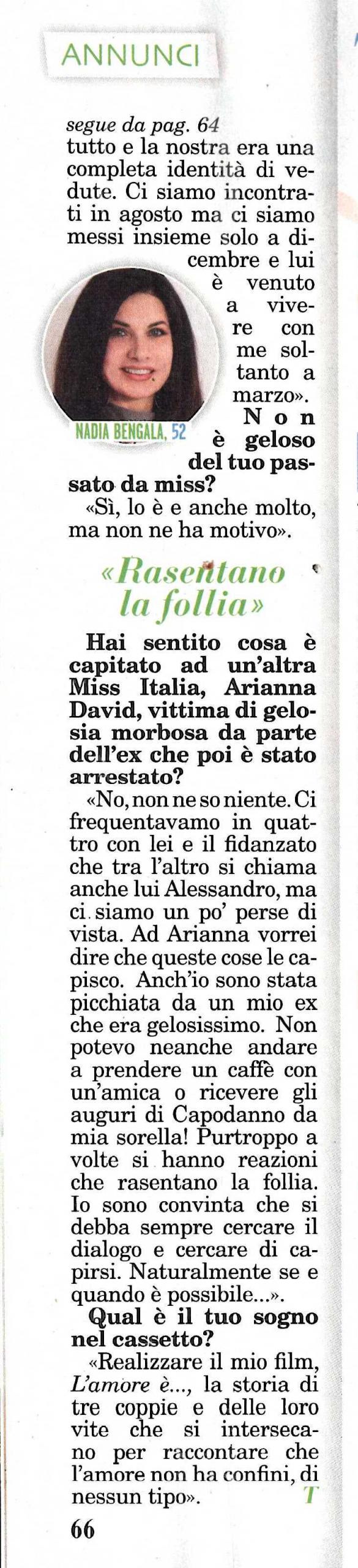 Pochi giorni vi avevamo parlato dell’ex Miss Italia ed ex naufraga dell’Isola dei famosi Arianna David, che è stata vittima di stalking e di violenze da parte di un ex fidanzato (QUI per rivedere l’articolo). Adesso, seguendo la scia della collega, anche la Miss Italia 1988 Nadia Bengala ha svelato un amaro segreto del suo passato. La bellissima 53enne, tuttavia, ora è felice e serena e ha raccontato del suo matrimonio imminente: “Sì, finalmente a settembre io e il mio compagno Alessandro Stocchi ci sposiamo. Stiamo insieme da otto anni e abbiamo pensato di regalarci una nuova giovinezza, anche perché, nel frattempo, tutti i nostri figli sono diventati grandi. Mia figlia Diana ha 19 anni, mentre Alessandro ha quattro figli: Barbara, che l’ha reso già nonno e poi Federico, Beatrice e Benedetta, rispettivamente di 20, 18 e 17 anni. Abbiamo iniziato i preparativi e in questi giorni stiamo facendo la lista degli invitati: saremo in tutto circa 200 persone. Sarà una festa in campagna, a Saturnia, così poi gli amici possono fermarsi alle terme. Avremmo fatto questo passo già da tempo e quando ci siamo fidanzati avremmo voluto anche un bambino, ma non è venuto. Adesso i nostri figli sono grandi e noi ci sentiamo addosso una nuova freschezza e una nuova indipendenza. In fondo non siamo ancora così vecchi! E pensare che ci eravamo incontrati più volte, senza mai ‘calcolarci’! Quando ci siamo rivisti, poi, io ero ancora scottata dalla fine della relazione col padre di mia figlia, lui si era appena separato e viveva un momento di crisi. Prima della passione, abbiamo avuto lunghi mesi in cui parlavamo soltanto; parlavamo di tutto e la nostra era una completa identità di vedute. Ci siamo incontrati ad agosto, ma ci siamo messi insieme a dicembre e lui è venuto a vivere da me a marzo. E’ molto geloso del mio passato da Miss, ma non ne ha motivo“. A proposito di Miss, quando le si racconta della vicenda della David, Nadia risponde: “No, non ne sapevo niente. Io e lei ci frequentavamo in quattro con il fidanzato, che si chiamava anche lui Alessandro, ma poi ci siamo un po’ perse di vista. Ma vorrei dirle che la capisco. Anch’io in passato sono stata picchiata da un ex, che era gelosissimo: non potevo neanche prendere un caffè con un’amica o ricevere degli auguri di Capodanno! Purtroppo a volte si hanno delle relazioni che rasentano la follia. Io sono convinta che si debba sempre cercare il dialogo e cercare di capirsi“. Infine, la Bengala racconta il suo sogno nel cassetto: “Realizzare il mio film, L’amore è…, la storia di tre coppie e delle loro vite che si intersecano per raccontare che l’amore non ha confini, di nessun tipo“.
