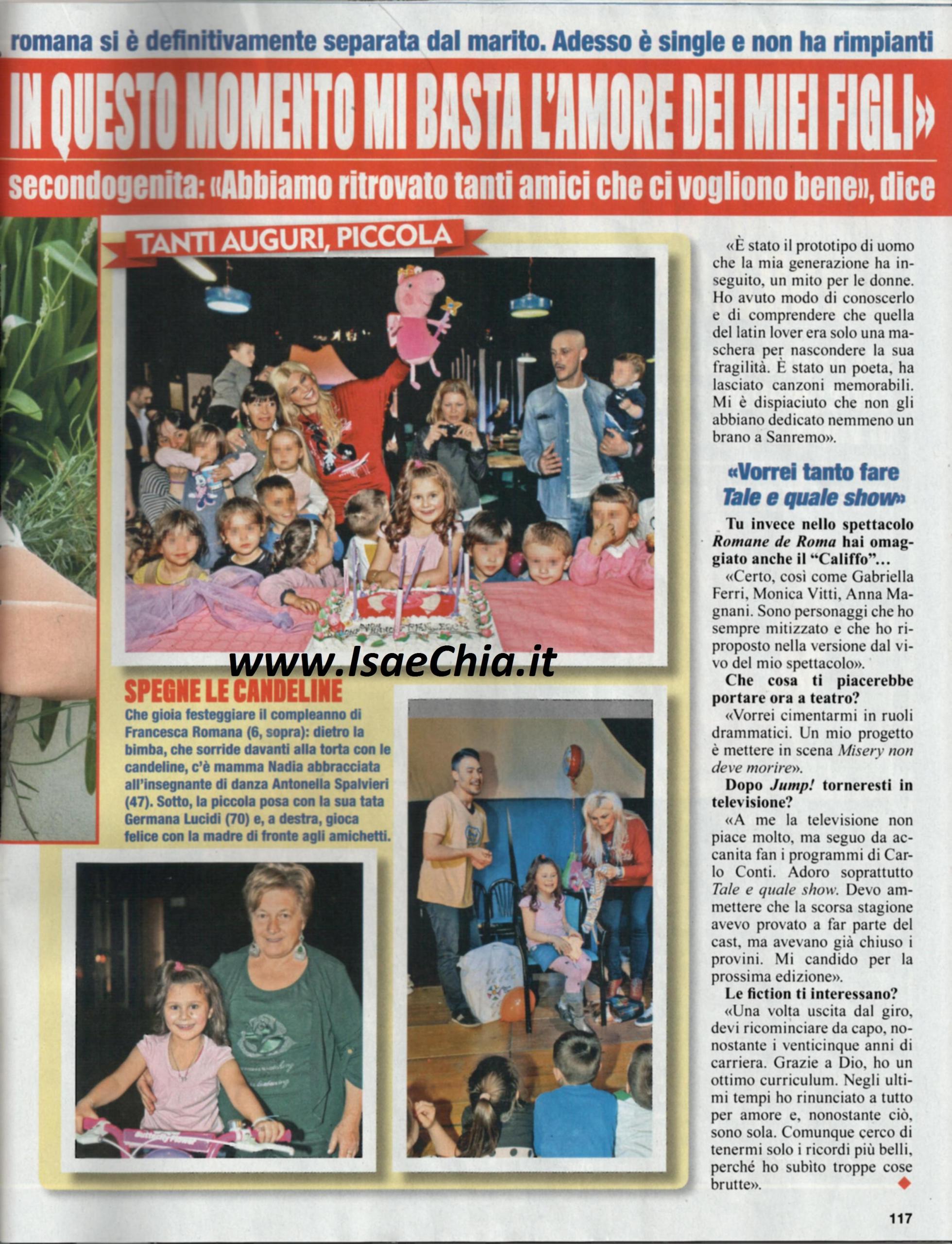 L’attrice Nadia Rinaldi, di recente protagonista di Jump! Stasera mi tuffo, racconta il suo ritorno a Roma dopo la fine del suo matrimonio, per il quale si era trasferita a Pescara: “Io e i miei figli siamo tornati con molta fatica a Roma, ma abbiamo ritrovato un bel clima. Non è facile andare avanti e la sveglia suona prima la mattina perché mio figlio va a scuola in metro. Il mio ex marito si è trasferito definitivamente in Sicilia e non vede molto la piccola, perché dovrebbe essere lei a spostarsi. Lui non lo fa, non so se per volontà sua o degli altri. Non è facile ricominciare dopo la fine di un matrimonio, ma occorre farlo per amore dei figli. Prego solo Dio di avere la salute e lavorare, non chiedo niente, solo che mi vengano fatte proposte di lavoro”. Quando le si chiede se si è affacciato di nuovo l’amore nella sua vita, risponde: “In questo momento sono allergico all’amore, sono allergica all’amore! Ora va bene così, mi bastano i miei figli e voglio concentrarmi sul lavoro. Dopo Jump, ho avuto una piccola parte in Razzabastarda: la pellicola è andata benissimo, mi si è vista per la prima volta in un ruolo drammatico e ho avuto molti riconoscimenti. Inoltre, ho girato il film Califano, l’ultimo concerto, in cui ho recitato il ruolo di Donatella, la donna che è stata accanto a Franco Califano fino all’ultimo. Lui è stato un latin lover, ma era una maschera per nascondere le fragilità. Nello spettacolo Romane de Roma gli ho dedicato una canzone. La tv non mi piace molto, ma seguo i programmi di Carlo Conti, infatti mi candido per la prossima edizione del Tale e quale show”.