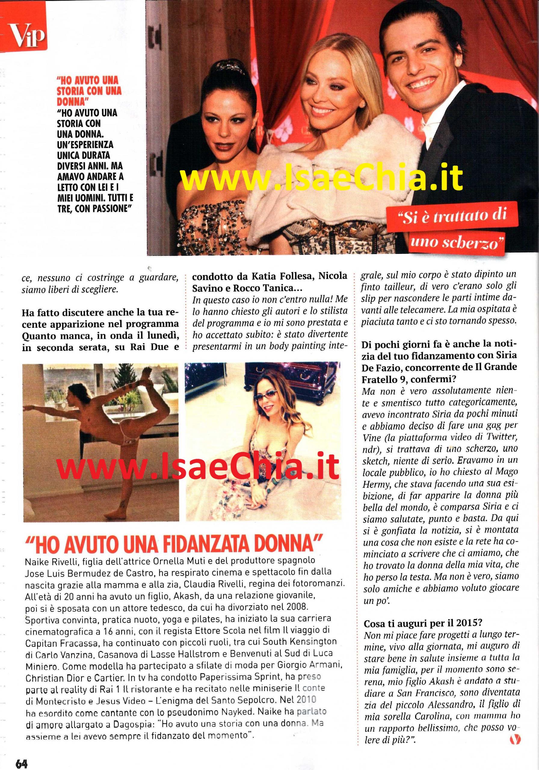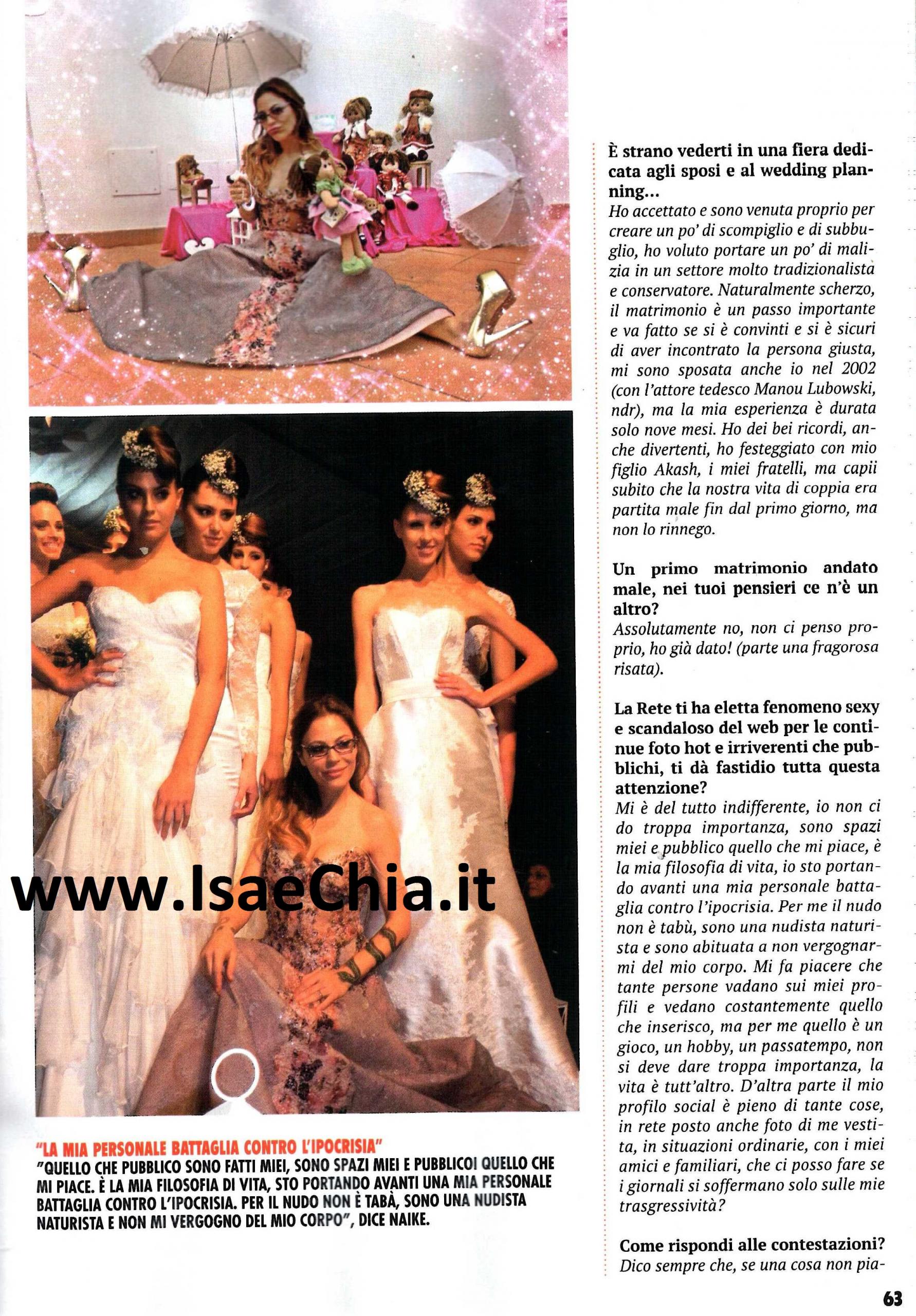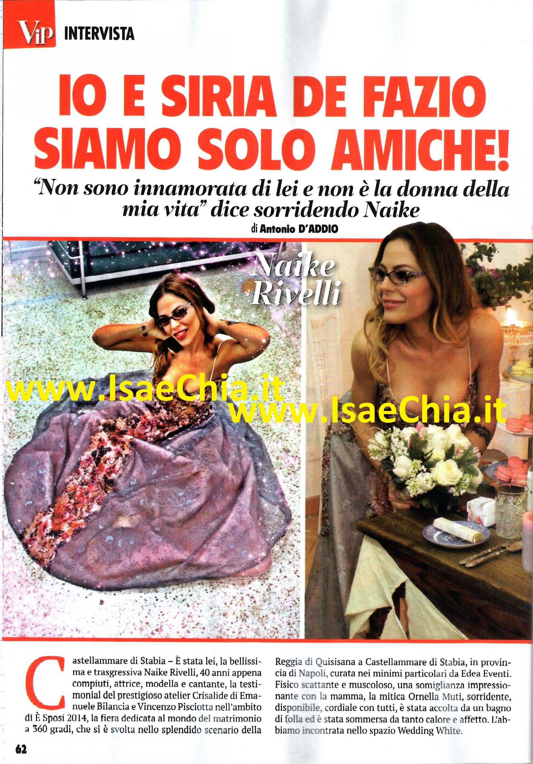La bella Naike Rivelli ha appena compiuto 40 anni, ma, proprio come sua madre Ornella Muti, sembra migliorare con l’età. In occasione dell’evento E’ sposi 2014 di Castellammare di Stabia, ha fatto da testimonial per un atelier di abiti da sposa, un ruolo nel quale non la si vede di solito: “Ho accettato proprio per creare un po’ di scompiglio e subbuglio; per portare un po’ di malizia in un settore conservatore e tradizionalista. Naturalmente scherzo: il matrimonio è un passo importante e va fatto solo se si è sicuri di aver incontrato la persona giusta. Nel 2002 mi sono sposata con l’attore tedesco Manou Lubowsky, ma è durata solo nove mesi. Ho dei bei ricordi, ho festeggiato con mio figlio Akash e i miei fratelli, ma capii che la nostra vita di coppia era finita sin dal primo giorno. Eppure non lo rinnego. Ora non ci penso proprio, ho già dato!“. In effetti, attorno a Naike si è costruita un’immagine di una donna assolutamente trasgressiva e controtendenza: “Non do attenzione all’importanza che mi viene dal web. Sono spazi miei e pubblico ciò che mi piace, è la mia filosofia di vita. Per me il nudo non è tabù, sono una nudista naturista e sono abituata a non vergognarmi del mio corpo. Mi fa piacere che molte persone guardino ciò che pubblico, ma quello è un gioco, un passatempo e non gli si deve dare troppa importanza. Ai contestatori dico sempre che se una cosa non piace, nessuno ci costringe a guardare, siamo liberi di scegliere“. Quanto alla sua partecipazione al programma Quanto manca, con Katia Follesa: “In quel caso non c’entro niente! Sono stata invitata dagli autori e dalla stilista. Mi sono divertita a presentarmi con un body painting integrale: sul mio corpo è stato dipinto un tailleur, di vero c’erano solo gli slip. La mia ospitata è piaciuta e ci sto tornando spesso“. Infine, quanto alla foto del bacio con l’ex gieffina Siria De Fazio, che ha fatto subito scatenare le voci di una storia tra loro (QUI per vedere la foto), risponde: “Non è assolutamente vero. Smentisco tutto categoricamente. Avevo incontrato Siria da pochi minuti e abbiamo deciso di fare una gag per Vine, la piattaforma video di Twitter, si trattava di uno scherzo. Eravamo in un locale pubblico, ho chiesto al mago Hermy, che stava facendo il suo show, di far apparire la donna più bella del mondo, è comparsa Siria e ci siamo salutate. Da qui si è gonfiata la notizia: la Rete ha scritto che ci amiamo, che ho trovato la donna della mia vita. Non è vero: siamo solo amiche e abbiamo voluto giocare un po’“.