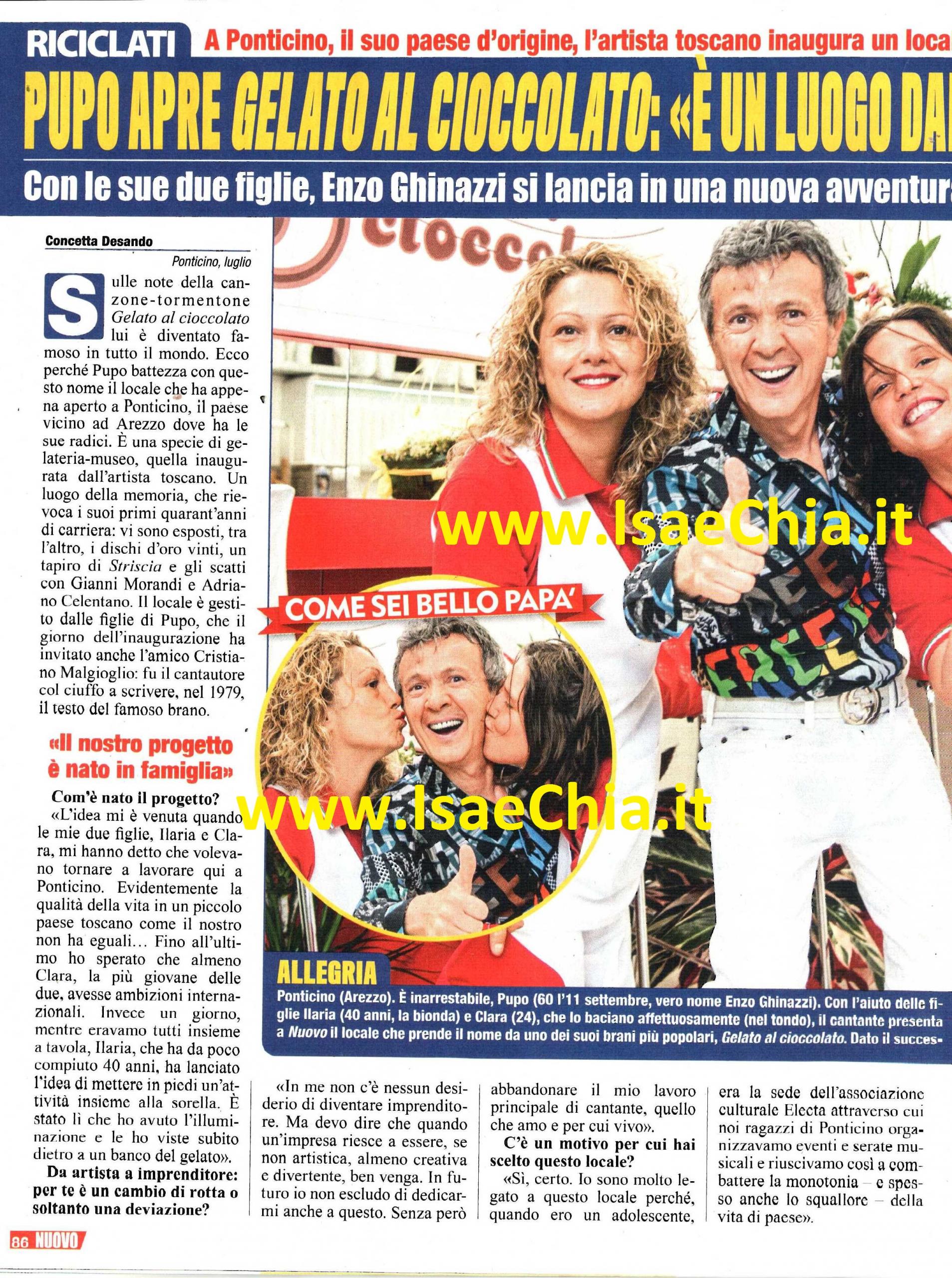 Sulle note del tormentone Gelato al cioccolato, il cantante Pupo è diventato famoso in tutto il mondo. Ecco perché ha deciso di chiamare proprio così il locale che ha inaugurato nel suo paese natale, Ponticino, vicino Arezzo, una specie di gelateria-museo in cui ha esposto anche i suoi dischi d’oro, un ‘tapiro’ di Striscia la notizia e gli scatti con Gianni Morandi e Adriano Celentano. Il tutto gestito dalle sue figlie: “L’idea mi è venuta quando le mie figlie Ilaria e Clara hanno detto che volevano tornare a lavorare qui a Ponticino. Fino all’ultimo ho sperato che almeno la più giovane, Clara, avesse ambizioni internazionali, invece un giorno, a tavola, Ilaria, che ha 40 anni ha lanciato l’idea di metter su qualcosa con sua sorella. E’ stato lì che ho avuto l’illuminazione e le ho viste subito dietro al banco dei gelati. In me non c’è nessuna intenzione di diventare imprenditore, ma se un’impresa riesce ad essere almeno creativa e divertente, ben venga. Non escludo di farlo in futuro, ma senza abbandonare il mio lavoro di cantante, quello che amo e per cui vivo. Ho scelto questo locale perché quando ero giovane era la sede dell’associazione Electa, con cui noi ragazzi organizzavamo eventi per combattere la monotonia e a volte lo squallore della vita di paese. Praticamente è il luogo dove la mia carriera ha avuto inizio, cinquant’anni fa e perciò l’ho reso una specie di museo dove ho esposto tanti ricordi della mia carriera” dichiara Pupo, vero nome Enzo Ghinazzi. E il giorno dell’inaugurazione non poteva mancare l’ex naufrago Cristiano Malgioglio, che è stato l’autore di Gelato al cioccolato nel lontano 1979. I due posano insieme, ‘brindano’ con i coni, poi Pupo gli fa annusare il gelato, che il paroliere assaggia, non resistendo. “Oltre al gelato al cioccolato fondente e ai gusti classici, c’è anche il gelato ‘dolce un po’ salato’, un caramello squisito che ti manda fuori di testa! Le mie figlie hanno seguito un corso all’Università del Gelato Carpigiani, che ha sede vicino Bologna” continua lui. “A chi offrirei un gelato? Mi vengono in mente tante persone, ma se proprio devo sceglierne una, dico il ministro Maria Elena Boschi, mia conterranea: la invito ufficialmente qui a Ponticino“. Infine, quando gli si chiede se sarà al prossimo Festival di Sanremo, Pupo risponde: “Sì, mi piacerebbe presentare una nuova canzone. Ci sto lavorando col mio produttore Fabrizio Vanni e mi sto divertendo a scrivere un pezzo dopo tanto tempo. Abbiamo tre o quatto canzoni molto forti, ma solo quando le avremo realizzate capiremo se ci convinceranno e quale proporre al mio amico Carlo Conti!“.