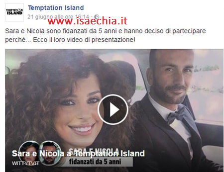 La loro storia è iniziata cinque anni fa, quando Nicola aveva 29 anni e Sara solamente 16. Nicola è il classico calciatore playboy, pieno di ragazze che gli ronzano intorno e per questo motivo Sara è quella più gelosa della coppia, anche perché lui nel corso degli anni le ha dato motivo di sospettare. Sara si considera la più matura tra i due, mentre Nicola è l’eterno Peter Pan. Lei ha deciso di partecipare a Temptation Island per avere la conferma che il fidanzato, nonostante sia stato l’unico uomo della sua vita, sia quello giusto. Nicola vuole dimostrare a Sara di essere cambiato, ma allo stesso tempo teme che lei, non avendo avuto altri partner, possa desiderare di provare nuove esperienze.