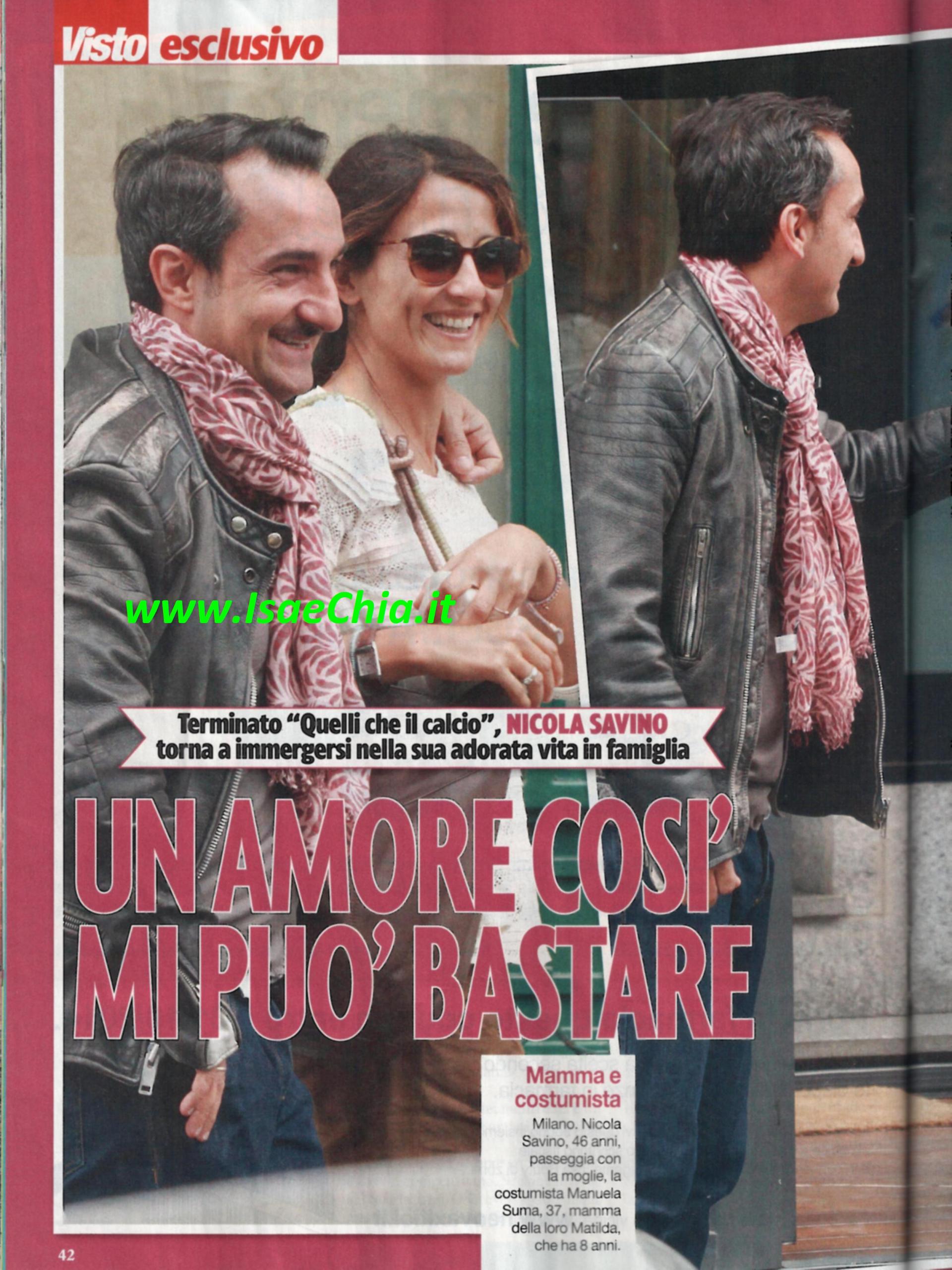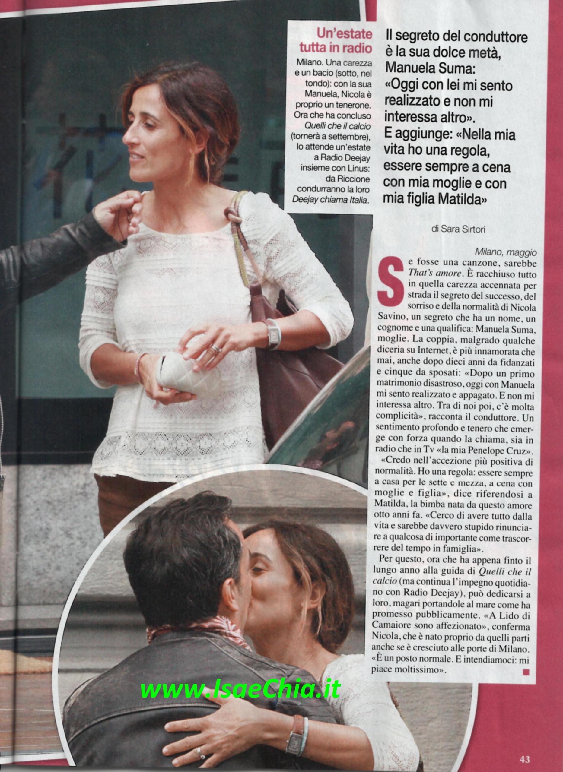 Se fosse una canzone, sarebbe That’s amore: in una coccola accennata per strada è racchiuso il segreto di un grande amore, quello tra il conduttore di Quelli che il calcio Nicola Savino e sua moglie Manuela Suma. Nonostante le dicerie su internet, i due sono sempre innamorati, dopo dieci anni da fidanzati e cinque da sposati: “Dopo un primo matrimonio disastroso, oggi con Manuela mi sento appagato e realizzato. Tra noi c’è molta complicità e non m’interessa altro” racconta lui. “Credo nell’accezione più positiva della normalità. Ho una regola: essere sempre a casa per le sette e mezza, per cenare con mia moglie e mia figlia. Cerco di avere tutto dalla vita e sarebbe davvero stupido rinunciare a qualcosa di importante come trascorrere del tempo con la propria famiglia”. E infatti, come qualsiasi altra famiglia “normale”, si preparano alle vacanze: “Sono affezionato a Lido di Camaiore, è un posto normale, ma mi piace moltissimo”.