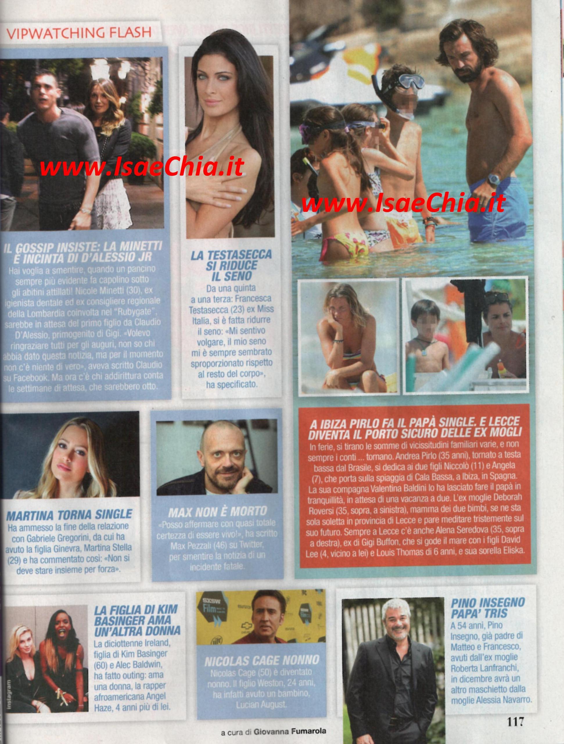 Si dedica alle gioie della paternità anche il calciatore Andrea Pirlo, tornato deluso dai Mondiali in Brasile: eccolo infatti con i figli Niccolò e Angela e la nuova compagna Valentina Baldini a Ibiza. L’ex moglie Deborah Roversi, invece, è a Lecce, dove, curiosamente, è in vacanza con i figli anche Alena Seredova, ex del collega di Pirlo, Gigi Buffon.