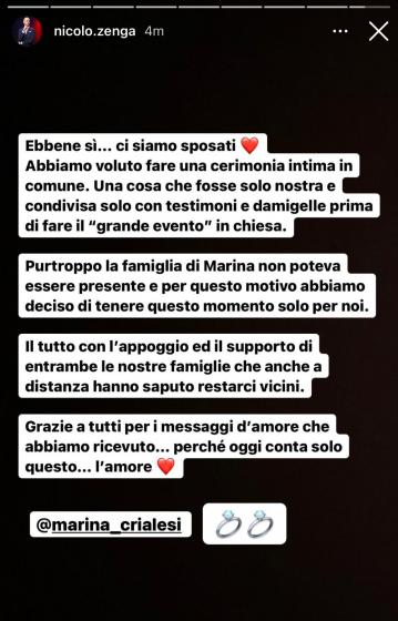 “Ebbene sì, ci siamo sposati“, ha scritto Nicolò. “Abbiamo voluto fare una cerimonia intima in Comune. Una cosa che fosse solo nostra e condivisa solo con testimoni e damigelle prima di fare il “grande evento” in chiesa. Purtroppo la famiglia di Marina non poteva essere presente e per questo motivo abbiamo deciso di tenere questo momento solo per noi. Il tutto con l’appoggio e il supporto di entrambe le nostre famiglie che, anche a distanza, hanno saputo restarci vicine. Grazie a tutti per i messaggi d’amore che abbiamo ricevuto. Perché oggi oggi conta solo questo: l’amore“.