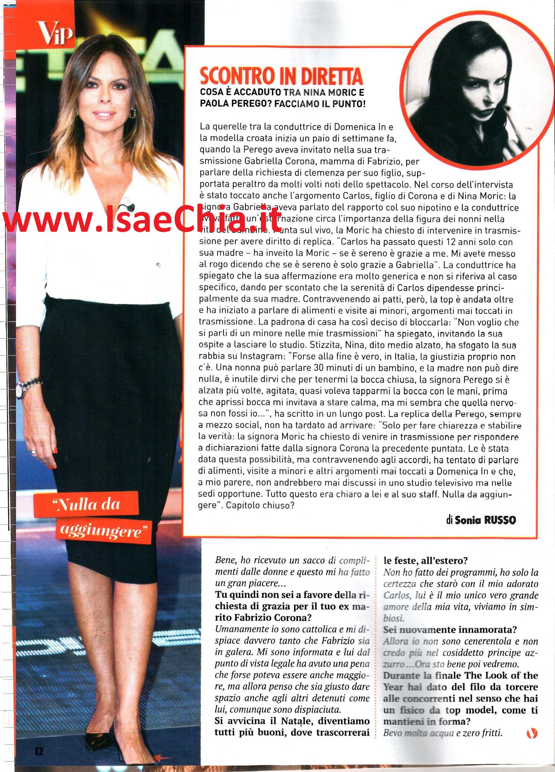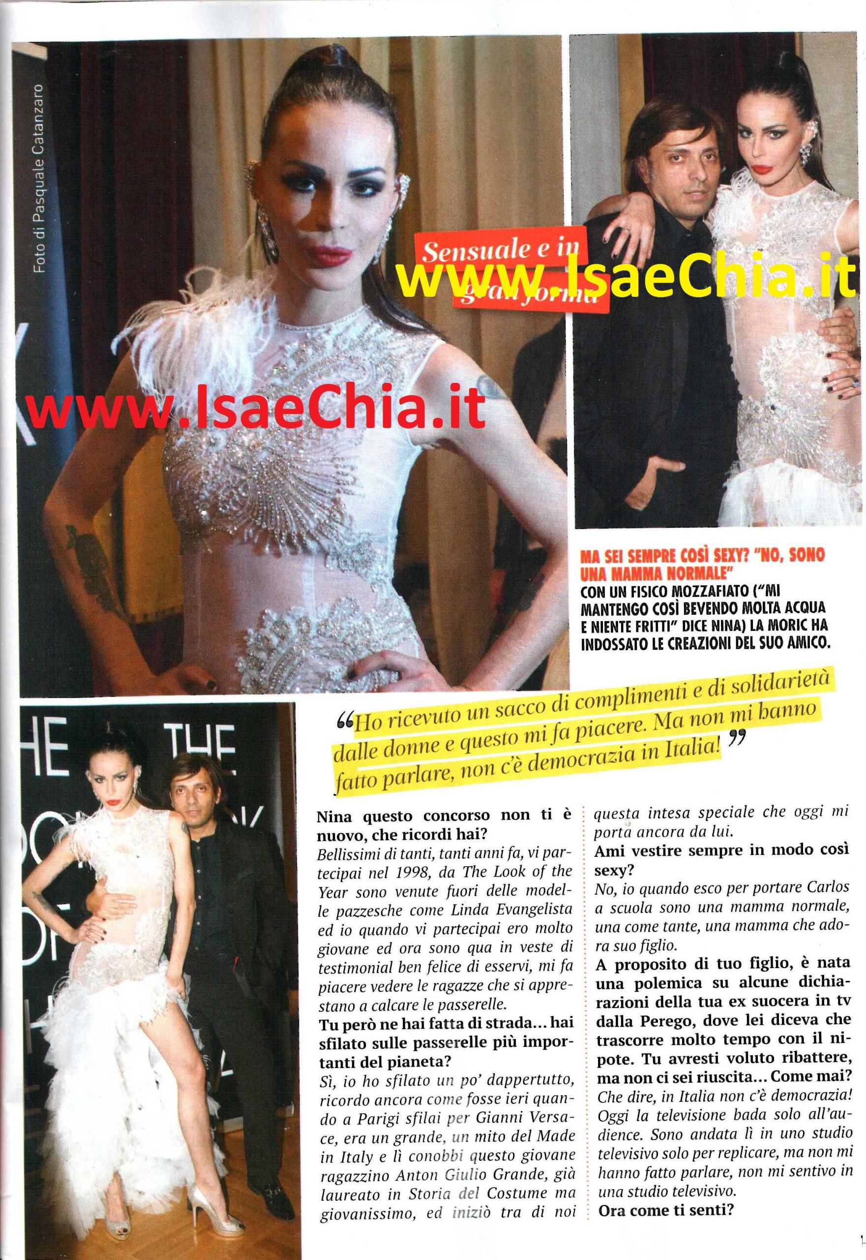 Due settimane fa, l’ex naufraga Nina Moric è stata ospite di Paola Perego a Domenica In, ma l’incontro si è presto tramutato in uno scontro tra le due: la conduttrice, infatti, ha accusato la modella croata di voler parlare di alimenti, soldi e altri temi delicati riguardanti la sua separazione da Fabrizio Corona, che, secondo gli accordi presi, non dovevano essere trattati. Nina, infatti, avrebbe potuto solo replicare alla madre di Fabrizio, la signora Gabriella, per precisare che non è solo grazie a lei se il figlio Carlos sta crescendo sereno (QUI per rileggere l’articolo e le risposte via web di Nina Moric e Paola Perego). Ancora adirata per la “censura” della Rai, la Moric è stata protagonista del concorso The look of the Year di Roma, dove ha indossato gli abiti dell’amico Anton Giulio Grande. Quando le si chiede di commentare l’accaduto, risponde: “Che dire? In Italia non c’è democrazia! Oggi la tv bada solo all’audience. Sono andata in uno studio televisivo a replicare, ma non mi hanno fatto parlare, non mi sentivo in uno studio televisivo. Adesso sto bene: ho ricevuto un sacco di complimenti da parte di donne e questo mi ha fatto molto piacere. Umanamente, essendo cattolica, mi dispiace molto che Fabrizio sia in galera. Mi sono informata e so che la pena poteva essere anche maggiore, allora penso che sia giusto dare spazio anche ad altri detenuti, come è stato dato a lui” ha aggiunto lei, quando le si chiede se è favore della grazia per l’ex marito. Quanto all’evento, ha ricordato: “Partecipai tanti anni fa, nel 1998, quando ero molto giovane e da qui sono venute fuori modelle pazzesche, come Linda Evangelista. Io ho sfilato un po’ dappertutto, ricordo ancora come fosse ieri quando sfilai per Gianni Versace a Parigi e conobbi questo ragazzo, laureato in Storia del costume, che era Anton Giulio, e iniziò un’intesa speciale che mi porta ad essere oggi qui con lui. Per le feste non ho programmi, so solo che starò con mio figlio: è il mio unico grande amore della mia vita, viviamo in simbiosi“. Così, quando le si chiede se è di nuovo innamorata, dato che alla festa era accompagnata dal suo nuovo e giovane fidanzato, risponde: “Non sono Cenerentola e non credo più nel Principe azzurro. Ora sto bene, poi vedremo!“