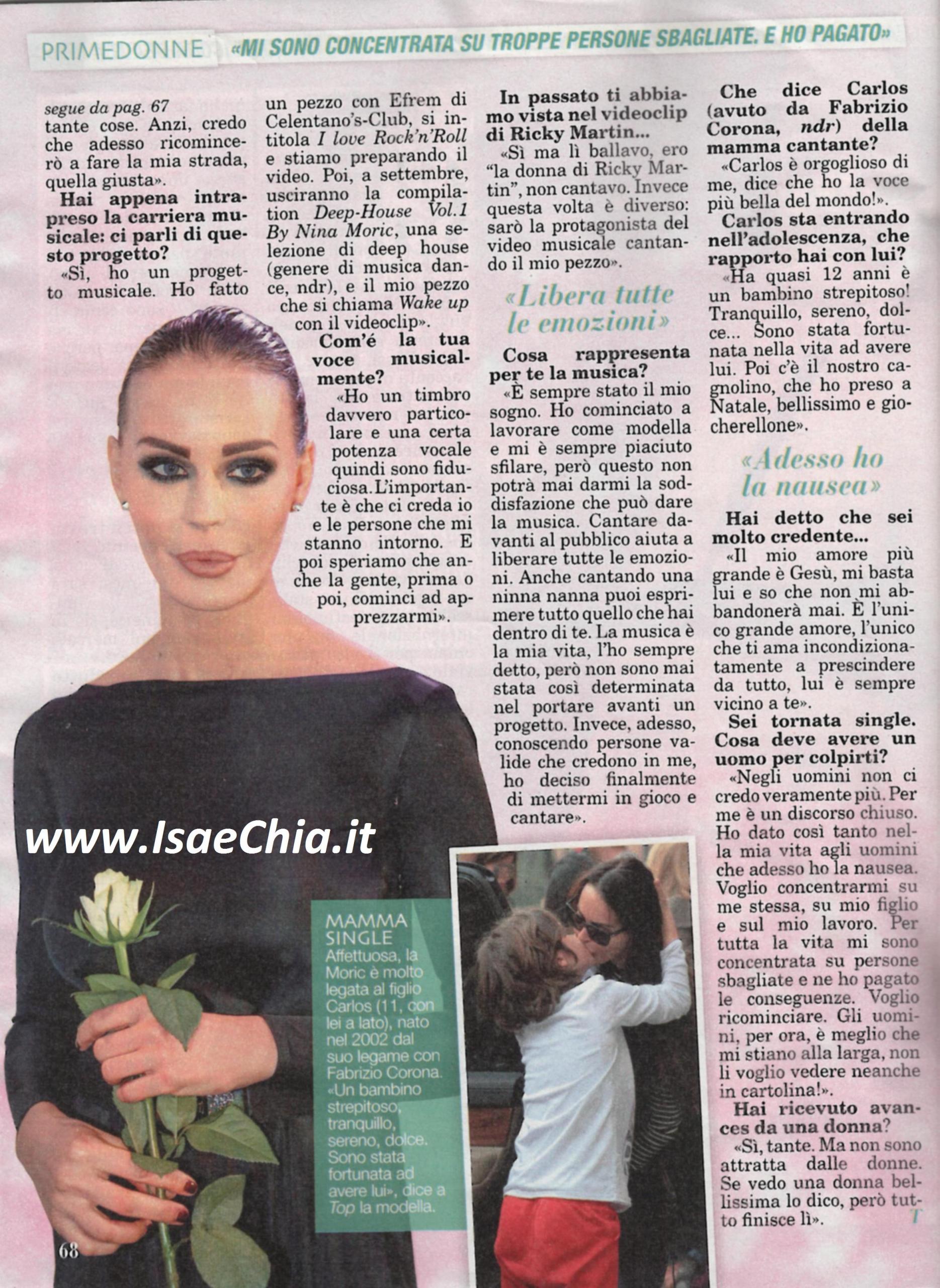 L’ex naufraga Nina Moric ha le idee piuttosto chiare: “Gli uomini, per adesso, mi stiano alla larga! Perché, veramente, non li voglio più vedere nemmeno in cartolina” ha annunciato lei. Pochi mesi fa è finita la storia con Massimiliano Dossi, che era stata coronata da un matrimonio con rito buddhista in Thailandia, ed era solo l’ultima di una serie di amori andati male: il matrimonio con Fabrizio Corona, e poi Martin Evans, Pasquale Granata e Matteo Bobbi. “Ho dato così tanto agli uomini che ora ne ho la nausea. Voglio concentrarmi su me stessa, su mio figlio e sul mio lavoro. Per tutta la vita mi sono concentrata sulle persone sbagliate e ne ho pagato le conseguenze. Ho ricevuto avances anche dalle donne; io se vedo una bellissima donna lo dico, ma finisce lì”. La modella croata, quindi, si dedica alle sue nuove attività: “Ho un progetto musicale: ho inciso un pezzo con Efrem di Celentano’s Club, I love Rock’n’Roll, mentre per settembre uscirà un disco dance. Ho un timbro particolare e potente, l’importante è che la gente creda in me e prima o poi cominci ad apprezzarmi. Inoltre, una grossa azienda mi ha scelta come testimonial per una crema al caviale e al veleno di vipera: sono prodotti rivoluzionari e commercializzati per la prima volta in Europa. I risultati, vi assicuro, sono ottimi. Costa sui 150-170 euro perché è una crema molto valida. Io sono fortunata perché mangio tanto e non vado in palestra ma qualcuno lassù mi vuole tanto bene se sono ancora come dieci anni fa”. Infatti, Nina si proclama molto credente: “Il mio amore più grande è Gesù, mi basta lui e so che non mi abbandonerà mai. E’ l’unico che ama incondizionatamente, a prescindere da tutto è sempre vicino a te”. E, a proposito di grandi amori, parla del figlio Carlos: “E’ orgoglioso di me, dice che ho la voce più bella del mondo. Ha quasi 12 anni ed è un bambino strepitoso, tranquillo, sereno, dolce. Sono stata fortunata ad avere lui”.