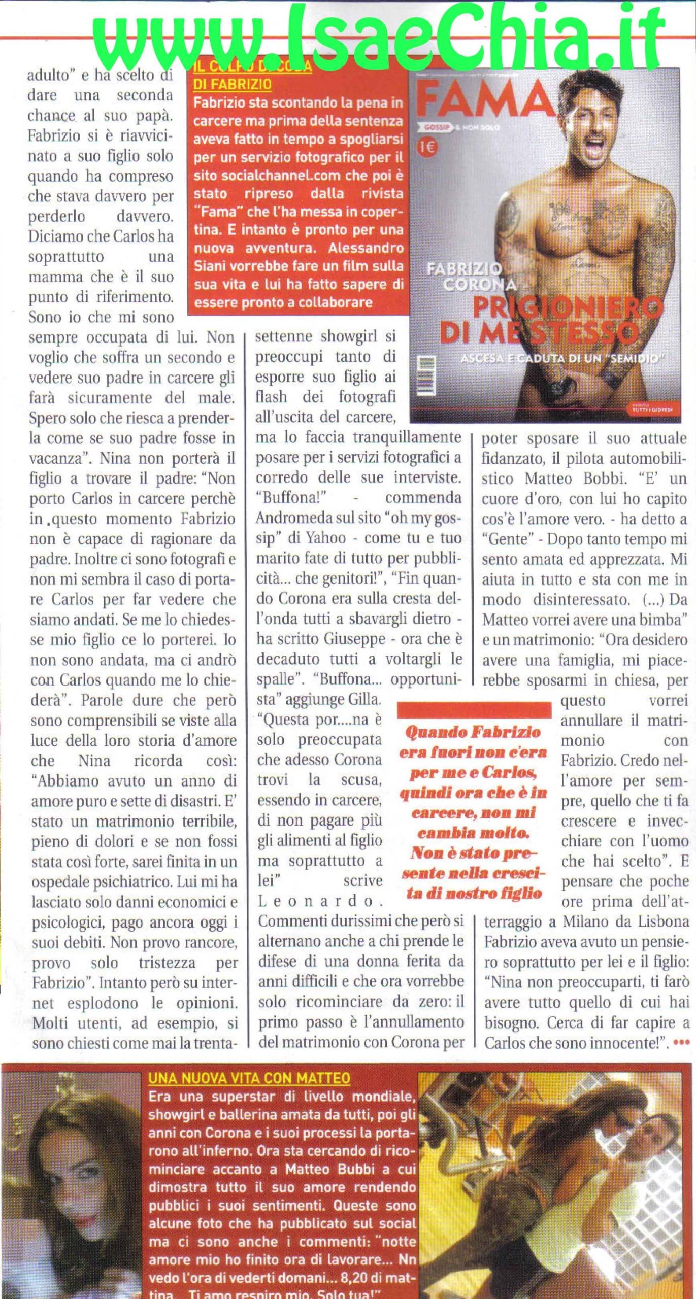 L’ex naufraga Nina Moric ha recentemente dichiarato circa l’ex marito Fabrizio Corona: “Ha bisogno di una perizia psichiatrica, perché lui è ossessionato dal suo personaggio. Quello che abbiamo visto in questi anni non è lui, è patetico. Io sono convinta che lui sia innocente e che la pena sia esagerata, ma lui ha voluto quello che ha adesso e ha fatto di tutto per sfidare lo Stato: si sente il Messia, soffre di delirio di onnipotenza. E’ affamato di denaro, si sarebbe venduto anche l’anima al diavolo. Lui e Lele Mora si sono rovinati a vicenda. Mora ha già pagato, ora tocca a Fabrizio. Quando era fuori non c’era per me e per suo figlio Carlos, quindi non cambierà molto ora che è dentro. Sapeva che sarebbe arrivata la condanna e poteva passare più tempo con Carlos, che gli ha scritto: “Non posso fidarmi di te”! Non lo porterò in carcere, perché Fabrizio non è capace di ragionare da padre in questo momento e non mi piace che ci siano fotografi. Lui mi ha lasciato danni economici e psicologici: pago ancora oggi i debiti”. Ora, Nina vorrebbe sposare il suo attuale fidanzato, il pilota Matteo Bobbi: “E’ un cuore d’oro e con lui ho capito cos’è l’amore vero. Mi sento amata e apprezzata, mi aiuta in tutto e sta con me in modo disinteressato. Desidero avere una famiglia e sposarmi in chiesa, per questo vorrei far annullare il matrimonio con Corona”.