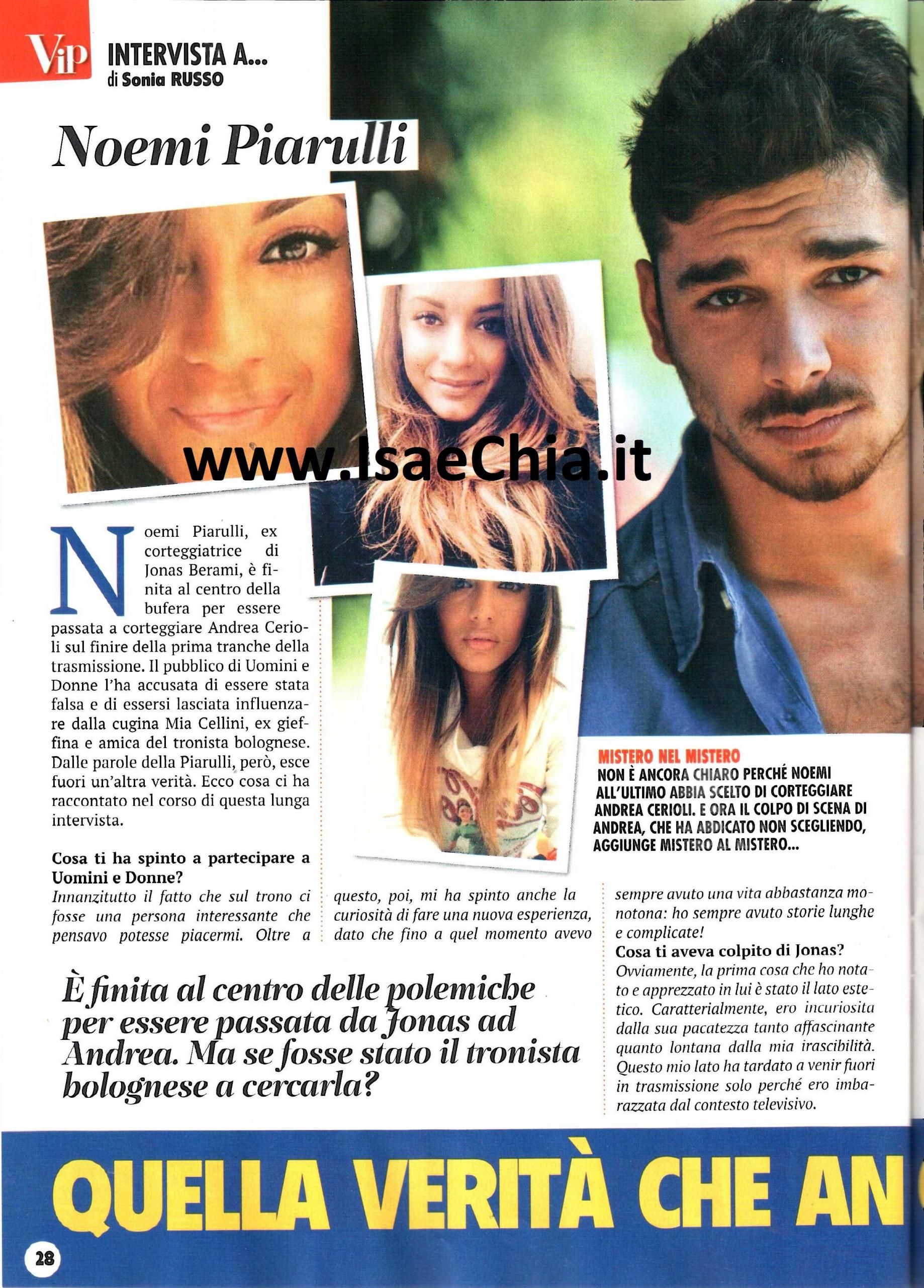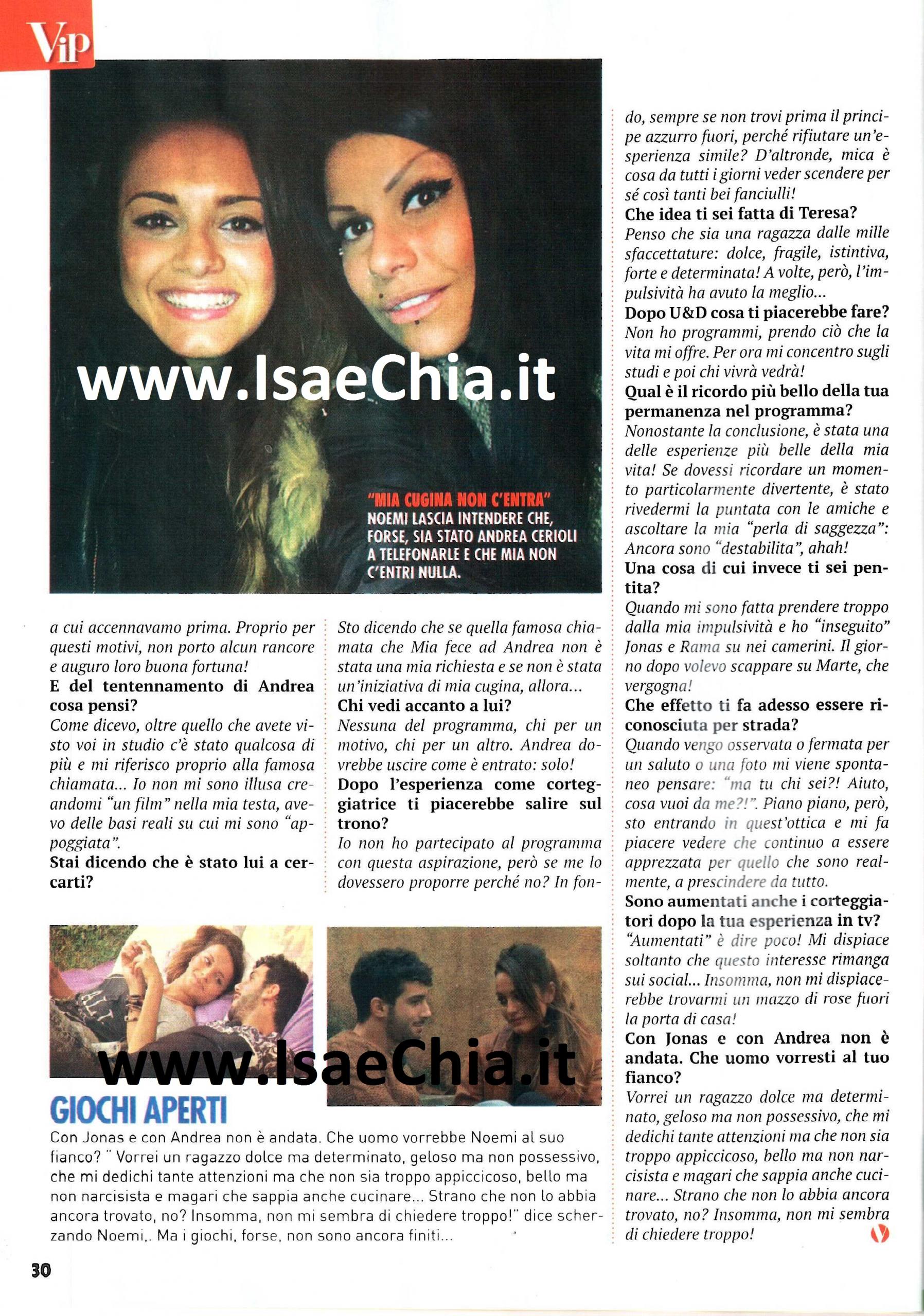 Nelle scorse puntate di Uomini e Donne abbiamo assistito all’abbandono del trono da parte di Andrea Cerioli, nonostante l’ex gieffino avesse deciso di restringere la cerchia delle corteggiatrici solo a Sharon Bergonzi e Valentina Rapisarda. Qualche puntata fa, infatti, aveva eliminato anche Noemi Piarulli, che aveva deciso di non corteggiare più Jonás Berami per conoscere meglio lui. Adesso, Noemi racconta: “Mi ha spinto a partecipare il fatto che sul trono ci fosse qualcuno che mi poteva interessare, oltre alla voglia di fare una nuova esperienza, dato che in passato ho sempre avuto storie lunghe e complicate. Di Jonás mi aveva colpito inizialmente il lato estetico e caratterialmente la sua pacatezza, lontana dalla mia irascibilità. Ho smesso di corteggiarlo per il motivo più ovvio: non mi piaceva. Il suo carattere non era compatibile col mio e io non voglio accontentarmi, così quando mi sono accorta che la nostra frequentazione non sarebbe potuta andare a buon fine, ho preferito chiuderla lì. Non mi sono mai definita innamorata, ma interessata e il mio interesse è svanito”. Allora, quando le si chiede se l’interesse per Andrea fosse sincero, risponde: “Certo che sì! Se il mio interesse fosse stato per le telecamere, sarei rimasta per Jonás: non mi sarebbe convenuto recitare la parte della ‘seconda scelta’?”. Quando le si chiede se sua cugina Mia Cellini, ex “coinquilina” di Andrea ha influito in questa scelta, Noemi spiega: “No, per quanto possa sembrare irrealistico, Mia è arrivata dopo. Ho scoperto che io e lei siamo cugine durante il suo Grande fratello, ma fino a metà dicembre con lei non c’era stato nessun contatto. Quando lei mi ha cercato, l’interesse per Andrea era già nato. Da sconosciute quali eravamo, le confessai che mi avevano fatto piacere dei commenti positivi di Andrea sulla situazione con Jonás e il mio progressivo disinteresse. Quando Andrea mi ha eliminata, ci sono rimasta male, perché non capivo determinate cose. La situazione è più complicata di quanto sembri. Vi dico soltanto che la chiamata di Mia ad Andrea non è stata una mia richiesta e nemmeno una sua iniziativa. A buon intenditore, poche parole!”. Adesso che i percorsi dei tronisti si sono conclusi, Noemi commenta così: “In cuor mio ho sempre saputo che la scelta di Jonás sarebbe stata Rama Lila Giustini, ma tentar non nuoce! Teresa Cilia è una ragazza dalle mille sfaccettature, dolce, fragile, istintiva, forte e determinata, ma a volte l’istintività ha avuto la meglio. Di Andrea, come dicevo, oltre quello che avete visto voi in studio c’è stato qualcosa di più e mi riferisco proprio alla famosa chiamata. Io non mi sono illusa creandomi un film nella mia testa, avevo delle basi reali su cui mi sono appoggiata. Non vedo nessuna delle corteggiatrici accanto a lui, dovrebbe uscire solo come è entrato”. E infatti, così è stato. Infine, quando le si chiede se tornerebbe nelle vesti di tronista, risponde: “Non ho partecipato con questa ambizione, ma se dovessero propormelo, perché no? In fondo, se non trovo il principe azzurro fuori, perché rifiutare un’esperienza simile? Mica è una cosa da tutti i giorni veder scendere tanti bei fanciulli per te! E’ stata una delle esperienze più belle delle mia vita ed è stato divertente rivedere con le mie amiche le mie “perle di saggezza”! Quando vengo fermata per strada, la prima reazione è ‘Ma chi sei, cosa vuoi da me?’, ma pian piano sto entrando in quest’ottica e mi fa piacere essere apprezzata. I corteggiatori? A dir poco aumentati…Ma quest’interesse rimane sui social! Non mi dispiacerebbe ricevere un mazzo di rose a casa! Vorrei un ragazzo dolce ma determinato, che mi dedichi tante attenzioni ma non appiccicoso, bello ma non narcisista e magari che sappia cucinare! Insomma, non mi pare di chiedere troppo!”