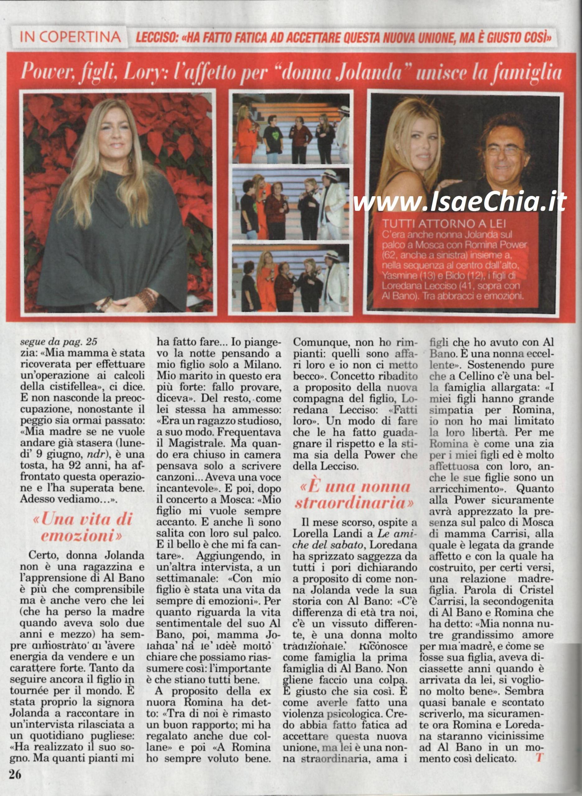 Quando il cantante Al Bano decise, a 16 anni, di lasciare la città natia, Cellino San Marco, per tentare di fare carriera a Milano, la mamma Jolanda Ottino lo sostenne. L’ex naufrago, infatti, si è sempre dichiarato molto legato a lei: “Sono sempre stato circondato da donne forti e la prima nella lista è mia madre: a 91 anni è ancora in gamba, ha voluto essere al concerto di Mosca e ha preteso di pagarsi il biglietto aereo” raccontava lui pochi mesi fa, in occasione della re-union con Romina Power. Ma nella notte tra il 6 e il 7 giugno la signora Jolanda ha fatto spaventare molto Al Bano: è stata portata all’ospedale d’urgenza. “Mia mamma è stata operata ai calcoli alla cistifellea, ma è una tosta, se ne vuole andare già stasera” ha dichiarato lui il giorno 9. La compagna Loredana Lecciso, dal suo canto, ha parlato bene della “suocera” a Le amiche del sabato: “C’è differenza d’età tra noi e un vissuto differente: è una donna molto tradizionale. Riconosce la prima famiglia di Al Bano e non gliene faccio una colpa, è normale che sia così, è come averle fatto una violenza psicologica. Credo abbia fatto fatica ad accettare questa nuova unione, ma lei è una nonna straordinaria, ama i figli che ho avuto con Al Bano”. D’altronde Loredana ha specificato che la loro è una grande famiglia allargata: “I miei figli vedono Romina come una zia, è molto affettuosa con loro; anche le sue figlie sono un arricchimento”. Infine, proprio una delle figlie di Al Bano e Romina, Cristel Carrisi, ha espresso la forza del suo legame con la nonna: “Mia nonna nutre grandissimo amore per mia madre, è come se fosse sua figlia: aveva 17 anni quando è arrivata da lei”. Insomma, la signora Jolanda ha unito proprio tutti e sicuramente in questo momento sia Loredana che Romina staranno vicine ad Al Bano.