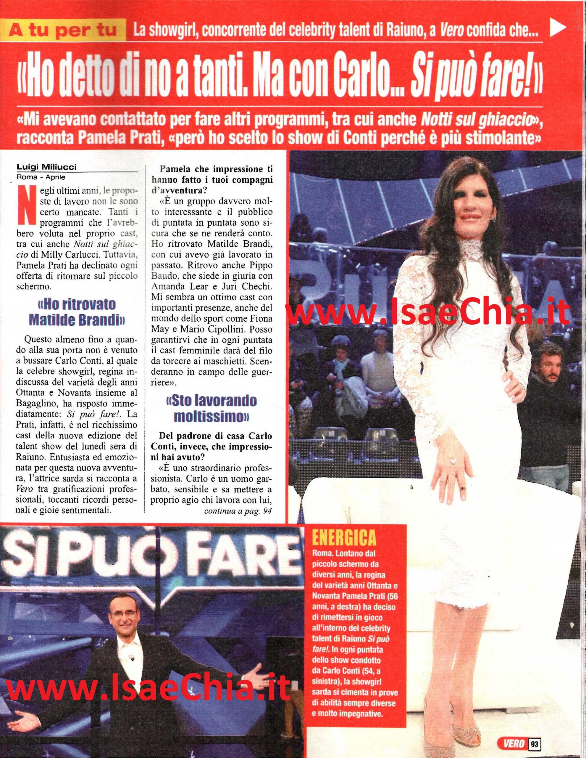 Negli ultimi anni le offerte di lavoro non le sono certo mancate, tra cui anche la partecipazione a Notti sul ghiaccio. Tuttavia, la showgirl Pamela Prati ha sempre rifiutato tutte…finché le è arrivata la proposta per Si può fare. “Il cast è un gruppo davvero interessante e il pubblico se ne renderà conto. Ho ritrovato Matilde Brandi, con cui ho già lavorato in passato. Ritrovo anche Pippo Baudo, che siede in giuria con Amanda Lear e Juri Chechi. Mi sembra un ottimo cast, con presenze importanti, tra cui anche atleti come Fiona May e Mario Cipollini. Posso garantirvi che in ogni puntata il cast femminile darà filo da torcere a quello maschile: scenderanno in campo delle guerriere! Carlo Conti, il conduttore, è uno straordinario professionista, un uomo garbato, sensibile, che sa mettere a proprio agio chi lavora con lui. Recentemente mi avevano proposto diversi show, tra cui Notti sul ghiaccio. Stimo molto Milly Carlucci, ma ho comunque declinato l’offerta, come tutte le altre. Invece ho detto subito di sì al programma di Carlo perché lo trovo molto stimolante. In ogni puntata ciascuno di noi deve cimentarsi con una diversa abilità ed è entusiasmante avere ogni volta una sfida diversa, un ostacolo da superare per capire fin dove ci si può spingere. Mi piacerebbe che il pubblico potesse ammirare una Pamela Prati che magari nemmeno io conosco. Mi sto impegnando molto, ogni volta che mi lancio in una sfida professionale lo faccio in modo totalizzante. Sono una professionista vecchio stampo: seria e precisa, mi chiudo per ore in sala prove. E’ un’ottima occasione per sfidare se stessi, i propri limiti e le proprie fobie. Le mie paure? Volare, soffro di claustrofobia e ho paura in situazioni in cui non ho il controllo, ma devo affidarmi ad altri“. In seguito, quando le si fa notare che il suo ritorno in tv era particolarmente atteso, Pamela risponde: “Sì, riparto da RaiUno e dagli studi della Dear, dove ho debuttato tanti anni fa come attrice: qui ho girato alcuni film all’inizio della mia carriera e mi sento come a casa. Ero una giovane ragazza che cercava di fare questo mestiere. Una volta mi chiamarono per un film che s’intitolava Il monsignore. Christopher Reeve era un prete e io dovevo sedurlo. Avevo 19 anni e ricordo ancora questa produzione e lui bellissimo, già famoso per Superman. Dedico i miei successi a mia madre, che oggi non c’è più. Ma è come se dal cielo mi dicesse “Ce la puoi fare”. Poi un grazie speciale va a Pierfrancesco Pingitore, che ha creduto in me. Quest’inverno siamo tornati al Salone Margherita con uno spettacolo, La grande risata, che ogni sera ha fatto il tutto esaurito“. Quando si nota che la sua bellezza è non solo evidente, ma anche naturale, a differenza di tante colleghe, la Prati commenta: “Ci sono tante persone che non sono medici e hanno rovinato molte donne. Io non mi sono rifatta nulla di recente sono diventata testimonial di una linea di prodotti estetici di origine rigorosamente naturale. La bellezza per me è prendersi cura di sé dall’interno. L’alimentazione è la parte più importante: io mangio frutta e verdura, poca carne e bianca, quinoa, pesce e niente glutine“. Infine, qualche parola sull’amore e sul suo compagno, Francesco, che ha qualche anno meno di lei: “Non c’entra nulla l’anagrafe, mi ha conquistato con l’intelligenza. Potrebbe avere anche cent’anni, è la testa che conta. In amore mi ritengo una donna-bambina: se si è troppo donna, si finisce per rompere le scatole. Idem se si è troppo bambine. Non a caso ho sempre avuto uomini o miei coetanei o un po’ più giovani“.