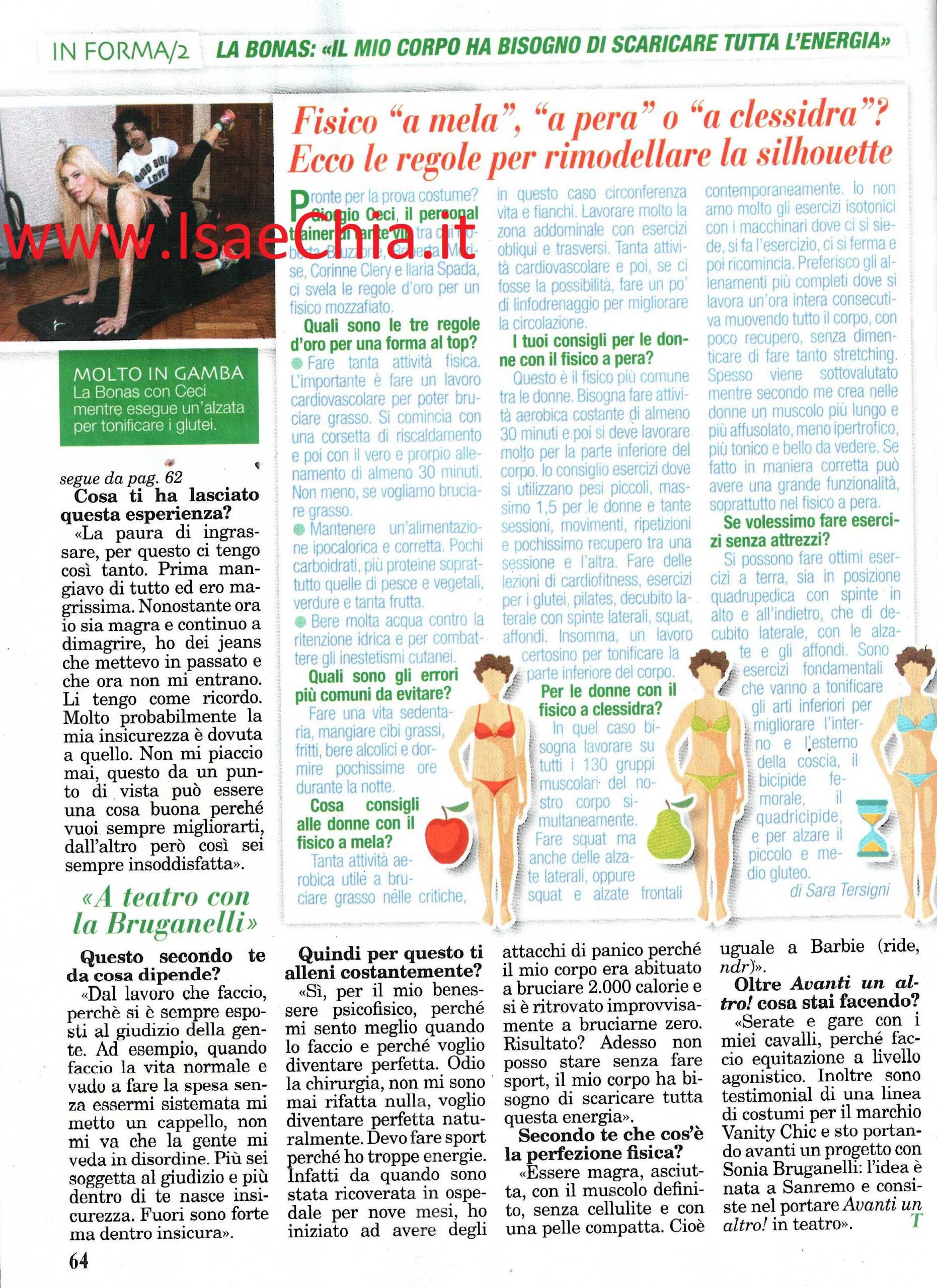 La bella Paola Caruso interpreta la Bonas nel programma di Paolo Bonolis Avanti un altro, ma ha esordito in tv anni fa come corteggiatrice a Uomini e Donne. Statuaria come sempre, la bionda trentenne rivela i segreti per mantenersi in splendida forma: “Per allenare e tonificare le fasce muscolari, utilizzo un giubbetto con l’elettrostimolazione, in questo modo mentre il gluteo lavora, nell’interno coscia si sente il muscolo che fatica tre volte di più e vedi i risultati di tre mesi di allenamento…in un mese! Mi piace percepire il mio corpo che reagisce agli stimoli, perché sono fissatissima con la linea. Ammetto che entro in paranoia se non sono perfetta. D’inverno mi lascio un po’ andare come tutti, ma d’estate proprio no! Un’altra tecnica che dà ottimi risultati è la vacuum terapia, usata dal mio personal trainer Giorgio Ceci: se l’avessi scoperta prima, ora sarei più magra!“. Ma quando le si chiede come mai tiene così tanto alla linea, lei racconta la triste storia che c’è dietro: “Quando sono caduta da cavallo è stata una tragedia: da quel momento il mio corpo è cambiato. Prima ero magra di costituzione, non avevo problemi di ritenzione ed avevo la pelle diversa. Sono stata tanti mesi ferma prendendo tante medicine, il mio metabolismo è cambiato e anche il mio corpo. Questa esperienza mi ha lasciato la paura di ingrassare. Prima mangiavo di tutto ed ero magrissima. Nonostante ora io sia magra e continui a dimagrire, ho dei jeans che mettevo in passato e che ora non mi entrano. Molto probabilmente l’insicurezza è dovuta a quello. Non mi piaccio mai. Questo da un punto di vista può essere positivo, perché vuoi sempre migliorarti. Dall’altro, però, così sei sempre insoddisfatta. Ciò dipende anche dal lavoro che faccio, perché si è sempre esposti al giudizio della gente. Ad esempio, quando vado a fare la spesa senza essermi sistemata, metto un cappello, non mi va che la gente mi veda in disordine. Più sei soggetta al giudizio e più dentro di te nasce l’insicurezza. Mi alleno per il mio benessere psicofisico, perché mi sento meglio quando lo faccio e perché voglio diventare perfetta. Odio la chirurgia, non mi sono mai rifatta nulla, voglio diventarlo naturalmente. Inoltre, devo fare sport perché ho troppe energie. Infatti, da quando sono stata ricoverata in ospedale per nove mesi, ho iniziato ad avere degli attacchi di panico, perché il mio corpo era abituato a bruciare 2000 calorie e si è ritrovato improvvisamente a bruciarne zero. Risultato? Adesso non posso stare senza fare sport, il mio corpo ha bisogno di scaricare tutta questa energia“. Infine, quando le si chiede cosa sta facendo oltre Avanti un altro, Paola risponde: “Serate e gare con i miei cavalli, perché faccio equitazione a livello agonistico. Inoltre sono testimonial di una linea di costumi per il marchio Vanity Chic e sto portando avanti un progetto con Sonia Bruganelli, moglie di Bonolis ed autrice televisiva. L’idea è nata a Sanremo e consiste nel portare Avanti un altro a teatro!“.