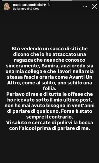 Le parole di Paola hanno subito avuto un grande eco sui social e quindi la Caruso ha deciso di spiegare ciò a cui si riferiva, smentendo che il suo sfogo fosse una frecciatina rivolta a Samira: