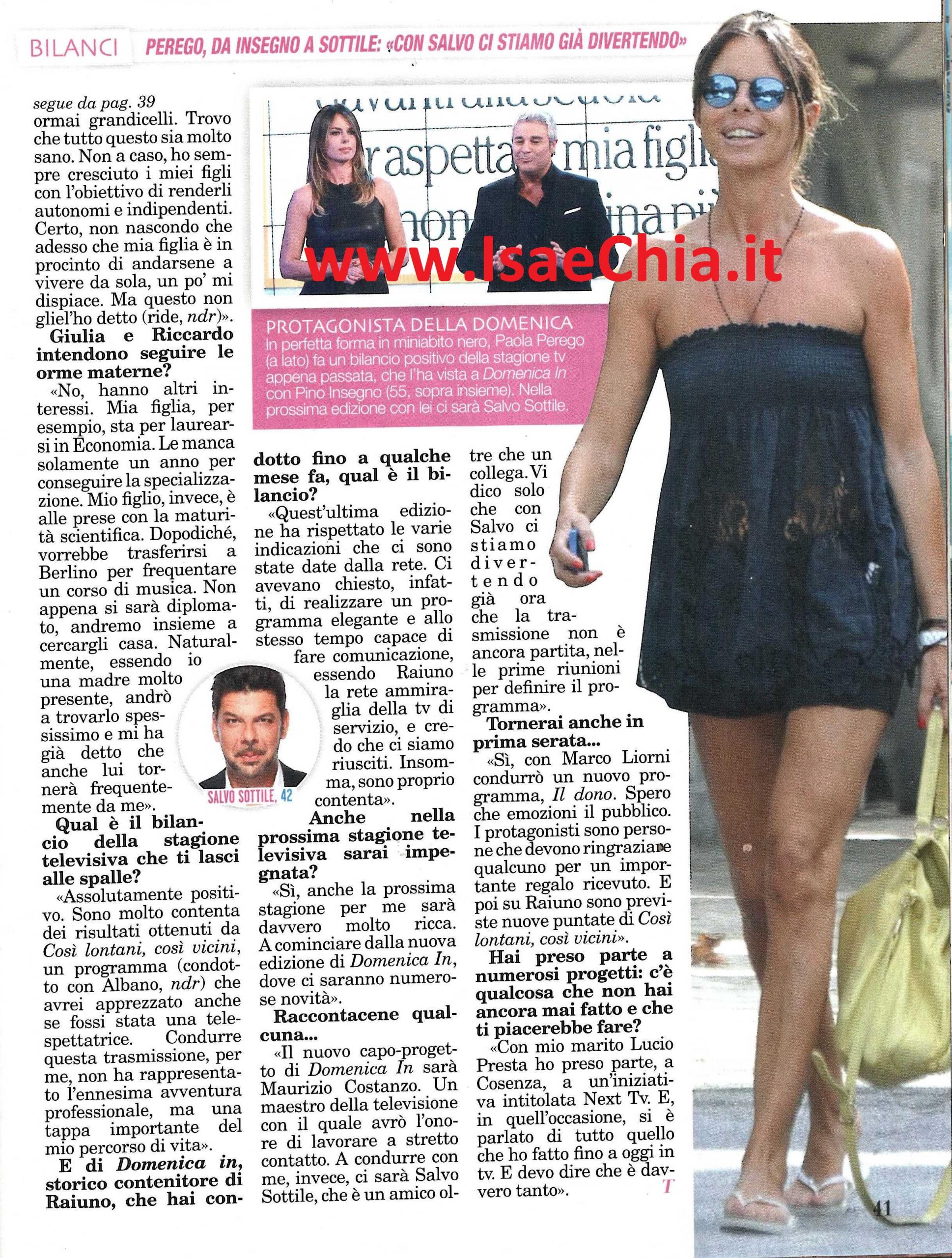 Nella prossima stagione televisiva, Paola Perego sarà la protagonista di Raiuno, con la conduzione dei ben tre programmi. A chi l’accusa di aver fatto successo grazie al marito e manager Lucio Presta, la conduttrice però ricorda che lei lavora in tv da ben 33 anni e quindi da molto prima di averlo conosciuto (QUI per rileggere la sua intervista). Nel frattempo, si gode le vacanze con lui a Forte dei Marmi, dove è raggiante avvolta in un prendisole rosa. Quando le si fa notare che non è facile conciliare gli impegni privati con quelli professionali, lei risponde: “In realtà ci sono sempre riuscita. Basta organizzarsi, il tempo lo si trova sempre. Adesso che i miei figli Giulia e Riccardo sono grandi, è diventato ancora più facile: se ne vanno in giro per conto loro e mi lasciano sempre sola! In tutta sincerità, non mi dispiace, mi sarei preoccupata del contrario, visto che sono grandicelli ormai. Trovo tutto questo molto sano e li ho sempre cresciuti con l’obiettivo di renderli indipendenti. Certo, non nascondo che ora che mia figlia è in procinto di andare a vivere da sola, mi dispiace…Ma questo non gliel’ho detto! Sta per laurearsi in Economia e le manca solo un anno per la specialistica. Riccardo, invece, è alle prese con la maturità scientifica e poi vorrebbe trasferirsi a Berlino per seguire un corso di musica. Naturalmente, andrò a trovarlo spesso e lui mi ha promesso che tornerà di frequente da me“. Quanto al lato professionale, Paola tira un bilancio tutto positivo: “Sono molto contenta dei risultati ottenuti da Così lontani, così vicini, il programma condotto con Al Bano, che ha rappresentato un’ennesima avventura professionale, ma una tappa importante nella mia vita. Per Domenica In ci avevano chiesto un programma elegante e al contempo capace di fare comunicazione e credo che ci siamo riusciti. Ci sarò anche nella prossima stagione, che sarà ricca di novità: il capo-progetto sarà Maurizio Costanzo, un maestro della televisione, con cui avrò modo di lavorare a contatto. A condurre con me, invece, ci sarà Salvo Sottile, un amico oltre che collega: ci stiamo divertendo già solo ad andare alle riunioni insieme! Con Marco Liorni condurrò Il dono, un nuovo programma in cui i protagonisti possono ringraziare qualcuno per un importante regalo ricevuto. Durante un’iniziativa a cui ho preso parte con mio marito, si è parlato di tutto quello che ho fatto in tv. E devo dire che è davvero tanto!“.