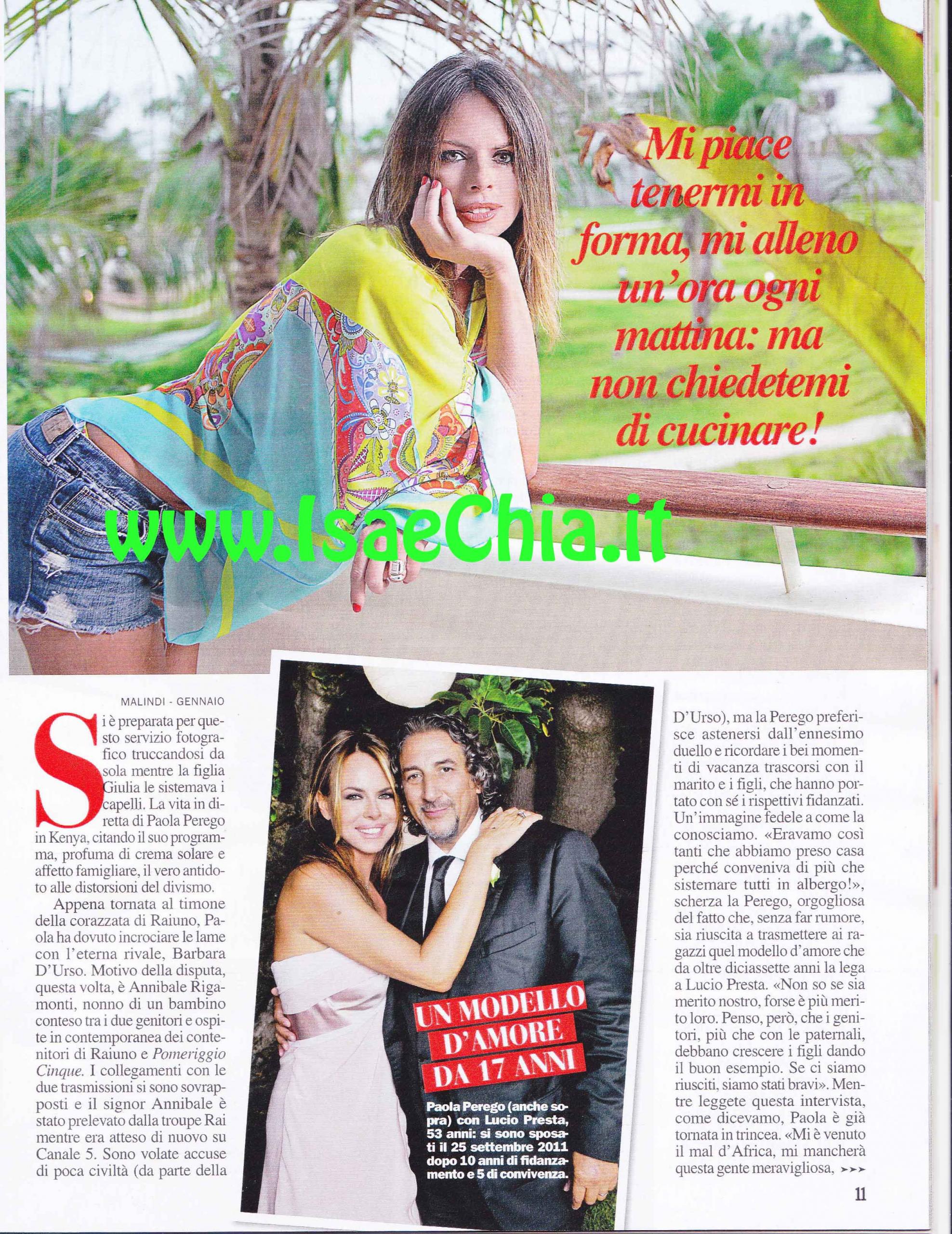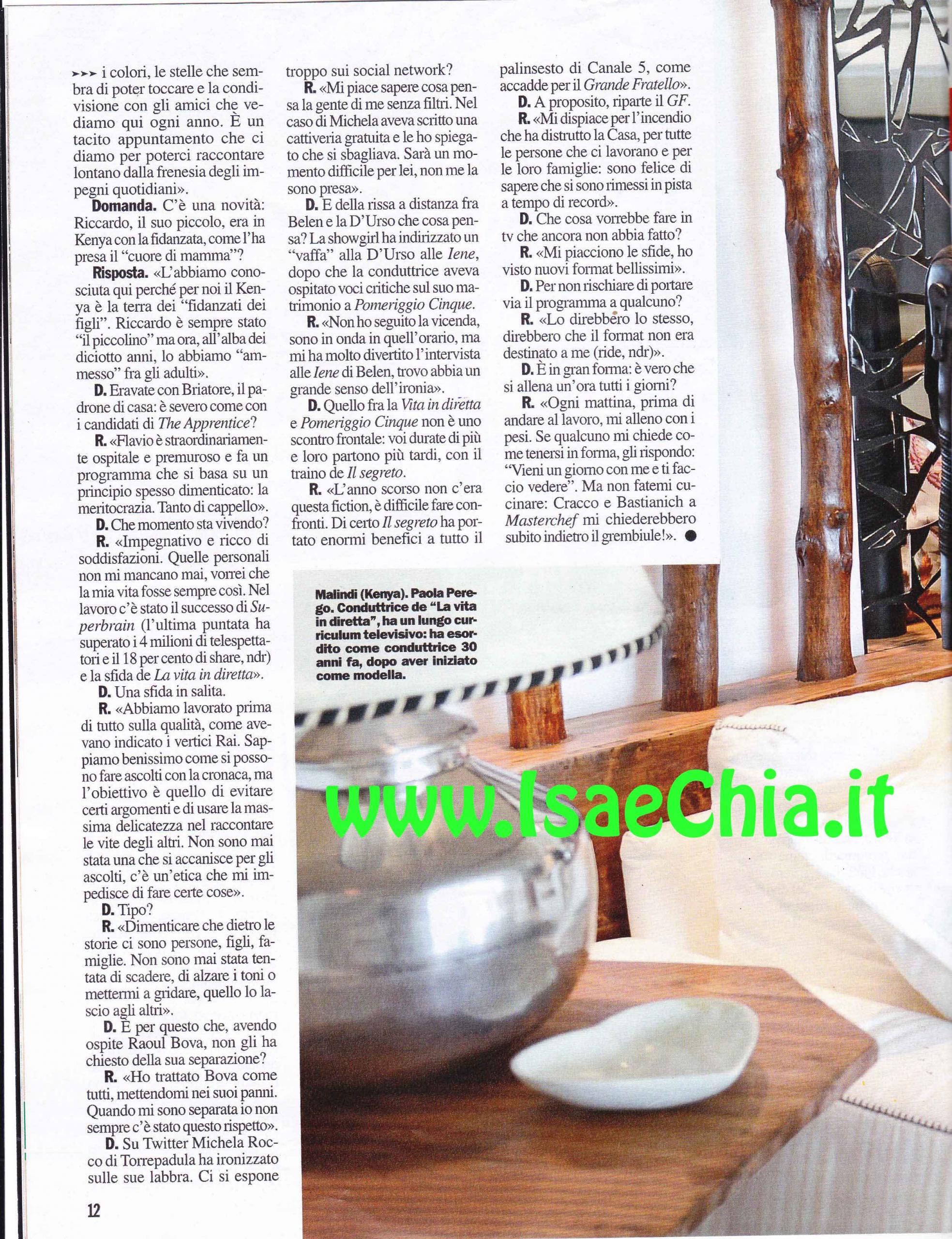 La conduttrice Paola Perego è da poco passata alla Rai, ma ha dovuto vedersela con la rivale Barbara D’Urso per accaparrarsi lo stesso ospite, Annibale Rigamonti, nonno di un bambino conteso tra due genitori, che aveva dato il consenso per la partecipazione ai programmi di entrambe. I collegamenti delle due trasmissioni, però, si sono sovrapposti e il signor Annibale è stato prelevato dalla troupe Rai mentre era ancora atteso dalla D’Urso. Quest’ultima ha accusato la rivale di poca civiltà, ma la Perego ha preferito dimenticare tutto rilassandosi in Kenya: “Eravamo così tanti che abbiamo preso casa anziché un albergo”, spiega lei, che da 17 anni è legata a Lucio Presta. “Penso che i genitori, più che con le paternali, debbano crescere i figli dando il buon esempio. Se ci siamo riusciti, siamo stati bravi. Quello che ci diamo in Kenya è un tacito appuntamento per stare lontani dalla frenesia degli impegni quotidiani. Abbiamo conosciuto anche la fidanzata di nostro figlio Riccardo, che, all’alba dei 18 anni, è stato “ammesso” tra gli adulti. Eravamo in vacanza con Flavio Briatore, che è straordinariamente ospitale. Il suo programma The Apprentice si basa sulla meritocrazia: tanto di cappello. Sto vivendo un momento impegnativo, ma ricco di soddisfazioni, come il successo di Superbrain. A La vita in diretta abbiamo lavorato sulla qualità: si può fare share con la cronaca, ma noi scegliamo di evitare certi argomenti e di usare la massima delicatezza. C’è un’etica che mi impedisce di dimenticare che dietro certe storie ci sono figli e famiglie. Non sono mai stata tentata di scadere e alzare i toni. Quando ho avuto come ospite Raoul Bova, non gli ho chiesto della separazione perché mi sono messa nei suoi panni: quando mi sono separata io non c’è stato questo rispetto”. Quando le si chiede del “Vaffa” in diretta che Belén Rodriguez ha dedicato alla D’Urso, la Perego risponde: “Non ho seguito la vicenda, ma ho trovato simpatica l’intervista di Belén. Trovo abbia un grande senso dell’ironia. Mi dispiace per l’incendio che ha distrutto la Casa del Grande fratello, per tutte le persone che vi lavorano, ma sono felice che si siano rimessi a posto in tempo di record. Mi piacciono le sfide, ho visto dei nuovi format bellissimi. Non rischio di portare via il programma a nessuno, anche se direbbero comunque che non era destinato a me!”