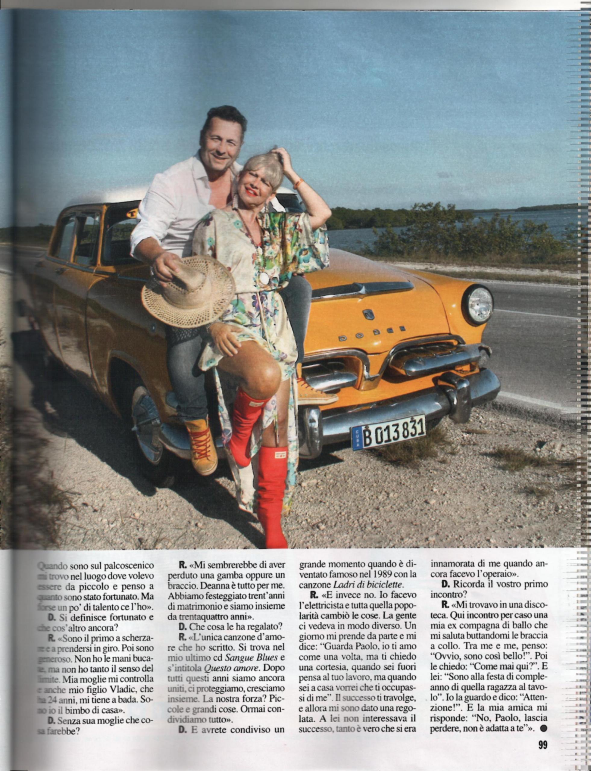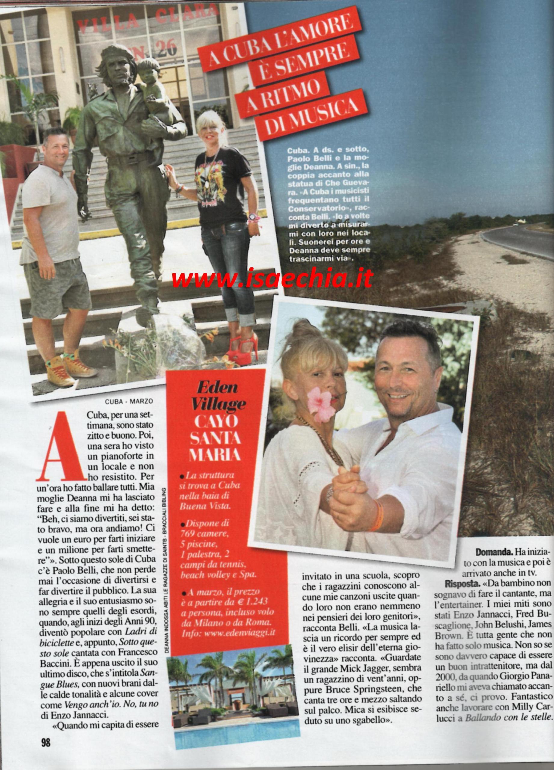 Paolo Belli ha raggiunto il successo con canzoni come Sotto questo sole e Ladri di biciclette negli anni ’90, mentre oggi è alla guida della band di Ballando con le stelle. Ma ora si gode il periodo di pausa, con un secondo viaggio di nozze a Cuba con la moglie Deanna: “A Cuba, per una settimana, sono stato zitto. Poi, una sera, ho visto un pianoforte in un locale e non ho resistito. Per un’ora ho fatto ballare tutti. Mia moglie mi ha lasciato fare, ma poi mi ha detto: “Ci siamo divertiti, ma ora andiamo! Ci vuole un euro per farti partire e un milione per farti smettere!”. Intervistato sulla sua carriera, poi, racconta: “Da bambino sognavo di fare l’entertainer; non so se ne sono capace, ma da quando Giorgio Panariello mi ha chiamato accanto a sé, ci provo. E’ fantastico anche lavorare a Ballando. Quando sono sul palcoscenico mi trovo nel luogo dove volevo essere da piccolo e penso a quanto sono fortunato. Forse un po’ di talento ce l’ho. Sono il primo a scherzare e a prendersi in giro. Poi sono generoso: mi controllano mia moglie e mio figlio Vladic. Mia moglie è tutto per me: senza di lei mi sembrerebbe di aver perso un braccio o una gamba. Abbiamo festeggiato 30 anni di matrimonio e stiamo insieme da 34. Quando arrivò la popolarità, sono cambiate molte cose, perché prima facevo l’elettricista. Un giorno lei mi ha detto: “Quando siamo fuori pensa al tuo lavoro, ma quando sei a casa, vorrei ti occupassi di me”. Il successo ti travolge, allora mi sono dato una regolata. A lei non interessava il successo, infatti si è innamorata di me quando facevo l’operaio. Mi trovavo in una discoteca e c’era una festa di compleanno. Una mia amica mi indicò la festeggiata, che era mia moglie e io dissi “Attenzione!”, ma la mia amica disse: “No, Paolo, lascia perdere, non è per te”!