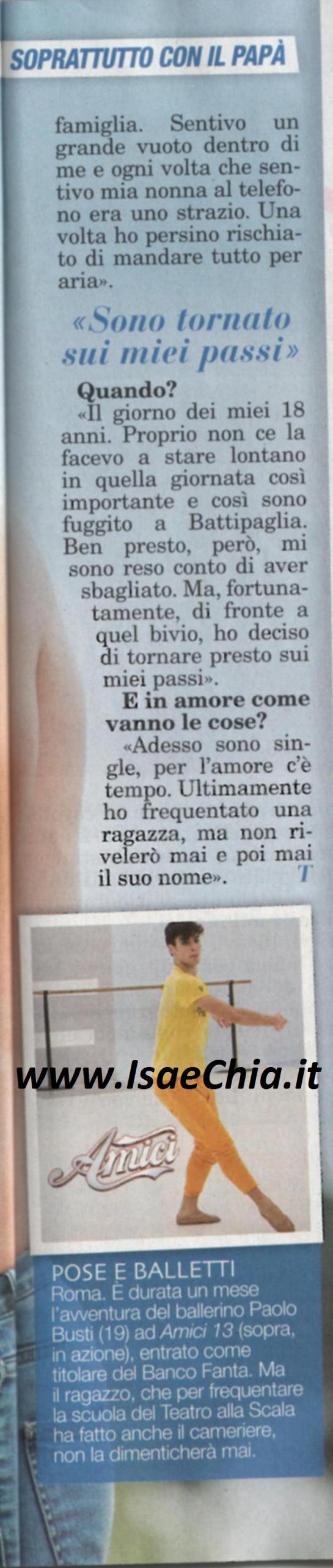 Il ballerino Paolo Busti non è riuscito ad ottenere l’accesso alla fase serale di Amici. Il ragazzo, originario di Battipaglia (SA), commenta: “Sono molto dispiaciuto, perché credo di avercela messa tutta. Purtroppo mi rendo conto di non esser riuscito ad esprimermi come volevo. Nonostante questo, sono felice di aver partecipato a questo talent, anche per il solo fatto di aver conosciuto Maria De Filippi. Lei è una fuoriclasse. Non dimenticherò mai l’11 gennaio, quando ho vinto il Banco Fanta. Da piccolo giocavo con gli amici a pallone, ma poi ho capito che la mia passione era un’altra: niente mi dava più emozioni della danza. Quando comunicai a mio padre che avrei voluto fare il ballerino, lui non la prese molto bene. Probabilmente si augurava per me un’altra professione, magari più sicura o che avessi gli stessi interessi dei miei amichetti. Poi, però, sono riuscito a dimostrargli che non era un capriccio. Con caparbietà e determinazione ho inseguito il mio sogno e a soli 14 anni mi sono trasferito a Napoli per studiare al Teatro San Carlo. Mentre i miei amici erano spensierati, io studiavo ore e ore, ma ho raccolto i miei frutti, come esibirmi al Teatro alla Scala di Milano. Ho lavorato come cameriere, ma sono riuscito anche a diplomarmi, ma sono giunto a questo risultati a denti stretti: la lontananza dalla mia famiglia era una sofferenza e ogni telefonata a mia nonna uno strazio. Il giorno dei miei 18 anni stavo per mandare tutto all’aria: non ce la facevo a stare lontano dalla mia famiglia e sono fuggito da loro. Poi, però, messo davanti a un bivio, sono tornato sui miei passi”. Infine, quando gli si chiede dell’amore, risponde: “Adesso sono single. Ultimamente sto frequentando una ragazza, ma non rivelerò mai il suo nome”.