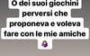 O dei suoi giochini perversi che proponeva e voleva fare con le mie amiche. […] Sì, ora cominciate con la solita cagata “ti vuoi fare pubblicità” non mi tocca proprio. Male non fare, paura non avere. […] Non mi interessa il mondo dello spettacolo. Ho il mio lavoro che amo da morire e mi porta tanti soldi.