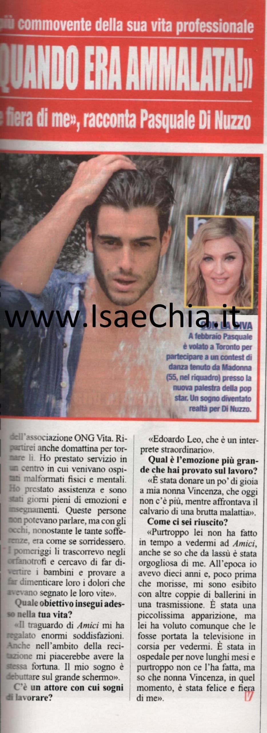 Pasquale Di Nuzzo, concorrente tra i ballerini di Amici 12, ha vinto il Premio Filottete 2014 e sta vivendo un’estate piena di impegni: “Sono alle prese con dei progetti lavorativi legati sia alla tv che alla danza e parallelamente sto facendo dei provini per il cinema: la stessa determinazione che ho usato per la danza, la sto usando per questo sogno. Non mi pesa rinunciare alle vacanze: quando hai la fortuna di fare ciò che ami, ogni giorno, anche il lavoro più faticoso è come una vacanza. Proprio di recente ho avuto una grande soddisfazione: il premio Filottete ricevuto a Cirò Marina. E’ stato bellissimo essere su quel palco insieme a tante persone del mondo della cultura, dello spettacolo e del giornalismo. Ero il più giovane e il più emozionato. Mentre stringevo quel riconoscimento, mi sono venuti i brividi, perché nella mia mente ho ripercorso il cammino fatto finora, compresi i sacrifici fatti dai miei genitori: anche quando hanno avuto difficoltà economiche, si sono privati di qualcosa loro, piuttosto che negarla a me. Mi hanno mantenuto quando ero a Reggio Emilia, anche se lì ero grandicello e mi sono rimboccato le maniche: ho fatto l’animatore nelle feste per bambini, mi caricavo un sacco di giocattoli e giravo la città in autobus”. Inoltre, Pasquale racconta un’esperienza che gli è rimasta nel cuore: “L’estate più bella della mia vita è stata in India, quando sono partito per l’associazione ONG vita: ho reso servizio in un centro in cui erano ospitati malformati fisici e mentali. Queste persone non potevano parlare, ma era come se sorridessero con gli occhi. Inoltre andavo a trovare i bambini negli orfanotrofi, cercando di farli divertire”. Infine, i progetti futuri: “Spero di avere lo stesso successo nella recitazione e di debuttare sul grande schermo. Vorrei lavorare con Edoardo Leo, che è un attore straordinario. Ma l’emozione più grande che il mio lavoro mi ha regalato è stato donare felicità a mia nonna Vincenza, che oggi non c’è più, mentre affrontava una lunga malattia. Non ha fatto in tempo a vedermi ad Amici, ma so che da lassù è orgogliosa di me. A 10 anni, poco prima che morisse, ho partecipato in coppia ad un altro programma televisivo. Anche se era un’apparizione piccolissima, lei ha voluto che le fosse portata la tv in ospedale per vedermi: so che in quel momento è stata fiera di me”.