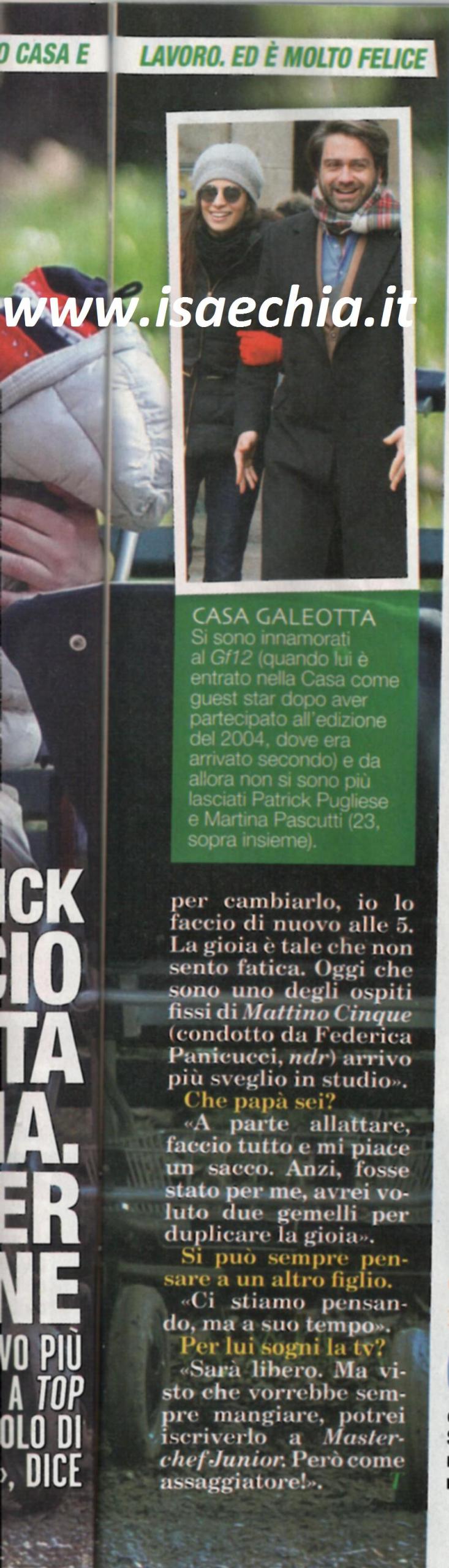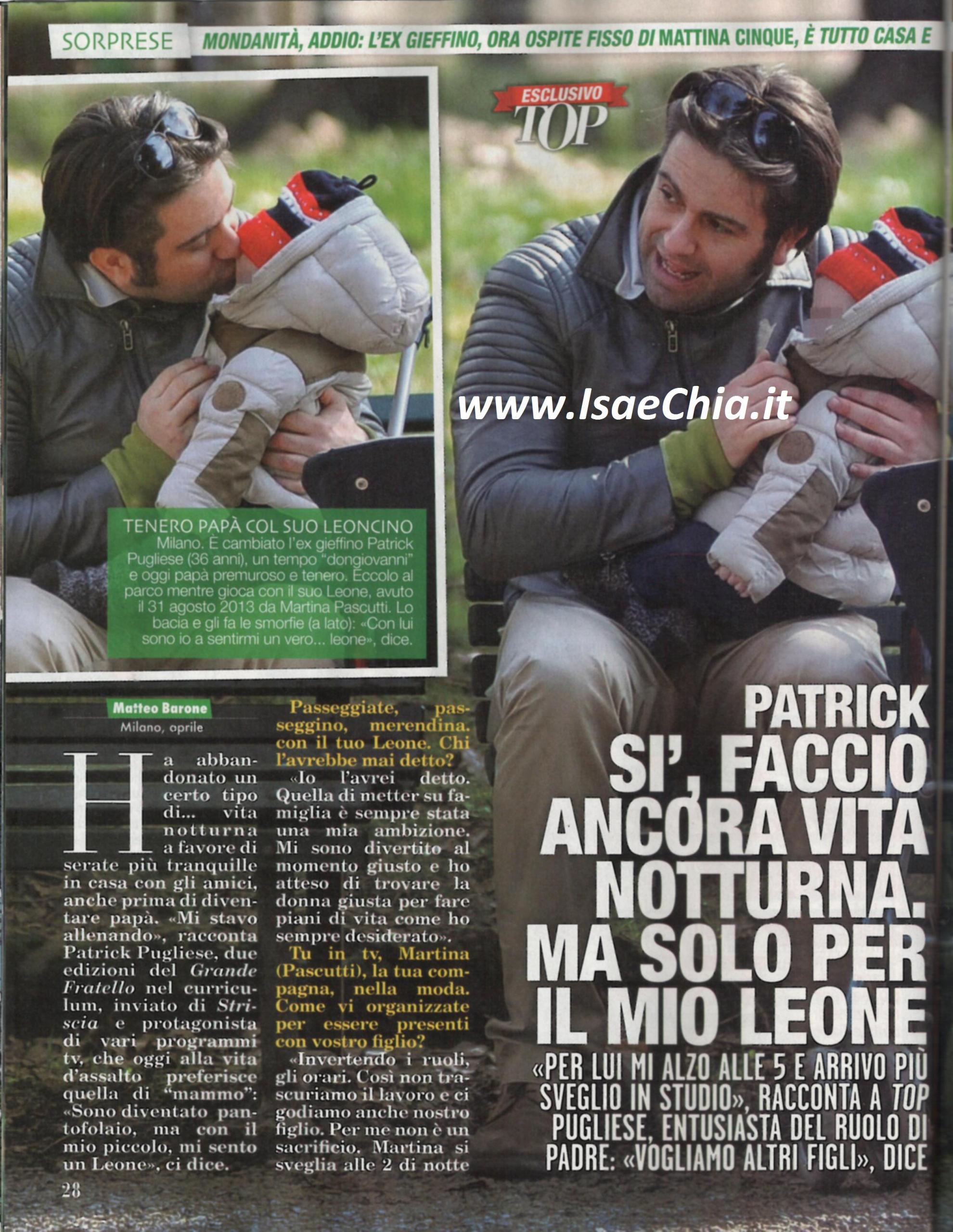 Patrick Ray Pugliese ha partecipato per ben due volte al Grande fratello e la seconda volta ha conosciuto Martina Pascutti, dalla quale ha avuto suo figlio Leone. Fotografato in un parco di Milano in compagnia dell’erede mentre lo bacia teneramente, si scopre un Patrick nuovo. E quando gli si chiede se l’avrebbe mai immaginato, risponde: “Io l’avrei detto. Quella di metter su famiglia è sempre stata una mia ambizione. Mi sono divertito al momento giusto e ho atteso di trovare la donna giusta per fare piani di vita come ho sempre desiderato. Io e Martina ci siamo organizzati invertendo gli orari: lei si alza alle 2 di notte, per cambiarlo, io lo faccio alle 5. Ma la gioia è tale che non sento fatica. Oggi che sono uno degli ospiti di Pomeriggio Cinque, arrivo più sveglio in studio. A parte allattare, faccio tutto e mi piace un sacco. Anzi, fosse stato per me, avrei fatto due gemelli per duplicare la gioia”. Così, quando gli si chiede se pensano ad un altro figlio, risponde: “Ci stiamo pensando, ma a suo tempo. Leone sarà libero di scegliere, per lui non sogno la tv. Ma visto che vorrebbe sempre mangiare, potremmo iscriverlo a Masterchef, come assaggiatore!”