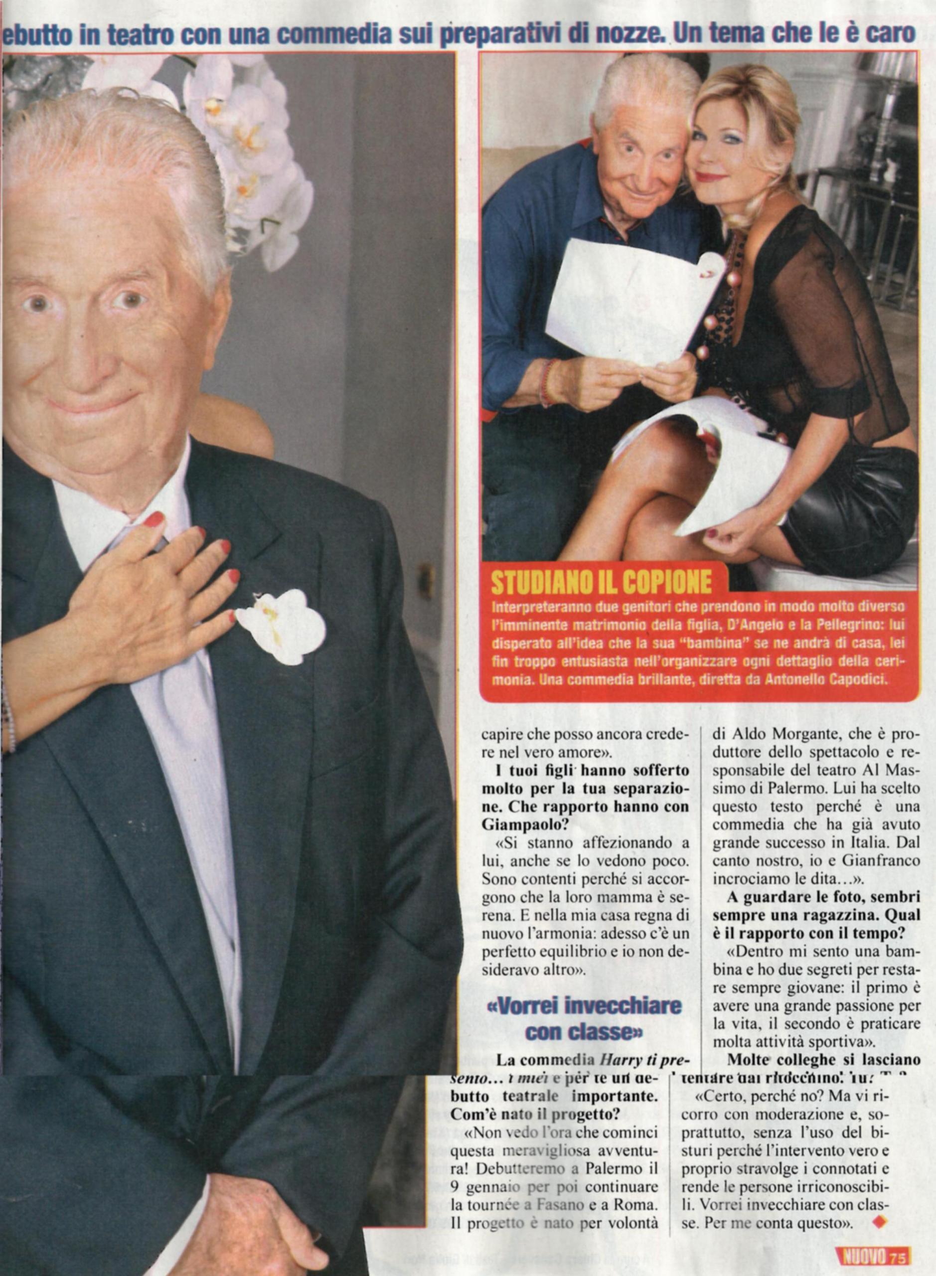 A teatro cerca di convincere il marito delle nozze della figlia e nella realtà parla continuamente di “fiori d’arancio”: l’ex naufraga Patrizia Pellegrino, al momento impegnata con Harry ti presento…i miei, rivela: “Sto ristrutturando la mia villa, per renderla disponibile al grande giorno”. Così, quando le si chiede se sta pensando di sposare il suo attuale compagno, Giampaolo Embrione, appena otterrà il divorzio dall’ex marito Stefano Todini, risponde: “No, è ancora presto! Sono impegnata con un altro progetto: voglio aprire la mia bellissima casa sull’Appia antica al mercato dei matrimoni e dei grandi eventi. E’ una struttura troppo bella per essere goduta solo dalla mia famiglia, così chiunque volesse organizzare nozze da favola, potrà farlo nella mia villa”. Invece, quando le si chiede del suo nuovo amore, racconta: “Ho tanti progetti, ma poche certezze. Vorrei vivere giorno per giorno questa relazione, perché quando facevo progetti “per sempre”, non è andata bene. Prima era un amore vissuto solo nei weekend, adesso ci vediamo più spesso e ci stiamo conoscendo sempre meglio. E’ solo grazie a Giampaolo che sto superando la diffidenza che negli ultimi anni avevo nei confronti del genere maschile; mi sta facendo capire che posso ancora credere negli uomini. I miei figli si stanno affezionando a lui, anche se lo vedono ancora poco. Sono contenti perché vedono la loro mamma serena”. Infine, parla dei suoi progetti lavorativi: “Non vedo l’ora che inizi quest’avventura con Harry ti presento…i miei, che inizierà a gennaio a Palermo. Il responsabile Aldo Morgante ha scelto questo testo perché ha avuto già un grande spettacolo in Italia e io e Gianfranco D’Angelo, mio partner in questo show, incrociamo le dita! Dentro mi sento ancora una bambina e ho due segreti per restare sempre giovane: una grande passione per la vita e praticare molta attività sportiva. I ritocchini? Certo, perché no? Vi ricorro con moderazione, senza l’uso del bisturi, perché l’intervento stravolge i connotati. Vorrei invecchiare con classe; per me conta questo”.