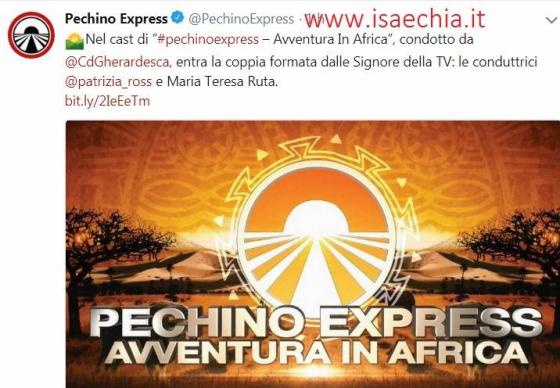 Prenderà il via il prossimo settembre su Rai Due la settima edizione di Pechino Express, l’adventure game che vedrà al timone per il sesto anno consecutivo Costantino della Gherardesca si sposterà per la prima volta in Africa e vedrà otto nuove coppie di concorrenti sfidarsi in ogni tappa per raggiungere la meta designata, tra pochi confort e molti disagi.