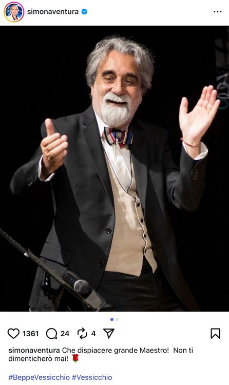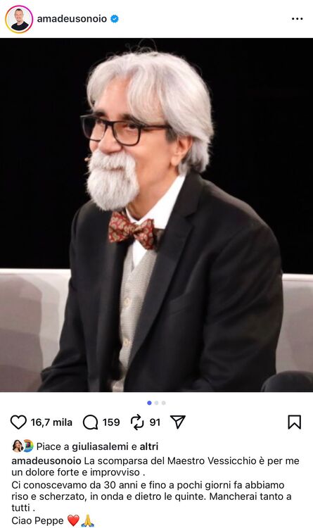 La scomparsa del Maestro Peppe Vessicchio è per me un dolore forte e improvviso. Ci conoscevamo da 30 anni e fino a pochi giorni fa abbiamo riso e scherzato, in onda e dietro le quinta. Mancherai tanto a tutti. Ciao Peppe. – Amadeus
