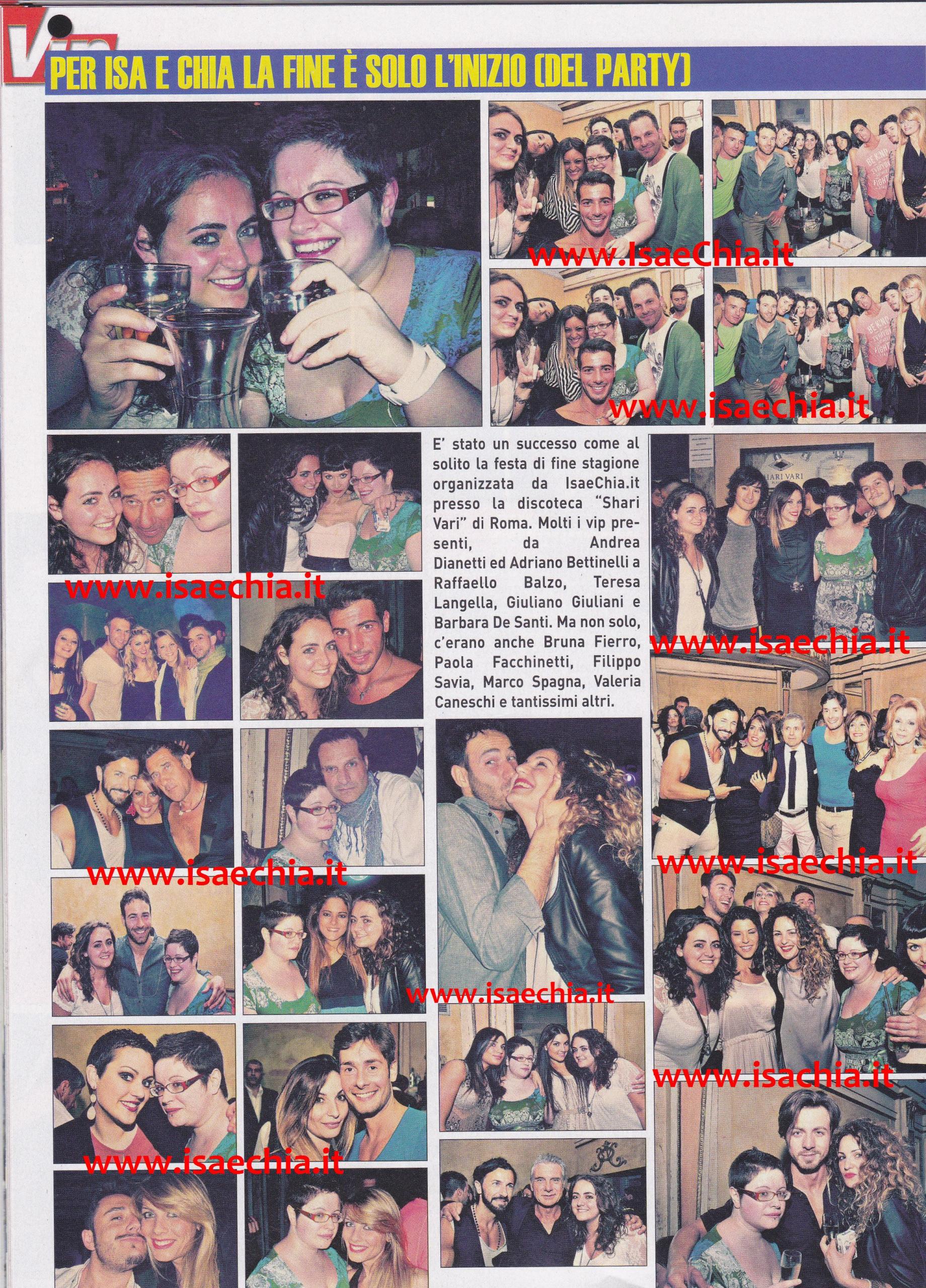 La festa di fine stagione organizzata dalle moderatrici del nostro sito www.IsaeChia.it, Isabella Benanti e Chiara Bonati, allo Shari Vari di Roma è stata un tale successo che anche la rivista Vip Mese ne ha preso atto e ne ha pubblicato le foto. All’evento erano presenti tantissimi volti dell’ultima edizione di Uomini e donne, in primis la bella corteggiatrice di Eugenio Colombo, Eleonora Mandaliti e l’ex corteggiatrice di Diego Ciaramella Martina Giuffrida. Ma c’erano anche tanti protagonisti del Trono Over, come Karine Leclère, Gianluca Pannullo, Antonio Jorio, Domenico Longo, Lapo Treu, Barbara De Santi, Giuliano Giuliani, Maria Botti e Bruna Fierro, e tanti del Trono Ragazzi e ragazze, come Valerio Lippolis e Anna Puca o Aldo Palmieri. Presenti anche concorrenti di Mammoni e di Amici, come Adriano Bettinelli e Andrea Dianetti.