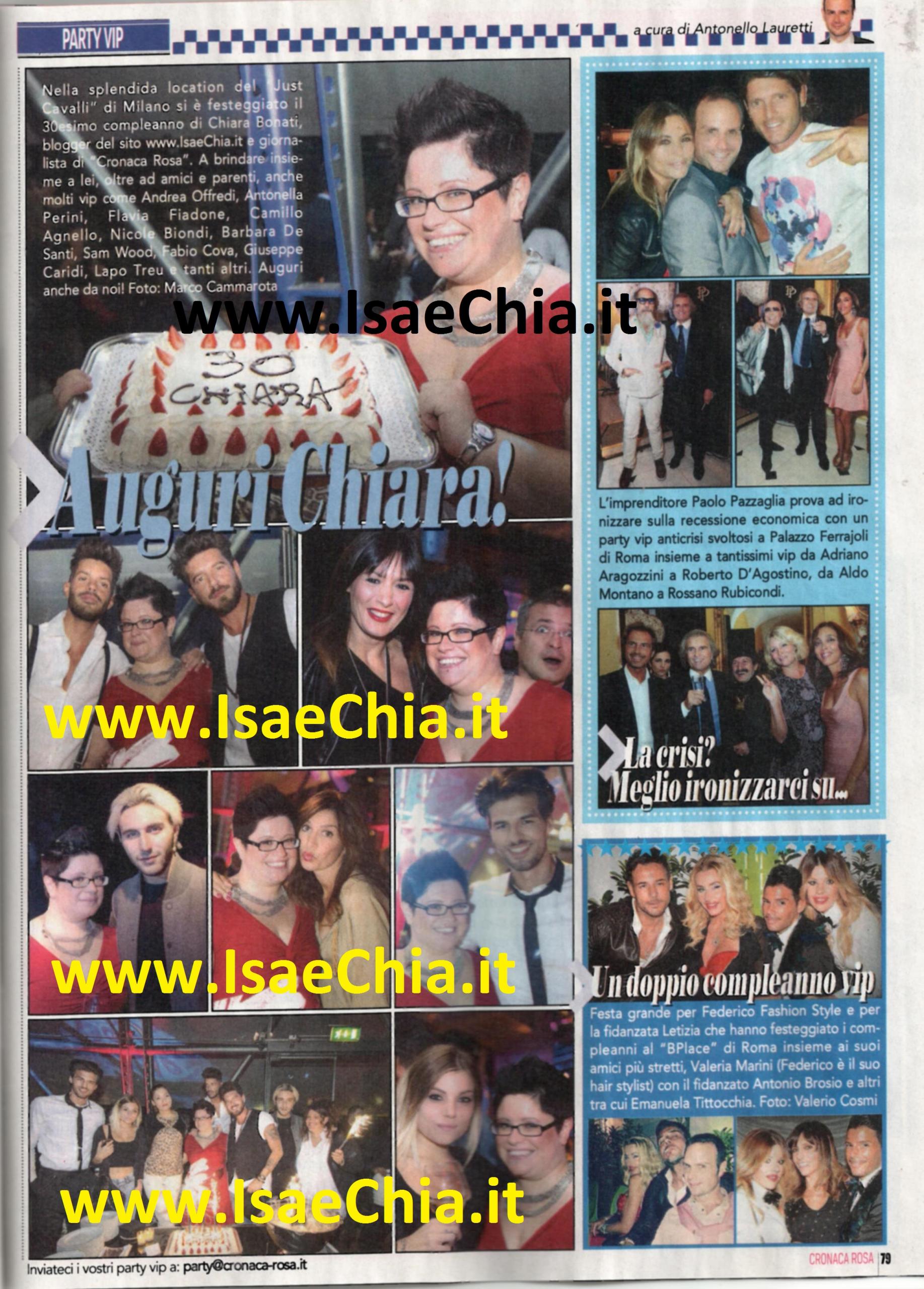 La proficua collaborazione tra la nostra Chiara Bonati, fondatrice insieme a Isabella Benanti del blog www.IsaeChia.it, e la rivista mensile di gossip Cronaca Rosa continua a gonfie vele. Questo mese, la rivista ha scelto di dedicarle un articolo per farle gli auguri per il suo trentesimo compleanno, per il quale Chia ha dato una grande festa al Just Cavalli di Milano. Tra i presenti all’evento c’erano, oltre ad amici e parenti, anche gli ex tronisti Andrea Offredi e Antonella Perini, gli ex corteggiatori Flavia Fiadone, Camillo Agnello e Nicole Biondi e alcuni protagonisti del Trono Over, come Barbara De Santi, Sam Wood, Fabio Cova, Giuseppe Caridi e Lapo Treu…E tanti altri! Per guardare tutte le foto dell’evento clicca QUI.