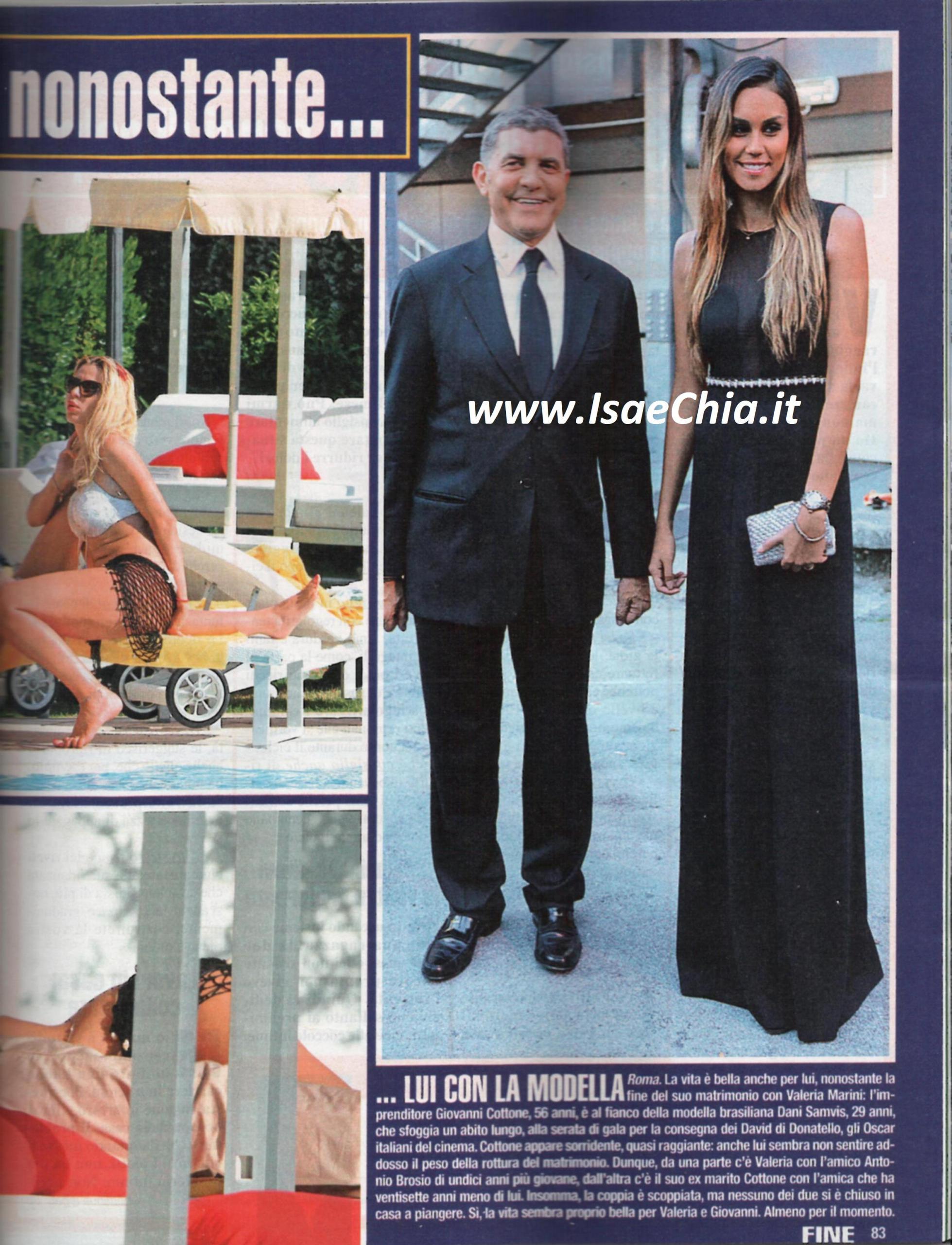 Il matrimonio “flash” di Valeria Marini e Giovanni Cottone è finito nel giro di meno di un anno e pare che tra le tante cause della rottura ci sia anche il nuovo uomo che da un po’ si vede al fianco dell’ex naufraga: si tratta di Antonio Brosio, volto non del tutto nuovo perché è stato corteggiatore a Uomini e donne. Valeria, infatti, sorride a bordo piscina con il suo bel fusto, che ha ben 11 anni meno di lei. Nella piscina di un lussuoso hotel di Roma, Valeria si spalma la crema solare mentre lui la guarda, poi sonnecchia sul lettino al suo fianco. Nei giorni scorsi, lei avrebbe fatto una scenata di gelosia durante una serata perché lui guardava un’altra. Insomma, la Valeriona nazionale sembra già cotta di nuovo e pare aver dimenticato la burrascosa chiusura del suo matrimonio. D’altro canto, per l’ex marito la vita non è meno bella: alla serata di gala per la consegna del David di Donatello si è fatto fotografare in compagnia della modella brasiliana Dani Samvis, 29 anni!
