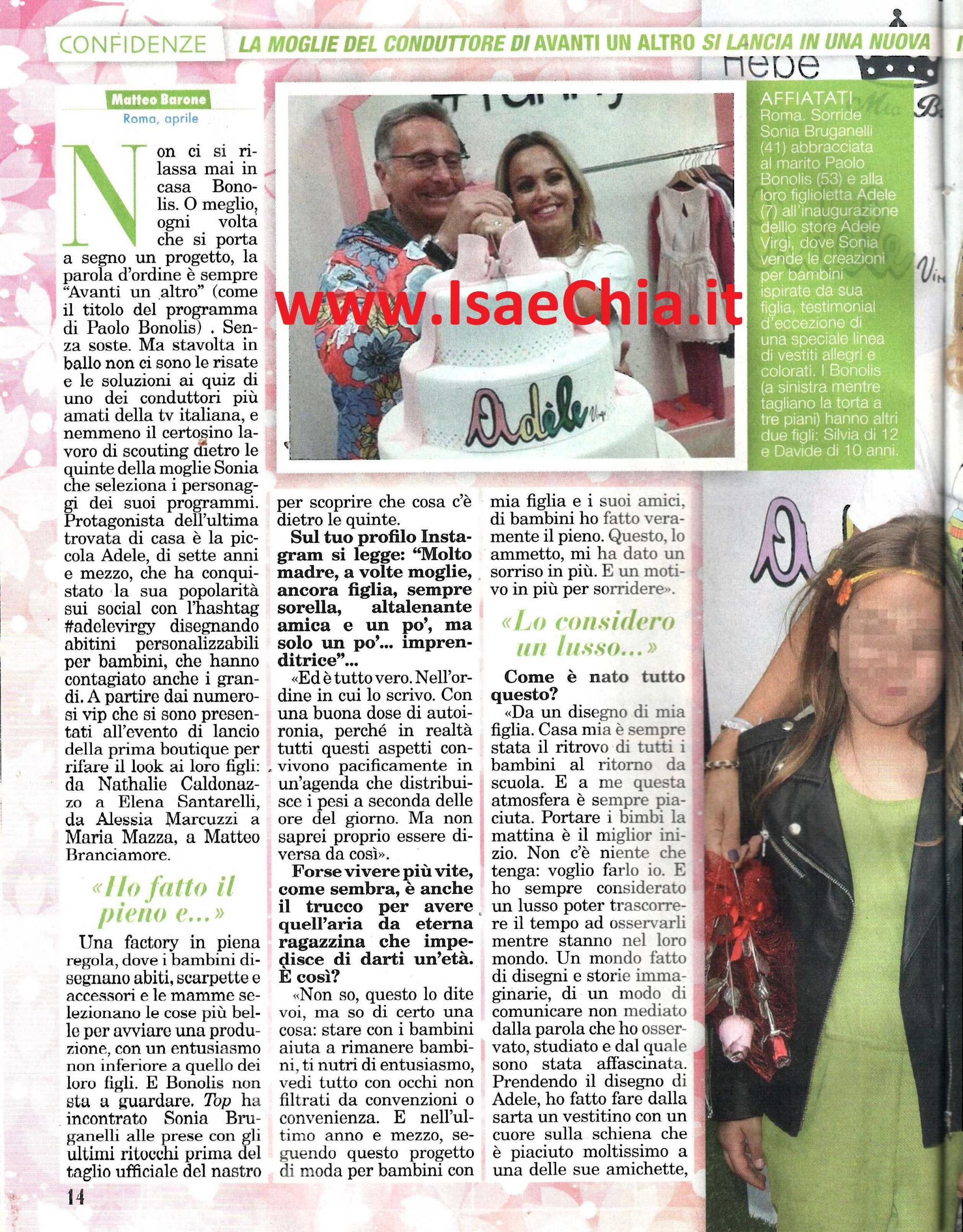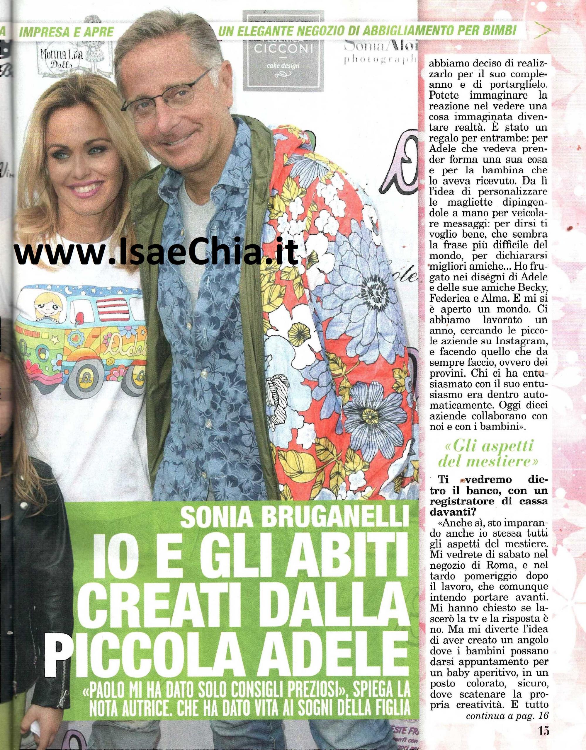 “Molto madre, a volte moglie, ancora figlia, sempre sorella, altalenante amica e un po’, ma solo un po’…imprenditrice”. Così si definisce Sonia Bruganelli, moglie del conduttore Paolo Bonolis, sul suo profilo Instagram. La signora Bonolis, infatti, oltre a lavorare nei casting, dietro le quinte dei programmi televisivi ha creato una linea d’abbigliamento per bambini grazie alle idee della figlia, la piccola Adele. “E’ tutto vero, sono tutte quelle cose, nell’ordine in cui le scrivo e con una buona dose di autoironia, perché tutti questi aspetti convivono pacificamente in un’agenda che distribuisce i pesi a seconda delle ore del giorno. Ma non saprei proprio essere diversa da così“. A quanto pare, vivere tutte queste vite insieme, è il suo trucco per sembrare sempre una ragazzina! Quando glielo si dice, lei risponde: “Non so, questo lo dite voi, ma di certo so una cosa: stare con i bambini aiuta a rimanere bambini ti nutri di entusiasmo e vedi tutto non filtrato da convenienza e convinzioni. E nell’ultimo anno e mezzo, seguendo questo progetto di moda per bambini con mia figlia e i suoi amici, di bambini ne ho fatto veramente il pieno. Questo, lo ammetto, mi ha dato un sorriso in più e un motivo in più per sorridere. Tutto è nato da un disegno di mia figlia. Casa mia è sempre stata ritrovo di tutti i bambini e ho sempre considerato un lusso poter trascorrere del tempo ad osservarli mentre stanno nel loro mondo, fatto di disegni, storie immaginarie, un modo di comunicare non mediato dalla parola, che ho osservato studiato e dal quale sono stata affascinata. Partendo dal disegno di Adele, ho fatto fare dalla sarta un vestito con un cuore sulla schiena, che è piaciuto moltissimo a una delle sue amichette. Così abbiamo deciso di realizzarlo e di regalarglielo per il suo compleanno. E’ stato un regalo per entrambe: per Adele, che vedeva prender forma una sua cosa e per la bambina che lo ha ricevuto. Da lì l’idea di personalizzare le magliette dipingendole a mano per veicolare dei messaggi. Ho frugato nei disegni di Adele e delle sue amiche e mi si è aperto un mondo. Abbiamo cercato delle piccole aziende su Instagram e ho fatto ciò che faccio da sempre, dei provini. Oggi dieci aziende collaborano con noi e con i bambini. Sto imparando anche io stessa tutti gli aspetti del mestiere. Mi hanno chiesto se lascerò la tv, ma la mia risposta è no. Mi diverte l’idea di aver creato un angolo dove i bambini possano darsi appuntamento e scatenare la propria creatività in un contesto produttivo“. Quando le si chiede in tutto questo il marito cosa dice, Sonia risponde: “Paolo ha sempre paura di diventare una figura ingombrante, cosa che non è. Mi ha dato consigli creativi negli aspetti legati alla prima fase, non è entrato nel merito dei vestiti che non è proprio la sua partita, ma mi ha fatto riflettere su quanto sia importante individuare l’anima di un progetto prima di concretizzarlo. Ha applicato un pensiero che usa anche nel suo lavoro e nella quotidianità: quando un progetto ha un’anima che non può che trascinare!“
