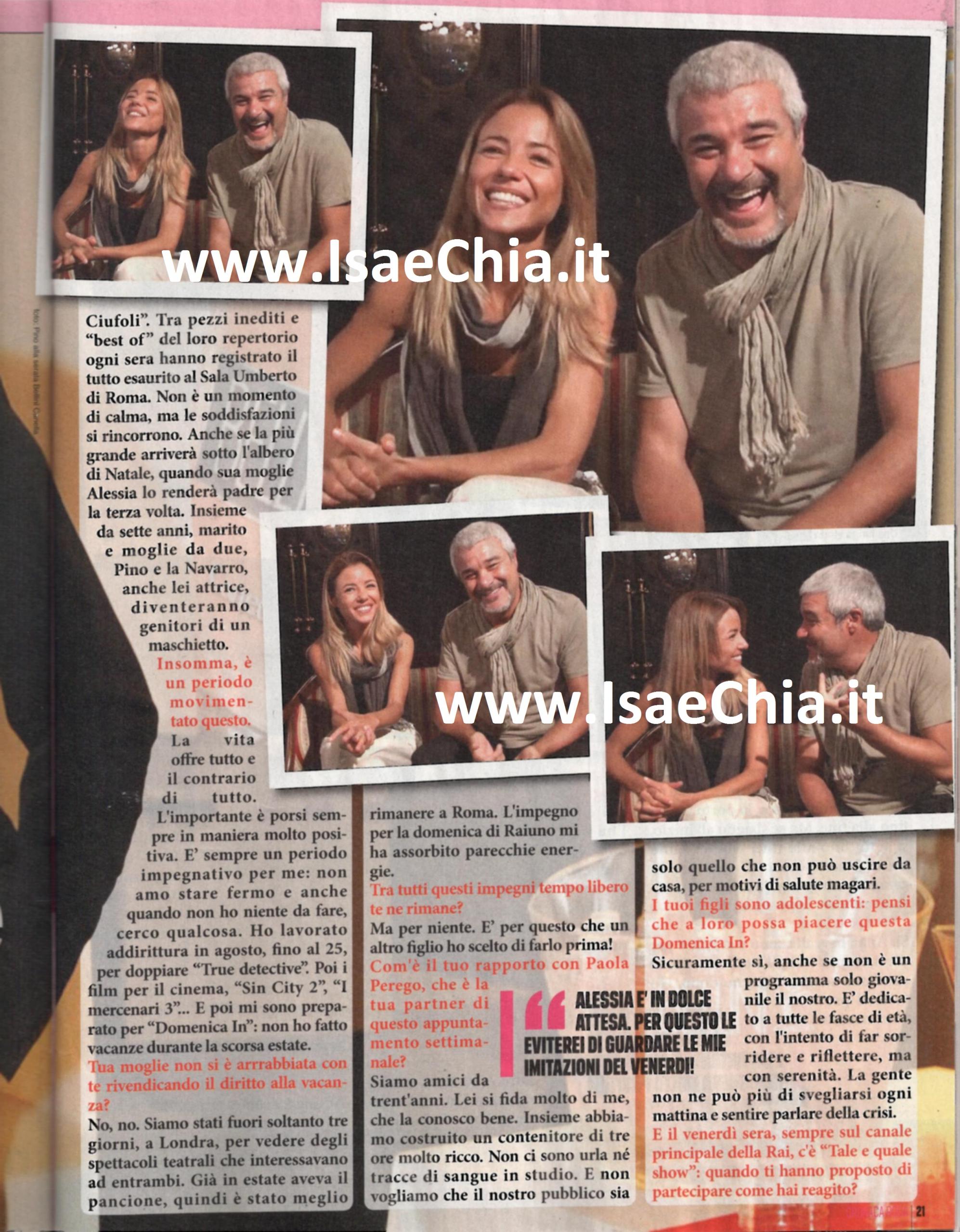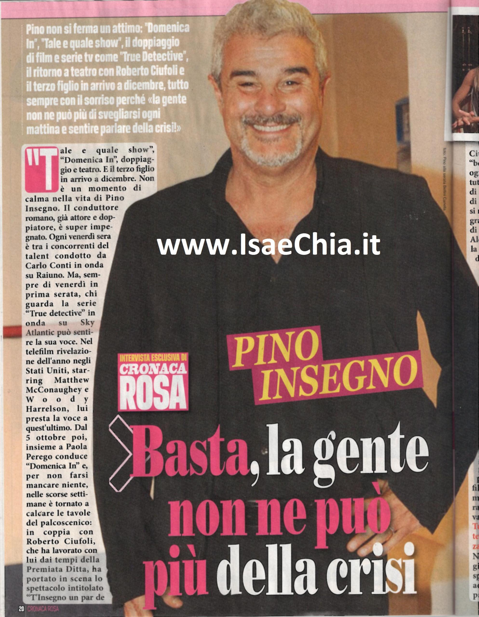 Si è classificato ultimo a Tale e quale show, ma è ogni settimana a Domenica in con Paola Perego ed è pronto a ripartire con il teatro e si prepara a diventare papà per la terza volta a dicembre: per Pino Insegno non è certo un periodo tranquillo! “La vita offre tutto il contrario di tutto. L’importante è porsi sempre in modo positivo. E’ un periodo impegnativo per me, non amo stare fermo e cerco sempre qualcosa da fare. Ho lavorato anche ad agosto, per doppiare i film True detective, Sin City e I mercenari. Io e mia moglie Alessia Navarro siamo stati solo tre giorni a Londra a guardare gli spettacoli teatrali che ci interessavano. Già in estate aveva il pancione, quindi è stato meglio rimanere a Roma”. Quando gli si chiede com’è il rapporto con la Perego, con cui conduce Domenica in, risponde: “Siamo amici da trent’anni. Lei si fida molto di me, che la conosco bene. Insieme abbiamo costruito un contenitore di tre ore molto ricco. Nel nostro studio non ci sono urla, né tracce di sangue: vogliamo che il pubblico che ci segue non sia composto solo da chi non può uscire di casa, magari per motivi di salute. Il nostro non è solo un programma giovanile, ma è adatto a tutte le fasce d’età. Ha l’intento di far sorridere e riflettere con serenità: la gente non ne può più di svegliarsi la mattina e sentir parlare di crisi”. Parlando invece del Tale e quale show, ha raccontato: “Quando Carlo Conti mi ha chiesto se volessi partecipare, ho pensato “E’ una follia, io faccio il doppiatore, l’attore, il presentatore, ma l’imitatore non l’ho mai fatto prima. Sono stato zitto dieci secondi e gli ho detto che ci saremmo sentiti il giorno dopo. Ho fatto il provino comunque. La mia ex moglie Roberta Lanfranchi ha partecipato prima di me, ma lei è una cantante, lo ha sempre saputo fare. Non le ho chiesto consigli, mi sono vissuto le sfide settimanali di volta in volta. I miei figli Francesco e Matteo me l’hanno sconsigliato, ma spero di non arrivare ultimo: l’ho promesso proprio a loro!”.