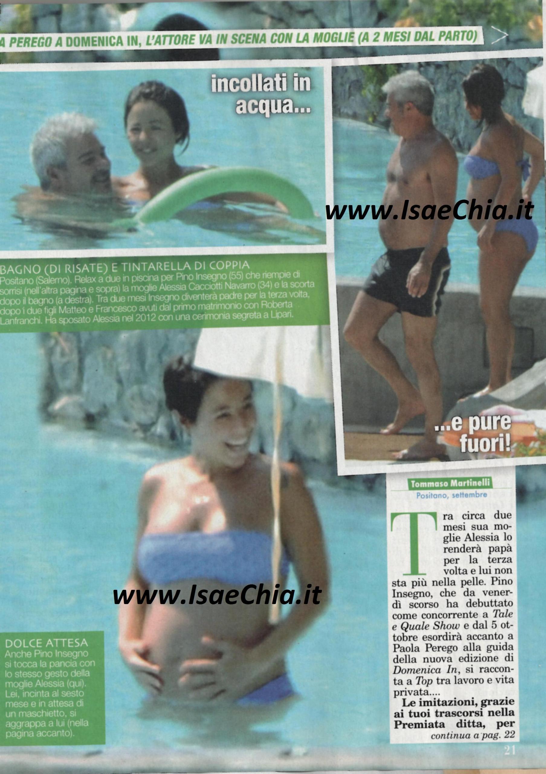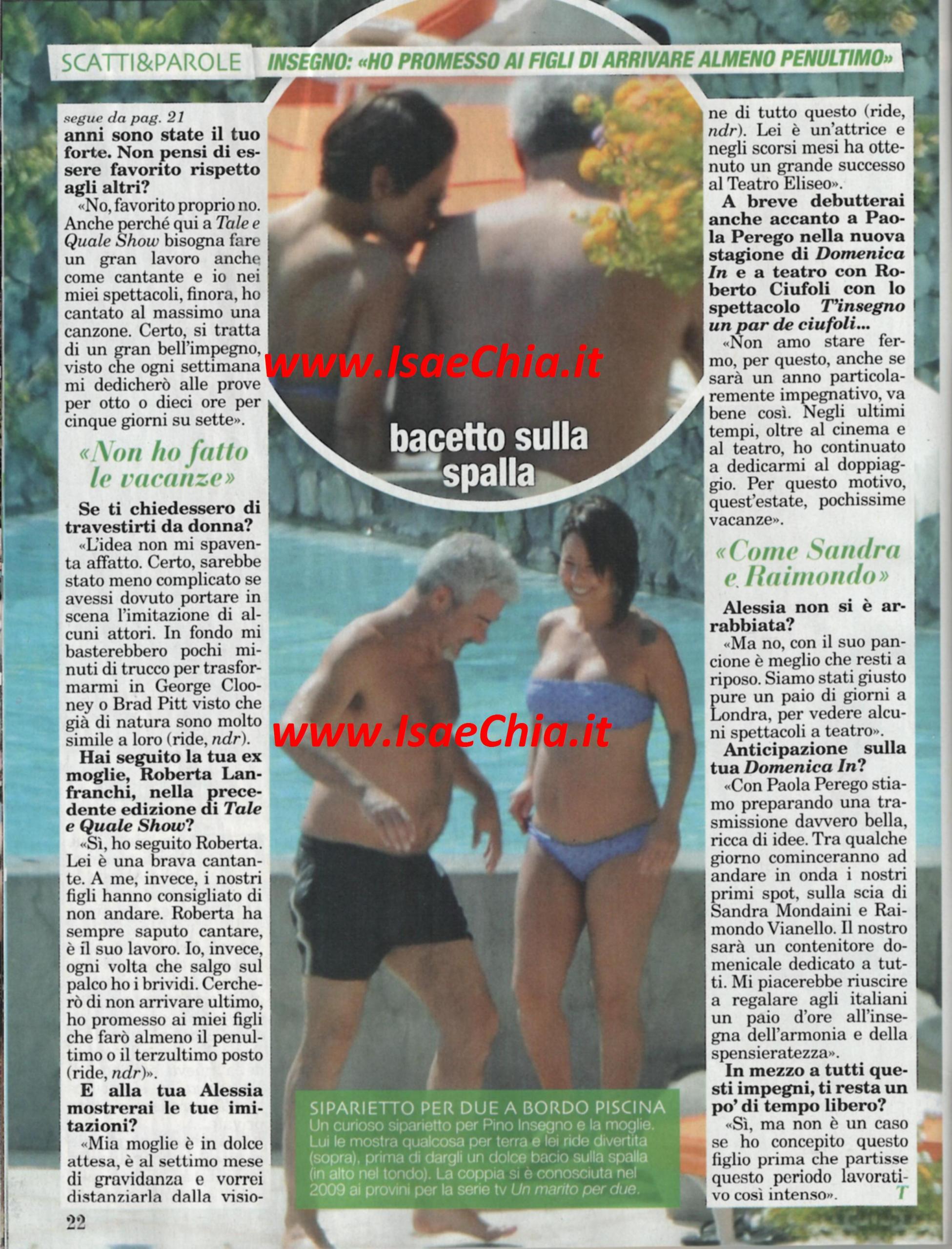 Tra circa due mesi sua moglie Alessia lo renderà papà per la terza volta e Pino Insegno non sta nella pelle. L’attore e showman al momento è impegnato come concorrente del Tale e quale show, nel quale imita le star, e sembrerebbe avvantaggiato dal suo passato come comico con la Premiata ditta: “No, non sono favorito. Qui bisogna fare tanto lavoro e io nei miei spettacoli ho cantato al massimo una canzone. Si tratta di un bell’impegno, che prende 8-10 ore cinque giorni su sette. L’idea di trasformarmi in donna? Non mi spaventa affatto!”. Quando gli si fa notare che anche la sua ex moglie, Roberta Lanfranchi, aveva partecipato al programma risponde: “L’ho seguita, è una brava cantante. A me, invece, i nostri figli avevano consigliato di non andare. Roberta ha sempre desiderato cantare, è il suo lavoro; io, invece, ogni volta che sono sul palco ho i brividi. Cercherò di non arrivare ultimo: ho promesso ai miei figli che mi classificherò almeno penultimo! Quanto alla mia attuale moglie Alessia, lei è un’attrice e ha avuto grande successo a teatro e vorrei distanziarla da tutto questo!”. Pino rivela poi i suoi altri progetti lavorativi: “Sarò a Domenica In con Paola Perego. Stiamo inventando una trasmissione davvero bella, ricca di idee. Poi tornerò a teatro con Roberto Ciufoli in T’insegno un par di ciufoli e mi sono dedicato al doppiaggio. È stato un anno impegnativo, ma va bene così. Non a caso, questo figlio l’ho concepito prima che partisse questo periodo lavorativo così intenso…”