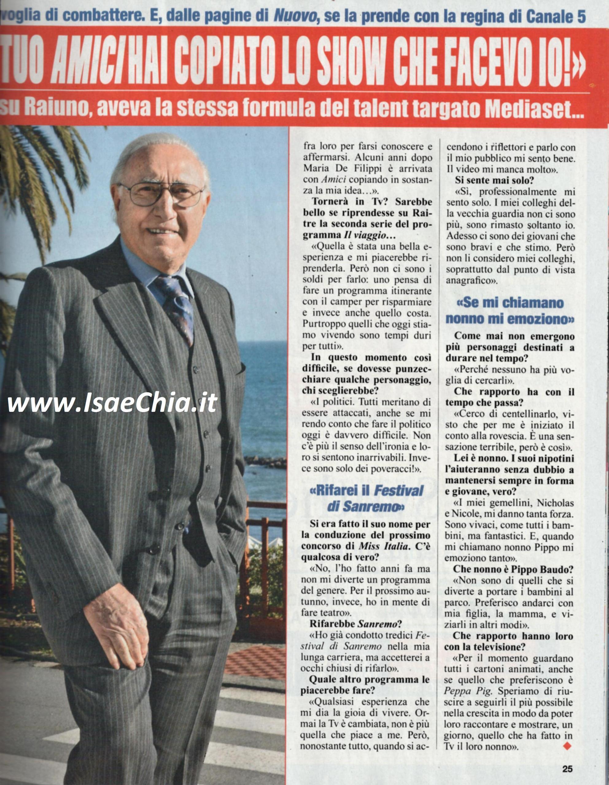Il conduttore più longevo della televisione italiana, Pippo Baudo, ha il sogno di tornare a condurre un programma tutto suo, ma nel frattempo è giudice nel programma di Carlo Conti Si può fare. Quando gli si chiede se nella sua lunga carriera gli sia mai capitato che un suo programma fosse imitato, risponde: “Assolutamente sì. Nel 1990 avevo portato un programma di grandissimo successo, Gran Premio. Le squadre in gara, che raccoglievano varie categorie di artisti come cantanti e ballerini, si sfidavano fra loro per farsi conoscere e affermarsi. Alcuni anni dopo è arrivato Amici, con cui Maria De Filippi ha copiato in sostanza la mia idea”. Varando invece i programmi del passato che ha condotto e la possibilità di un ritorno alla loro guida, racconta: “Il viaggio è stato una bella esperienza, ma non ci sono soldi per farlo; si sta pensando a una versione itinerante. Non tornerò a Miss Italia: l’ho fatto anni fa, ma non mi diverte un programma del genere. Ho condotto 13 Festival di Sanremo, ma accetterei ad occhi chiusi di farlo ancora. Per l’autunno ho in mente di fare teatro, ormai la tv è cambiata, non è più quella che piace a me, ma nonostante tutto quando sento il pubblico mi sento bene. Professionalmente sono solo: i miei colleghi della vecchia guardia non ci sono più, ma ci sono dei giovani che stimo”. Infine, parla del suo ruolo di nonno: “I miei gemellini Nicholas e Nicole mi danno tanta forza, sono vivaci e quando mi chiamano nonno Pippo mi emoziono tanto. In tv loro guardano i cartoni animati, ma spero di poterli seguire più a lungo possibile nella crescita per mostrar loro quello che il loro nonno ha fatto in tv”.