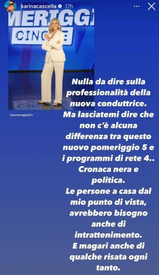 I commenti a proposito del suo operato sono stati molteplici e differenti. Da una parte c’è chi ha sentito nostalgia di quel tocco di leggerezza che la D’Urso riusciva a dare col suo savoir-faire. Altri hanno apprezzato il tocco professionale e pacato della nuova arrivata. Ad esprimersi, anche, sulla questione, una delle opinioniste storiche di Barbara, Karina Cascella. L’ex volto di Uomini e Donne non ha gradito la nuova piega che ha preso Pomeriggio 5, accusando la mancanza di leggerezza e l’eccessiva serietà della padrona di casa: