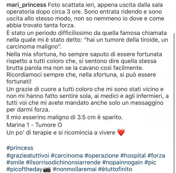 Alla ragazza, arrivata terza con il secchione Dario Massa nel programma condotto da Paolo Ruffini, è stato diagnosticato un carcinoma maligno alla tiroide, ma la prima operazione sembra essere andata bene e su Instagram la giovane, piena di vita ed entusiasmo, ha condiviso una foto dopo l’intervento ed ha raccontato: “Foto scattata ieri, appena uscita dalla sala operatoria dopo circa 3 ore. Sono entrata ridendo e sono uscita allo stesso modo, non so nemmeno io dove e come abbia trovato tanta forza. È stato un periodo difficilissimo da quella famosa chiamata nella quale mi è stato detto: ‘Hai un tumore della tiroide, un carcinoma maligno’!”. E ancora ha proseguito: “Nella mia sfortuna, ho sempre saputo di essere fortunata rispetto a tutti coloro che, si sentono dire quella stessa brutta parola ma non se la cavano così facilmente. Ricordiamoci sempre che, nella sfortuna, si può essere fortunati! Un grazie di cuore a tutti coloro che mi sono stati vicino e non mi hanno fatto sentire sola, ai medici e agli infermieri, a tutti voi che mi avete mandato anche solo un messaggino per darmi forza. Il mio esserino maligno di 3.5 cm è sparito. Marina 1 – Tumore O. Un po’ di terapie e si ricomincia a vivere!”.