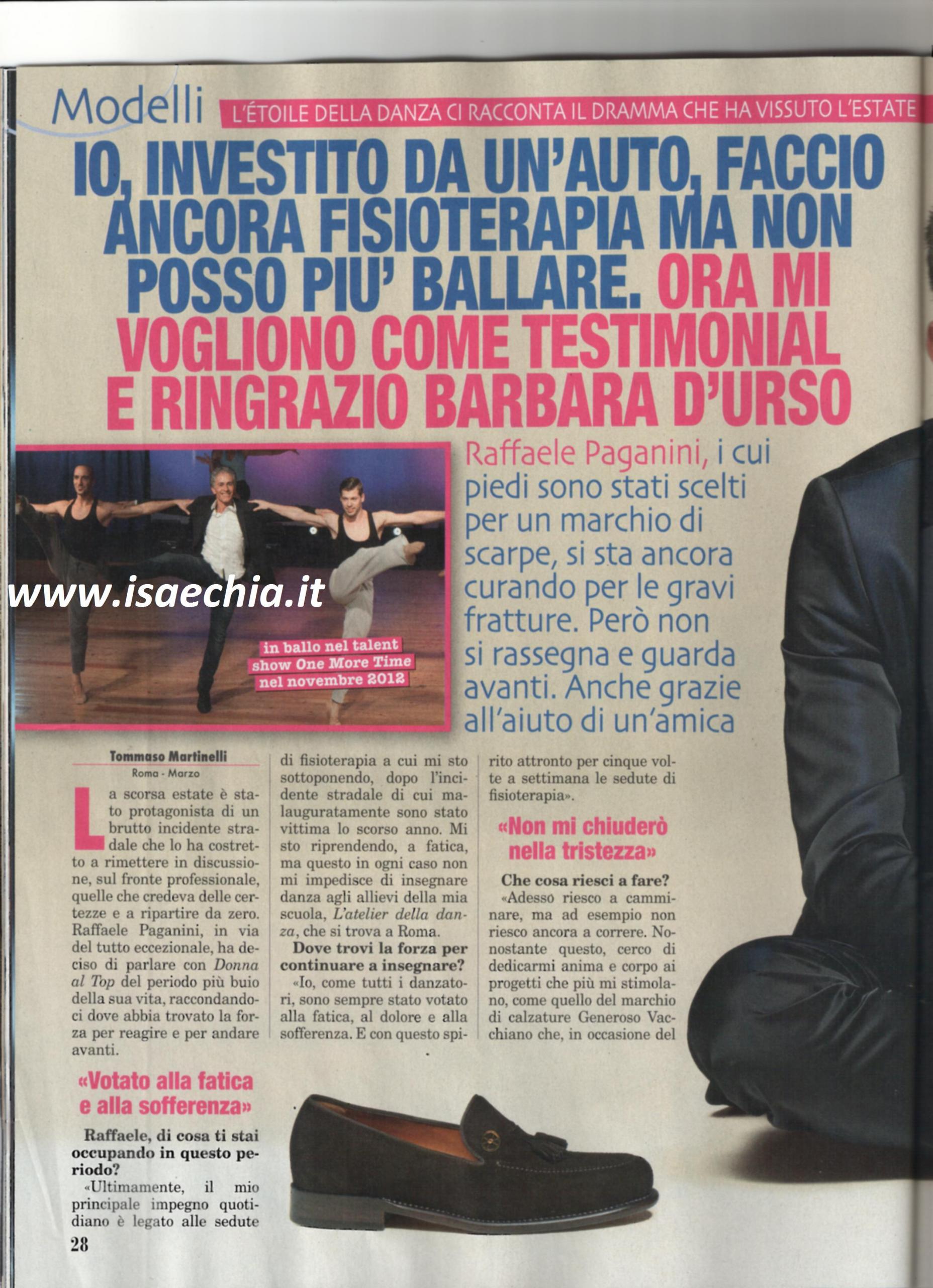 Il ballerino e coreografo Raffaele Paganini, spesso ospite ad Amici, ha rivelato: “Il mio principale impegno, adesso, è rappresentato dalle sedute di fisioterapie a cui mi sto sottoponendo dopo l’incidente stradale di cui sono stato vittima lo scorso anno. Mi sto riprendendo a fatica, ma ciò non m’impedisce di insegnare danza nella mia scuola di Roma. Come tutti i danzatori, sono votato al dolore e alla sofferenza e con questo spirito torno 5 volte la settimana a fare fisioterapia. Ora riesco a camminare, ama non a correre. Cerco di dedicarmi ai progetti che più mi stimolano, come quello del marchio Generoso Vacchiano, che, in occasione del lancio della sua linea da uomo, ha scelto me come testimonial. Non mi chiuderò mai nella stanza a piangere pensando al fatto di esser stato investito: è fondamentale andare avanti. Dopo l’incidente avevo tutte le ossa frantumate: mi hanno somministrato morfina per due mesi e del primo mese ho solo ricordi confusi. E pensare che fino a poco prima, i ragazzi di 20-30 anni mi facevano i complimenti per il mio fisico sempre in forma! Il mio corpo era il mio strumento di lavoro e facevo di tutto per perfezionarlo”. Quando gli si chiede chi gli è stato vicino, risponde: “Non dimenticherò mai il sostegno che mi ha dato la mia amica Barbara D’Urso. E’ una gran signora, sia a livello personale che professionale. Subito dopo aver saputo dell’incidente, mi ha contattato per darmi il suo incoraggiamento. Mia moglie rispondeva al cellulare e mi riferiva tutte le sue belle parole. Il fatto che un uomo abbia messo fine alla mia carriera da ballerino non mi impedisce di dedicarmi a nuovi progetti: ho particolarmente a cuore la coreografia; so che è molto impegnativo, ma io mi impegnerò”.