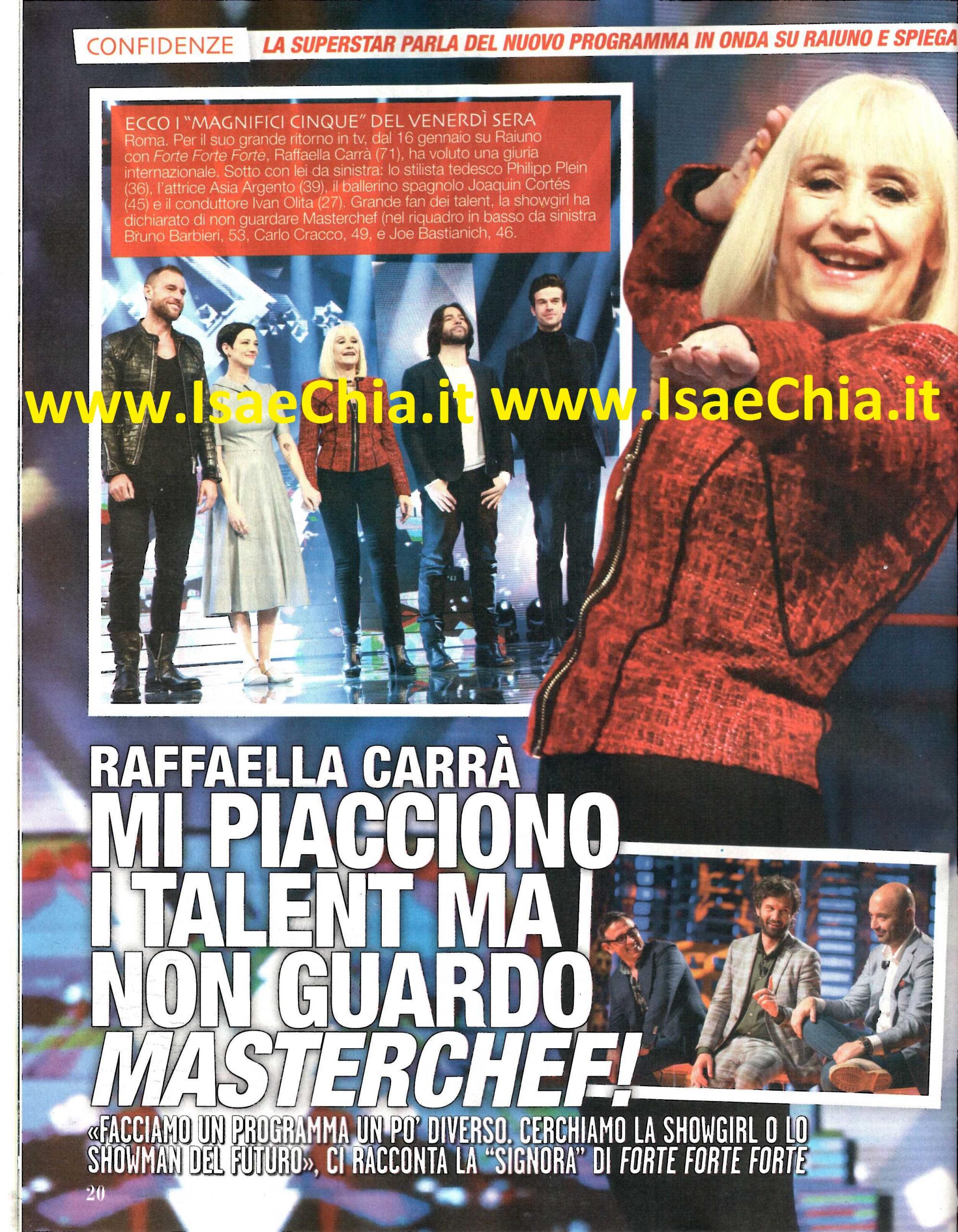 Lo scorso venerdì è partito il nuovo talent show di Raffaella Carrà, Forte forte forte, che ha come giurati, insieme alla diva nostrana, l’attrice Asia Argento, il ballerino Joaquin Cortés e lo stilista e imprenditore Philipp Plein e un giovane conduttore, Ivan Olita. Intervistata, il caschetto biondo della tv italiana ha raccontato: “Abbiamo cercato di creare un talent diverso da quelli che si vedono ogni giorno in tv. E’ una trasmissione un po’ diversa perché cerchiamo showgirl e showmen che siano comunque già preparati. Si tratta di talenti non alle prime armi, ma che hanno già esperienze alle spalle. L’idea risale a qualche anno fa, ci avevo messo una pietra sopra. Poi, però, la sua forza e la volontà di Bibi Ballandi e Raiuno si sono concretizzate, improvvisamente, quest’estate. Probabilmente, il destino ha voluto che prima sperimentassi un talent, cioè The Voice of Italy, dandomi così una visione più completa. I talent sono tutti interessanti. Non ho visto molto Masterchef per paura di ingrassare! La loro funzione è importantissima: senza essi, i giovani non avrebbero modo di uscire. Ricordo quando vidi The Voice in Spagna e pensai che se lo avessero proposto a me, avrei accettato di corsa. X Factor, invece, mi sembrava un po’ troppo duro. Ironia della sorte, cinque giorni dopo, in Italia mi viene proposto The Voice. Non cerchiamo né il nuovo Fiorello, né la nuova Carrà. La personalità a volte è più importante; bisogna andare nell’anima delle persone. Cerchiamo qualcuno capace di muoversi in tv, ma anche di fare un concerto o un album, come Shakira e Justin Timberlake“. A proposito dei nuovi giurati di The Voice, che saranno Roby e Francesco Facchinetti, scherza: “Avranno allargato la mia poltrona! Noemi ora sarà la regina di The Voice“. Invece, circa le polemiche con Lorella Cuccarini, che era stata inizialmente contattata per fare da giurata di Forte Forte Forte, la Carrà dichiara: “Vorrei che questo episodio non diventasse un gossip. Non l’ho chiamata per dirle che gli autori avevano preso una decisione diversa: una giuria italiana sì, ma aperta anche all’estero, con persone nuove. Per una telefonata mancata, non la farei tanto lunga. In ogni caso, Lorella non ha bisogno di fare il mio programma. E’ una signora professionista, una numero 1, che può fare un suo programma. Le ho scritto le mie scuse pubblicamente, ma lei, non rispondendo, evidentemente non le ha accettate. Punto e basta”. Infine, Raffa conclude parlando di Asia Argento, che finora ha destato più curiosità: “Quando l’ho incontrata, mi sono emozionata e a lei è successo lo stesso. E’ una donna profondamente spirituale, ci siamo lette vicendevolmente. Pensavo che non avrebbe mai accettato, invece è nata una collaborazione. Ciò che non deve mai fare un giovane artista? Chiedere un applauso. E incamerare la paura e trasformarla in coraggio“.