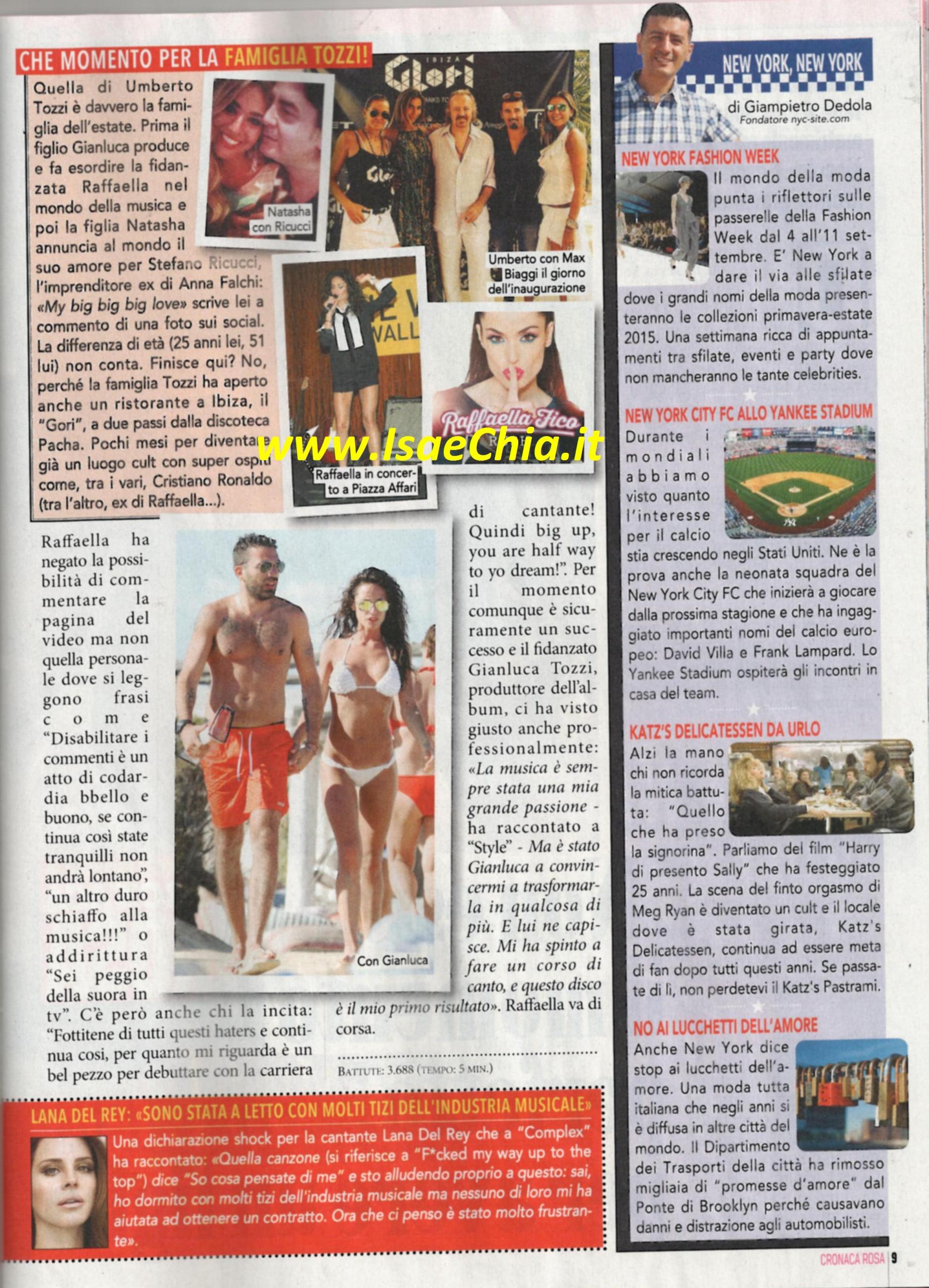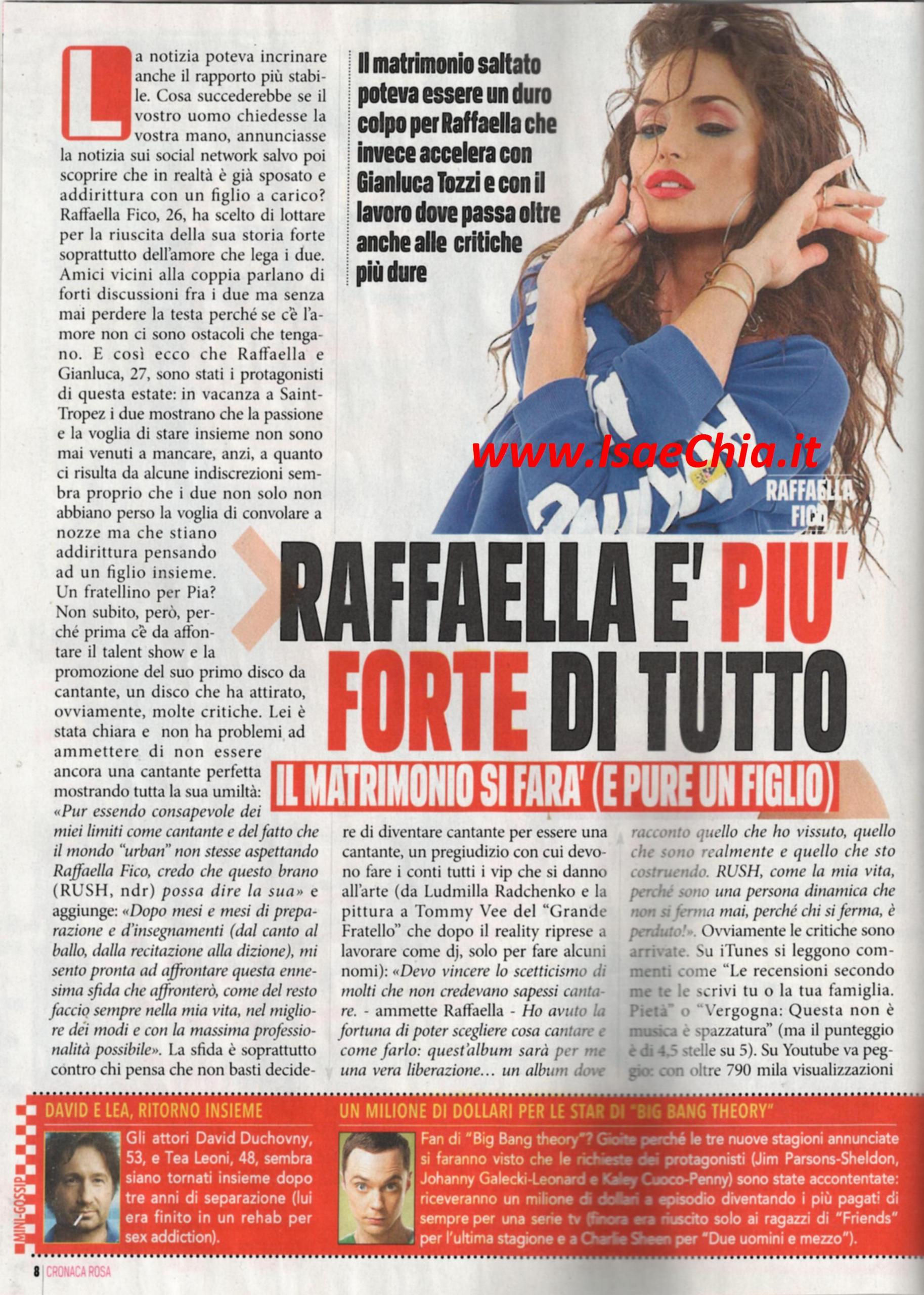 Cosa succederebbe se un uomo chiedesse la vostra mano, annunciasse la notizia sui social network, e poi si scopre che è già sposato e con figlio a carico? E’ questa la storia di Raffaella Fico, showgirl lanciata dal Grande fratello. Eppure, tra lei e il fidanzato Gianluca Tozzi, figlio del cantante Umberto, tutto pare andare anche meglio di prima: i due sono stati fotografati in vacanza insieme e non vedono l’ora di unirsi in matrimonio. Secondo alcuni, addirittura, non vedrebbero l’ora di dare un fratellino alla piccola Pia, che Raffaella ha avuto dal calciatore Mario Balotelli. Ma non subito: la Fico, infatti, si prepara a partecipare al Tale e quale show e nel frattempo promuove il suo disco, anticipato dal singolo Rush: “Pur essendo consapevole dei miei limiti come cantante e del fatto che il mondo “urban” non stesse aspettando Raffaella Fico, credo che questo brano possa dire la sua. Dopo mesi di preparazione, di danza, canto, recitazione e dizione, mi sento pronta ad affrontare quest’ennesima sfida che affronterò con la massima professionalità possibile. Devo vincere lo scetticismo di molti che non credevano che potessi cantare. Quest’album sarà una vera liberazione. Racconto ciò che ho vissuto, quello che sono realmente e ciò che sto costruendo. Rush vuol dire “di fretta” come la mia vita, perché sono una persona dinamica, che non si ferma mai”. Le recensioni l’hanno stroncata (su Youtube c’è chi ha scritto “Un altro schiaffo alla musica” o “Peggio della suora in tv”), ma lei non si arrende. “La musica è sempre stata una mia passione, ma è stato Gianluca a trasformarla in qualcosa di più: lui ne capisce e mi ha spinto a fare un corso di canto. Questo è il mio primo risultato”.