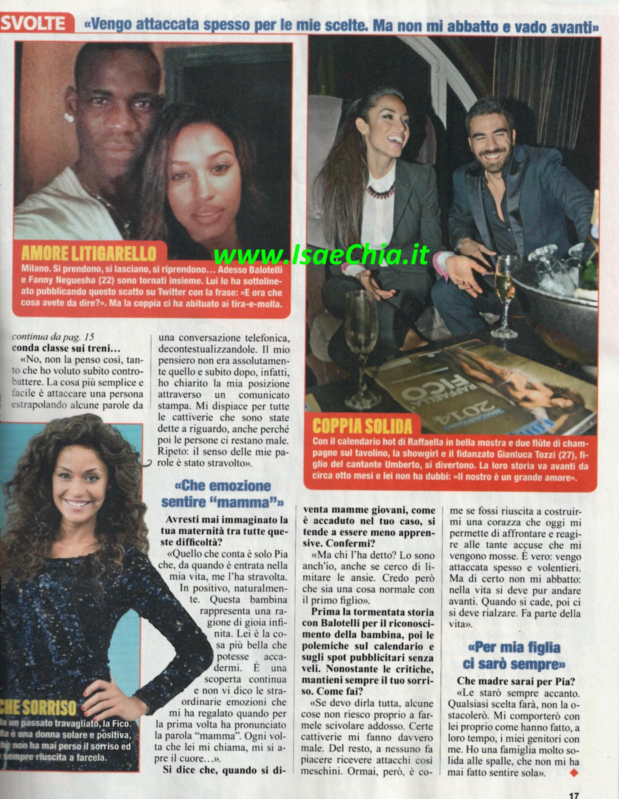 Negli scorsi giorni, dopo 17 mesi dalla nascita della figlia Pia, il calciatore Mario Balotelli l’ha finalmente incontrata (QUI l’articolo in cui ne abbiamo parlato). Adesso la mamma di Pia, la gieffina Raffaella Fico, commenta: “Mario si è preso i suoi tempi e ha capito lui quando sarebbe stato il momento giusto. Per quel poco che lo conosco, sono convinta che sarà un bravo papà. Adesso posso dire di essere una donna felice perché Pia ha un papà, come è giusto che sia. Io sono sempre stata positiva e non ho mai perso il sorriso. Tutto quello che ho fatto è stato per il bene di mia figlia. Tra me e lui le cose sono rimaste le stesse, non ci sono novità. Io sono la mamma, lui il papà e prenderemo le decisioni insieme. L’obiettivo è lo stesso: far star bene nostra figlia”. Circa le sue dichiarazioni, ossia che non avrebbe voluto che sua figlia viaggiasse in seconda classe, specifica: “Non la penso così, tanto che ho voluto subito controbattere. E’ facile attaccare una persona estrapolando le parole dal contesto. Mi dispiace per tutte le cattiverie dette a riguardo, anche perché poi le persone ci restano male. Alcune cose non riesco a farmele scivolare addosso, certe cattiverie mi fanno davvero male. Ormai, però, è come se fossi riuscita a costruirmi una corazza e non mi abbatto: nella vita bisogna andare avanti”. Infine, parla del suo ruolo di mamma: “Ci sarò sempre per lei, non la ostacolerò nelle sue scelte, come ha fatto la mia famiglia. Lei mi ha stravolto la vita, è la cosa più bella che potesse capitarmi. Chi l’ha detto che le mamme giovani sono meno apprensive? Lo sono anch’io, ma provo a limitare le mie ansie: credo sia normale con il primo figlio”.